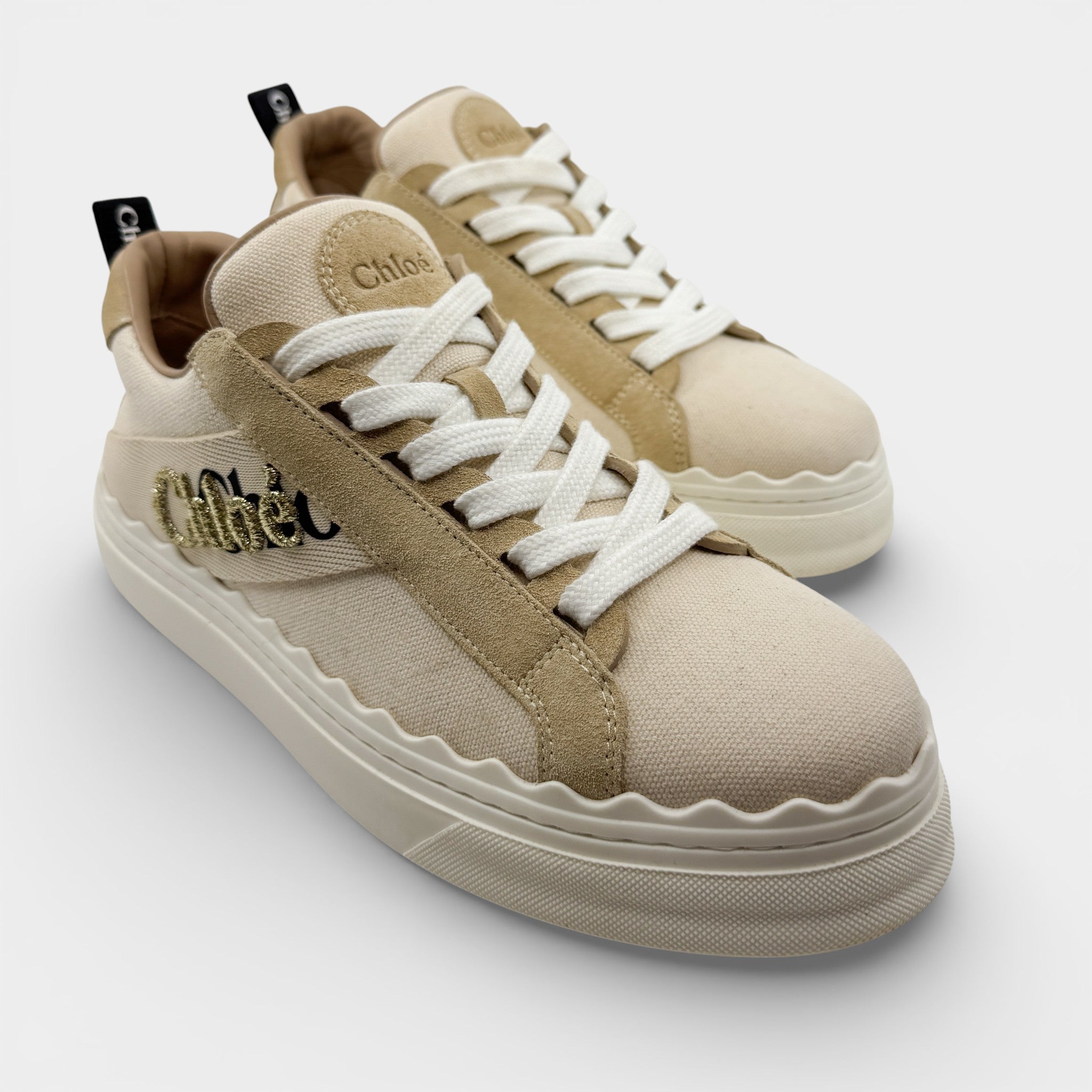 Chloe Cream Beige Canvas Suede Lauren Low-Top Sneakers EU39 ~ AU8