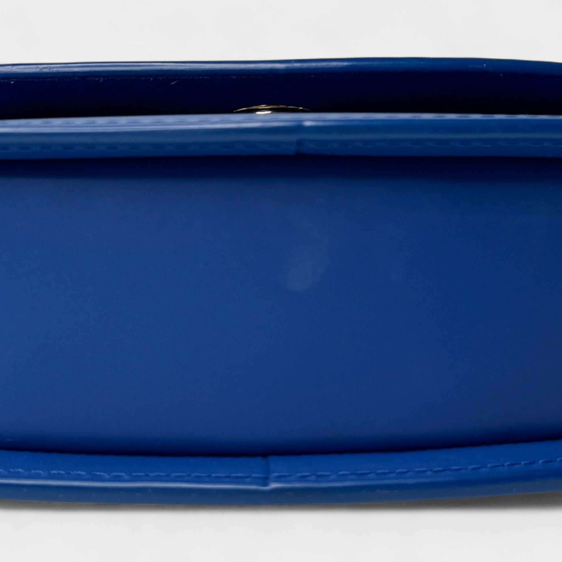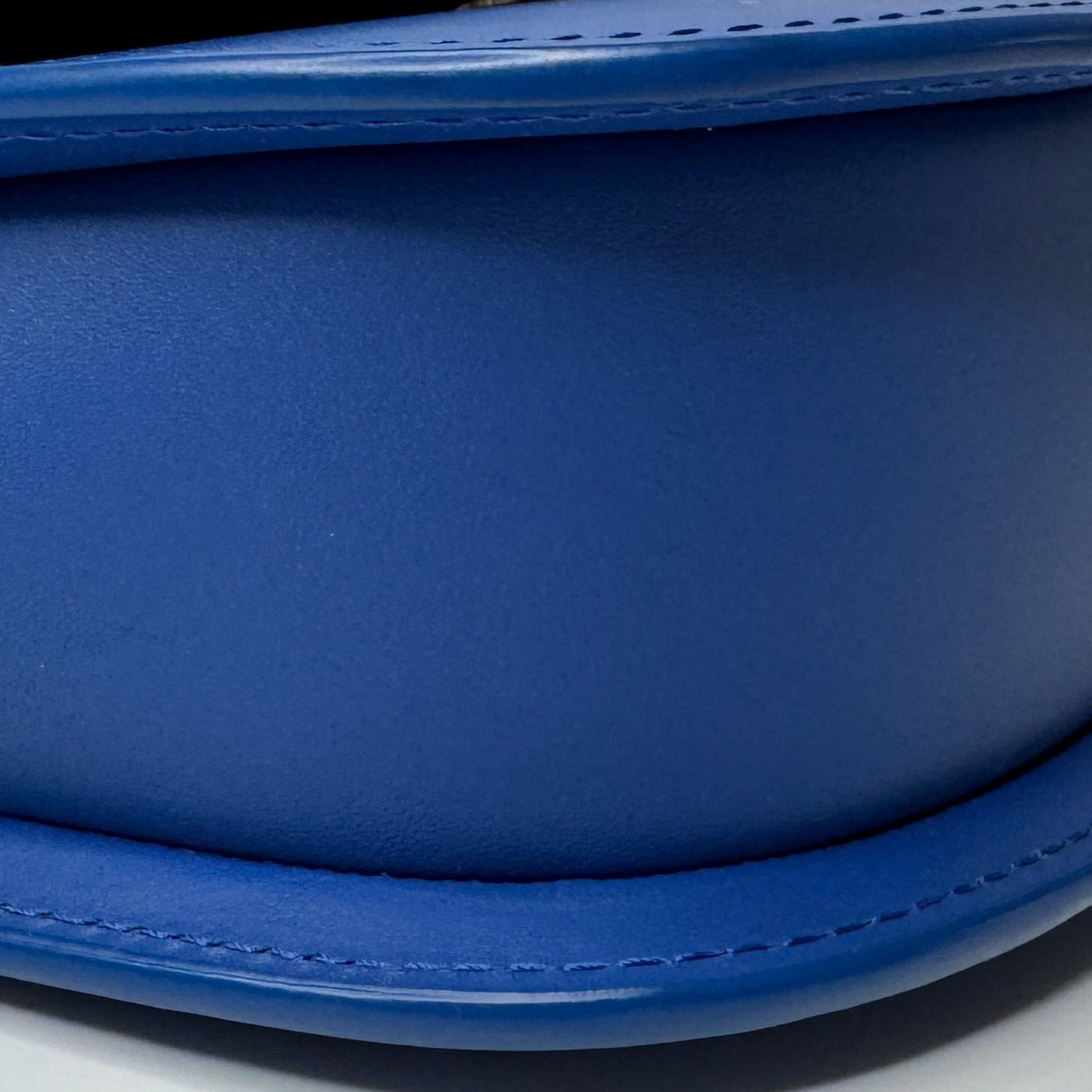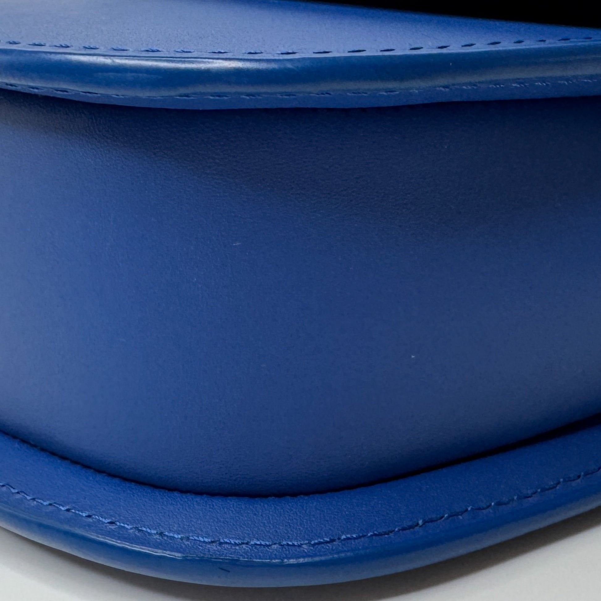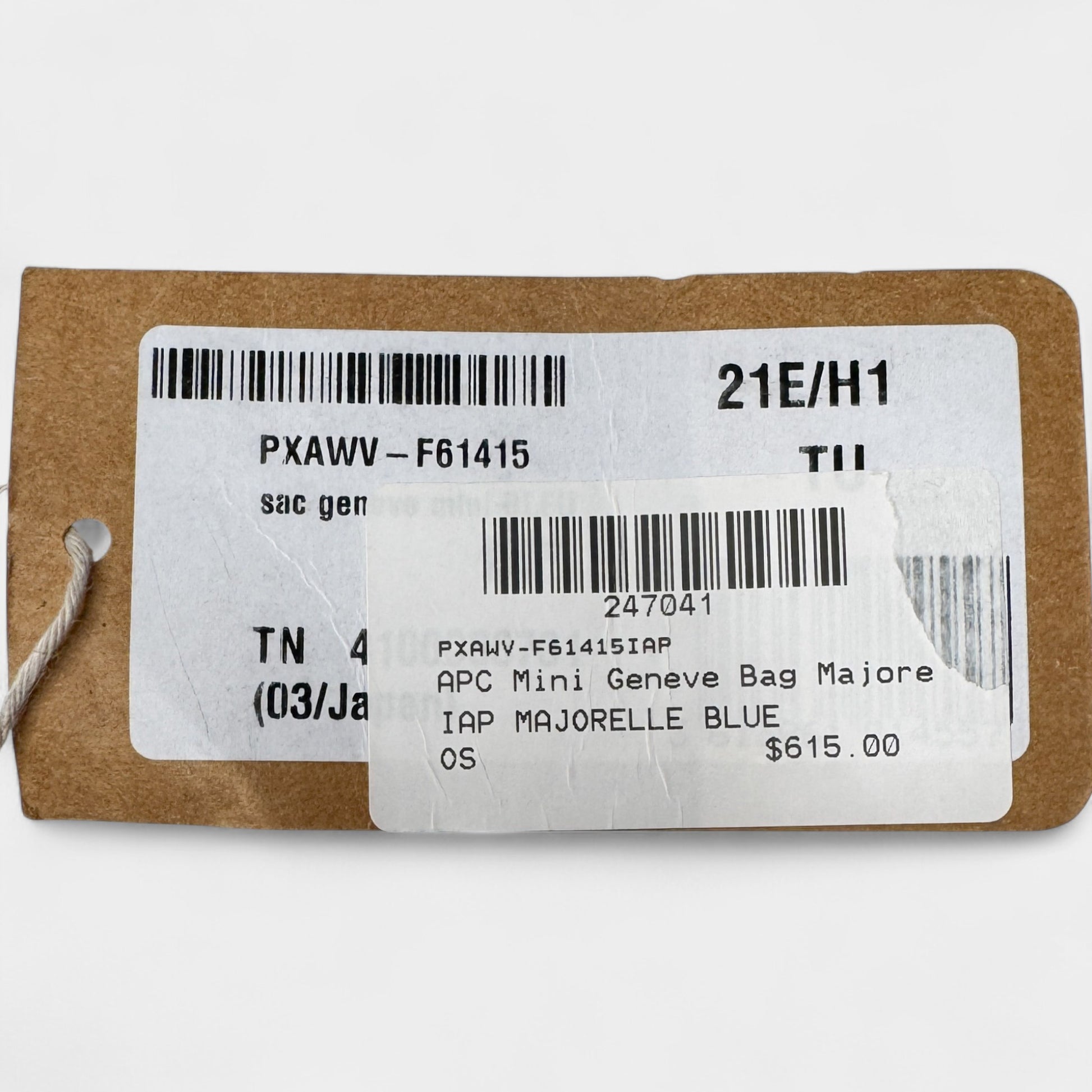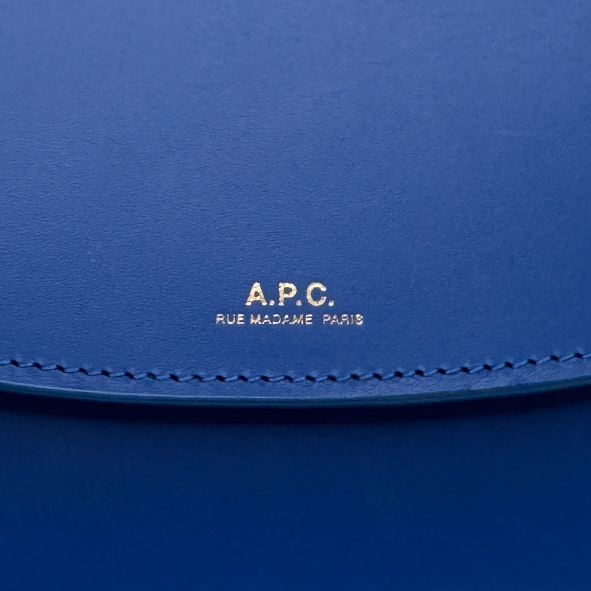 Details: A.P.C. Genève Mini Bag in electric blue leather with an elegant inverted Demi-Lune silhouette. Features an adjustable shoulder strap for crossbody or shoulder wear and an embossed gold-tone “A.P.C. Rue Madame Paris” logo at the front. Includes a spacious main compartment and interior slip pocket. Comes with dust bag.