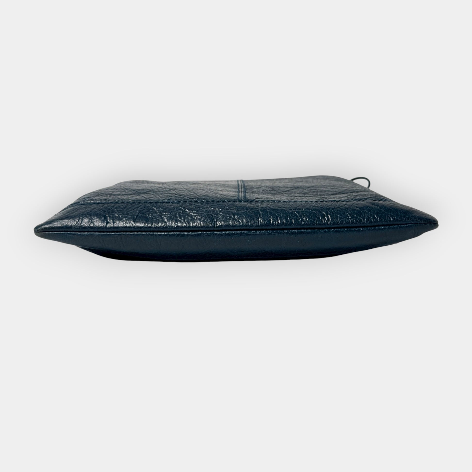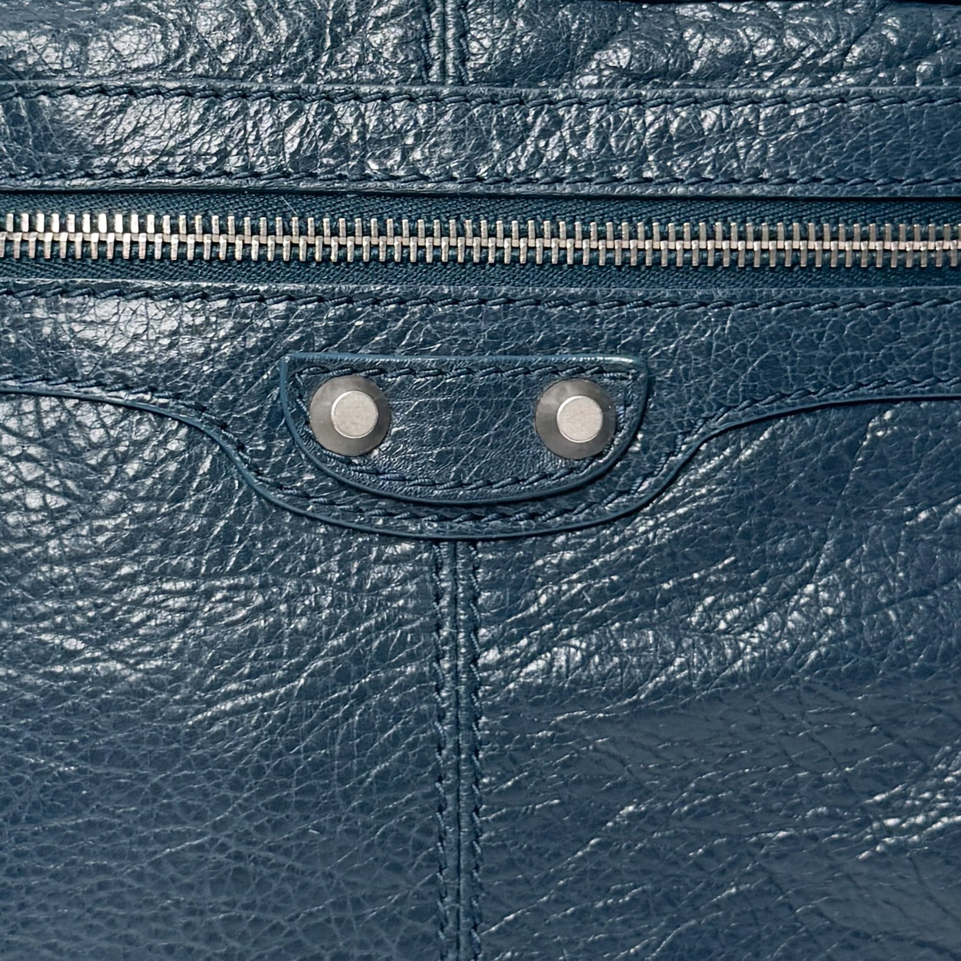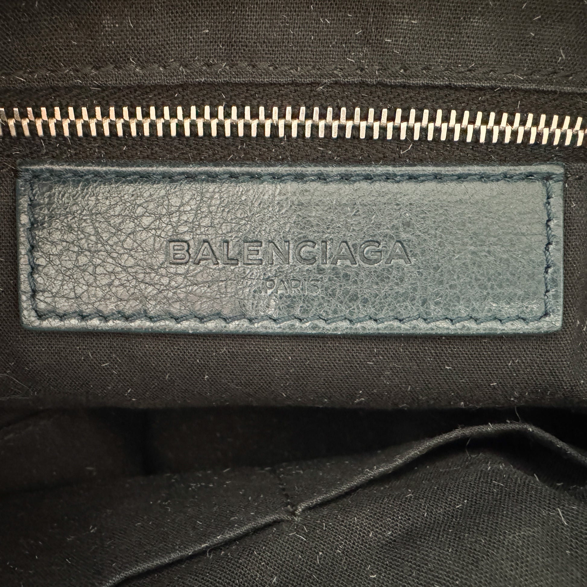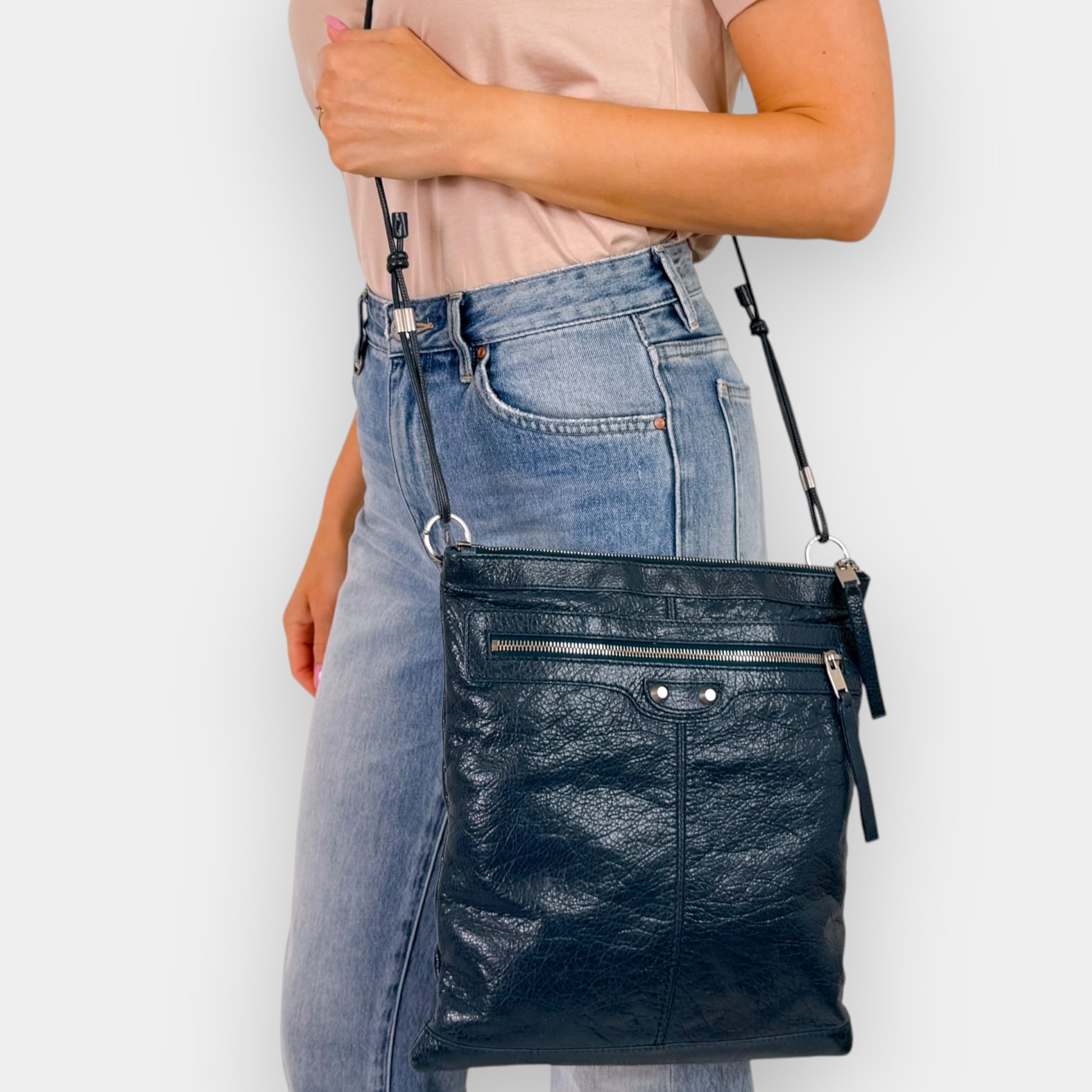 Details: Balenciaga RH Day messenger bag in dark teal crinkled leather with matte silver-tone hardware. Features a front zip pocket, top zip closure, and adjustable crossbody strap up to 60 cm drop. Interior includes textile lining, one zip pocket, and two slip pockets. Comes with dust bag and Entrupy authentication certificate.