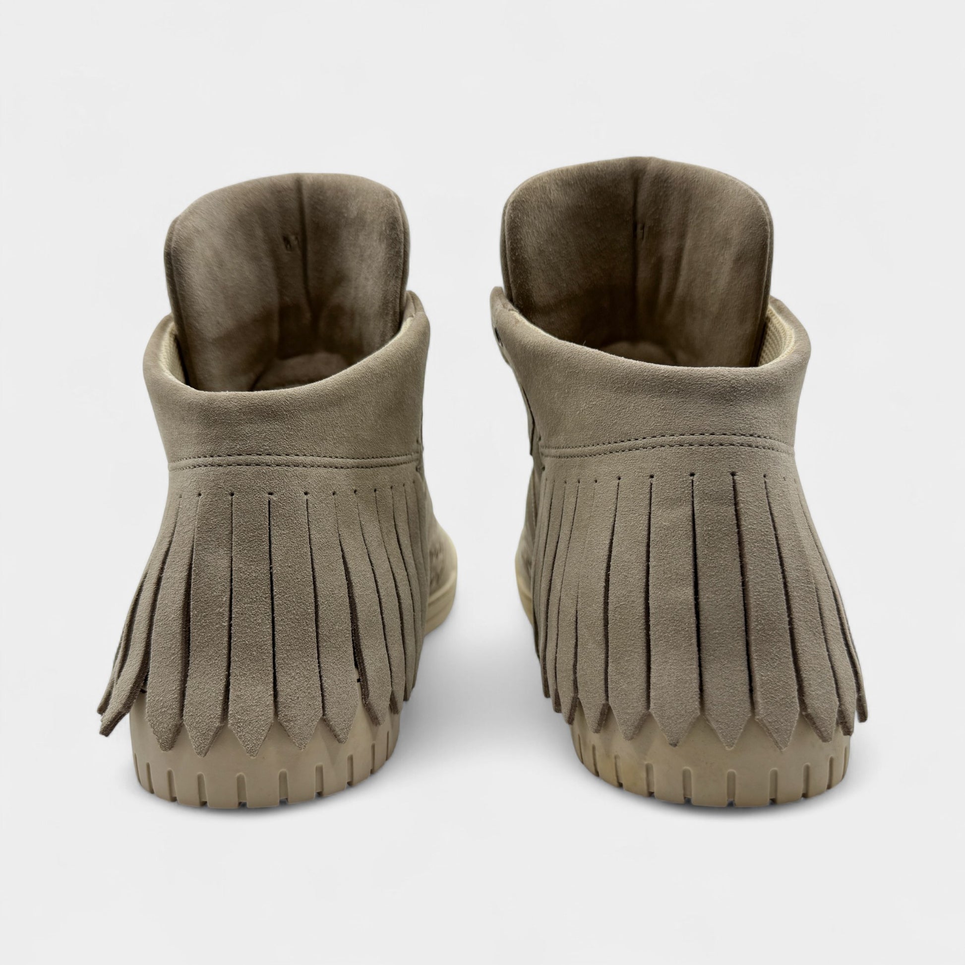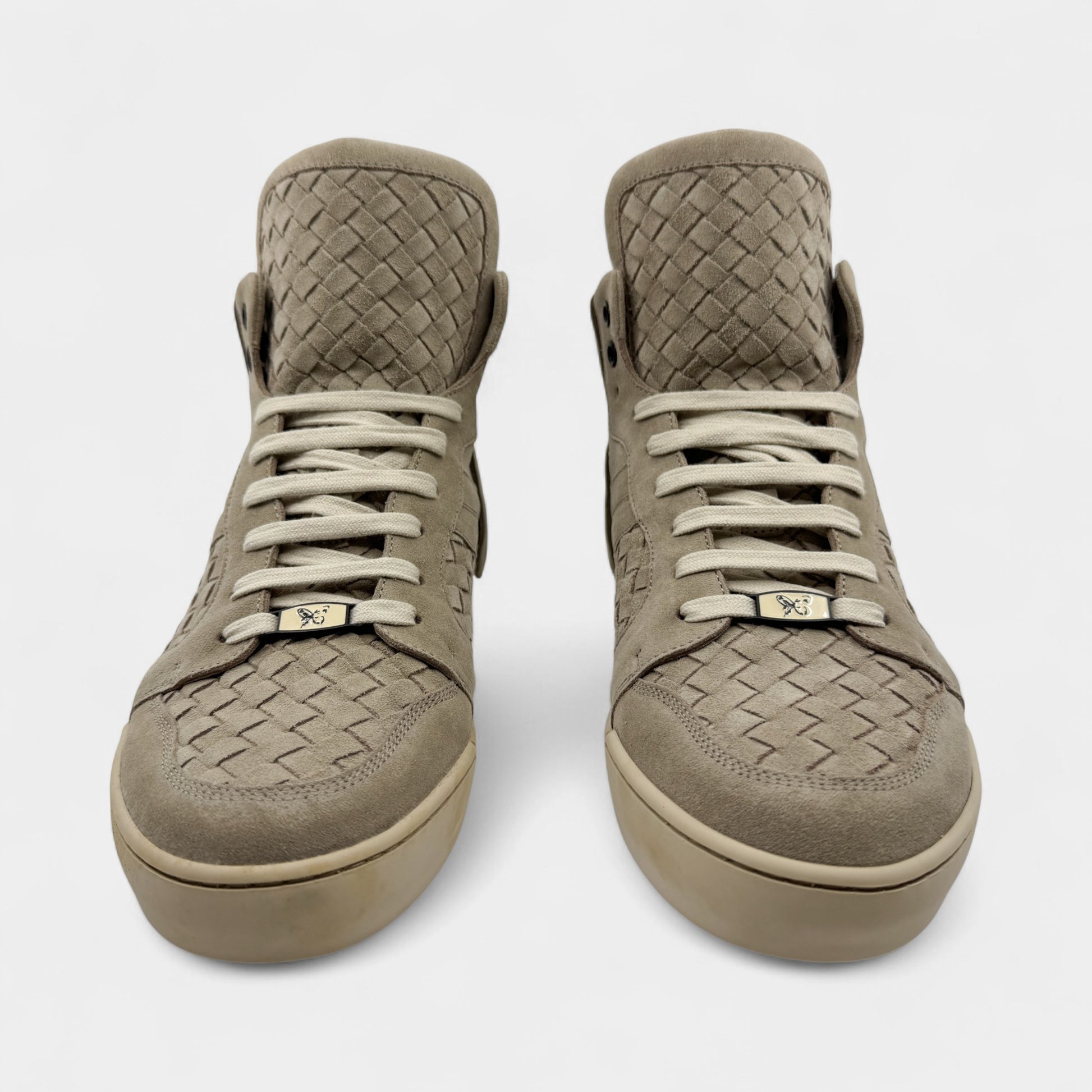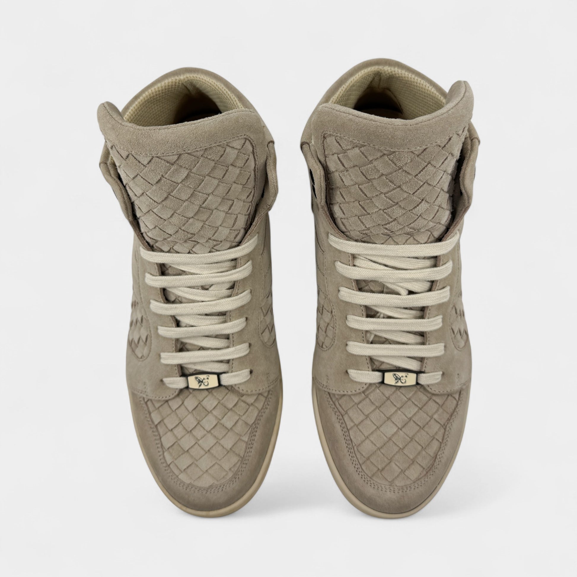 Details: Bottega Veneta Intrecciato high-top sneakers in warm beige. Featuring ultra soft suede and fringe detailing.