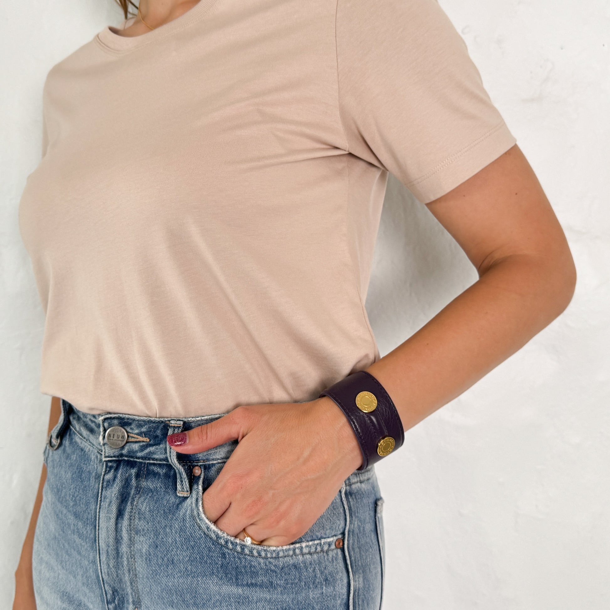Details: Bvlgari Italy wide cuff bracelet crafted in deep purple leather with gold-tone brass disc hardware featuring engraved Bvlgari branding. A bold, sculptural design with classic Italian luxury detailing. Made in Italy.