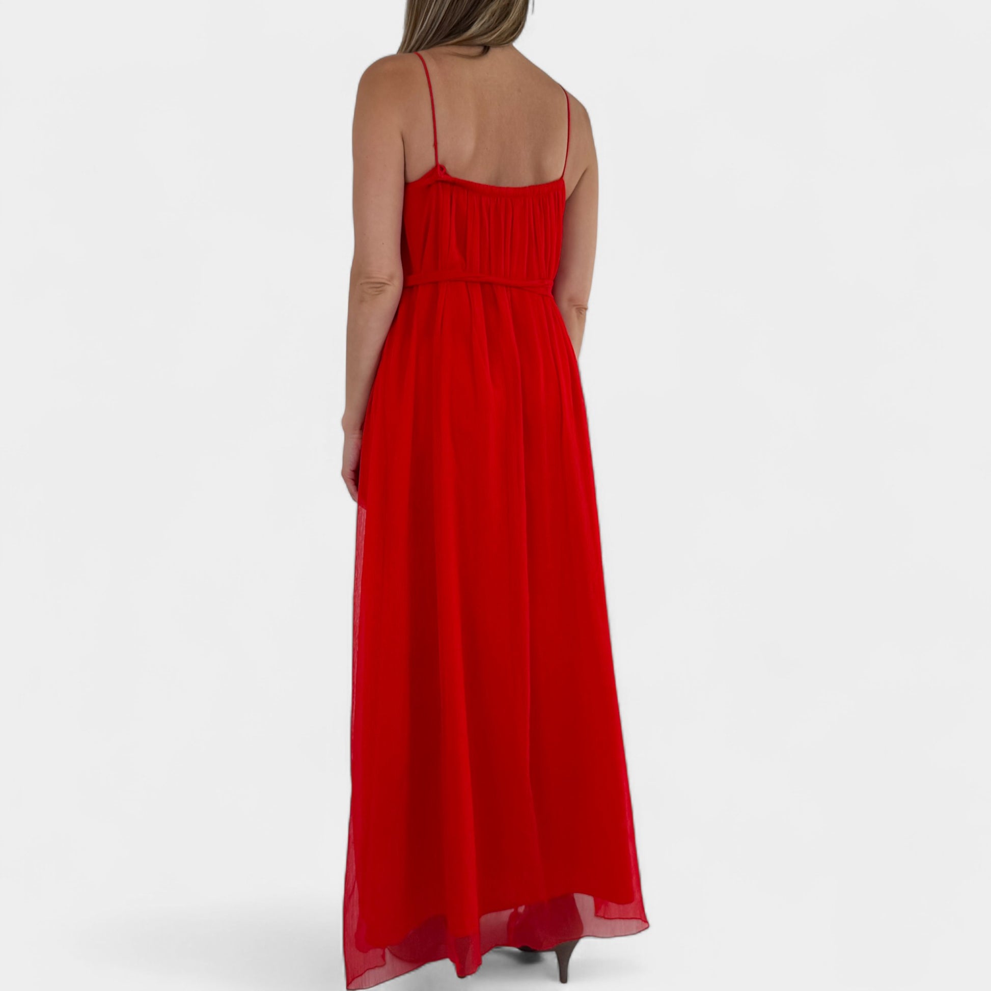 Details: This elegantly flowing dress features a plunging V-neckline and delicate thin straps. It is complemented by a matching self-tie belt for a tailored fit.