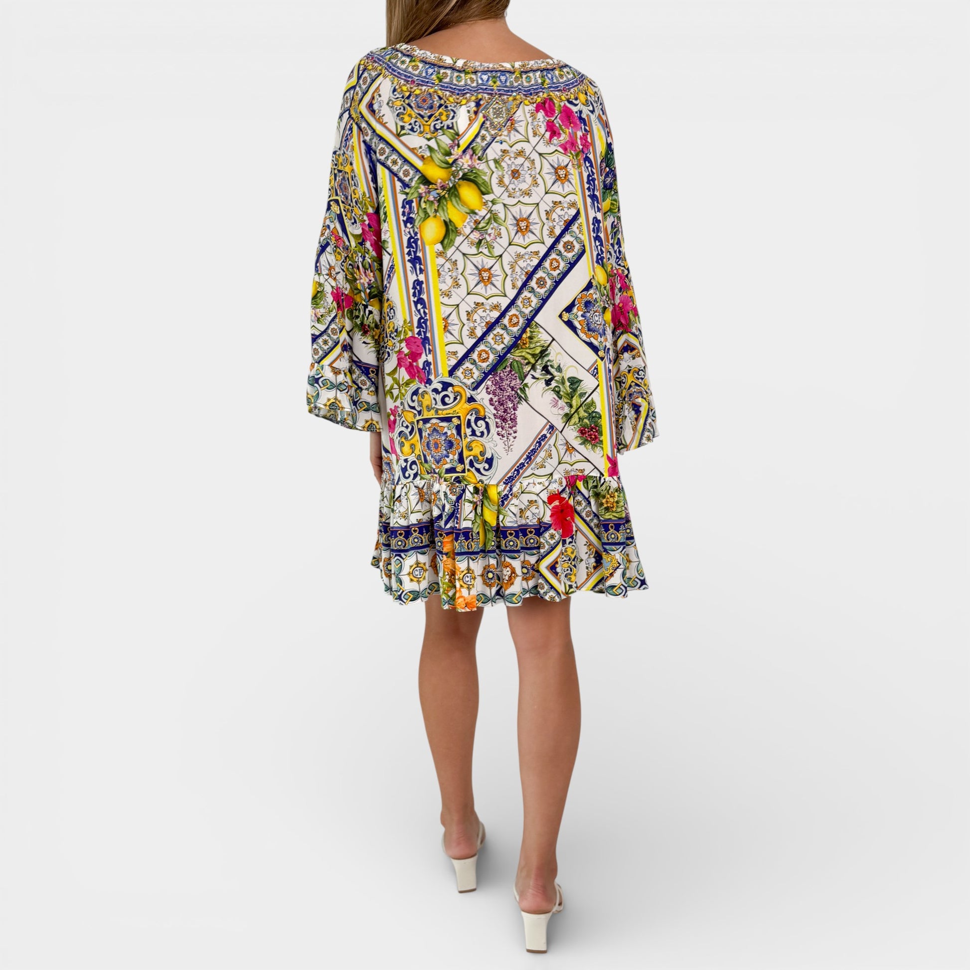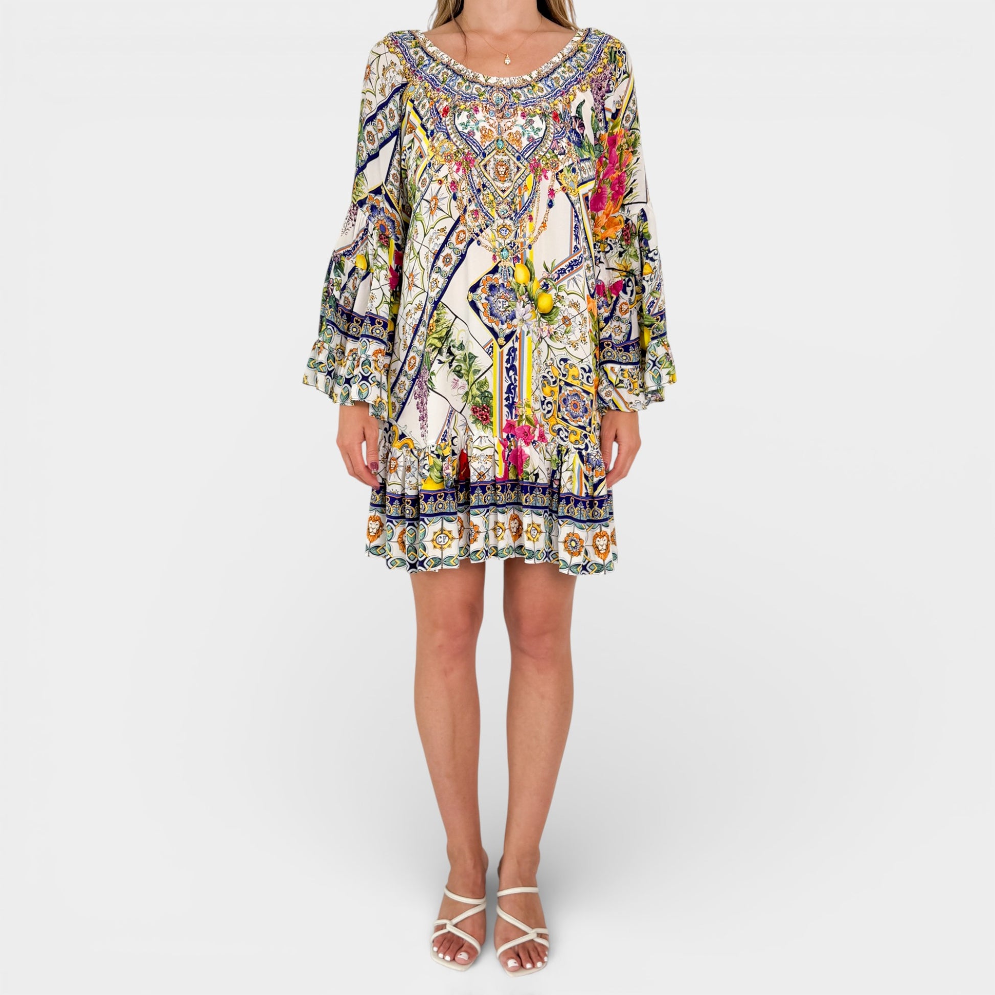 Details & Composition: Stunning silk embellished short, frill sleeved dress from Camilla. Made in India.