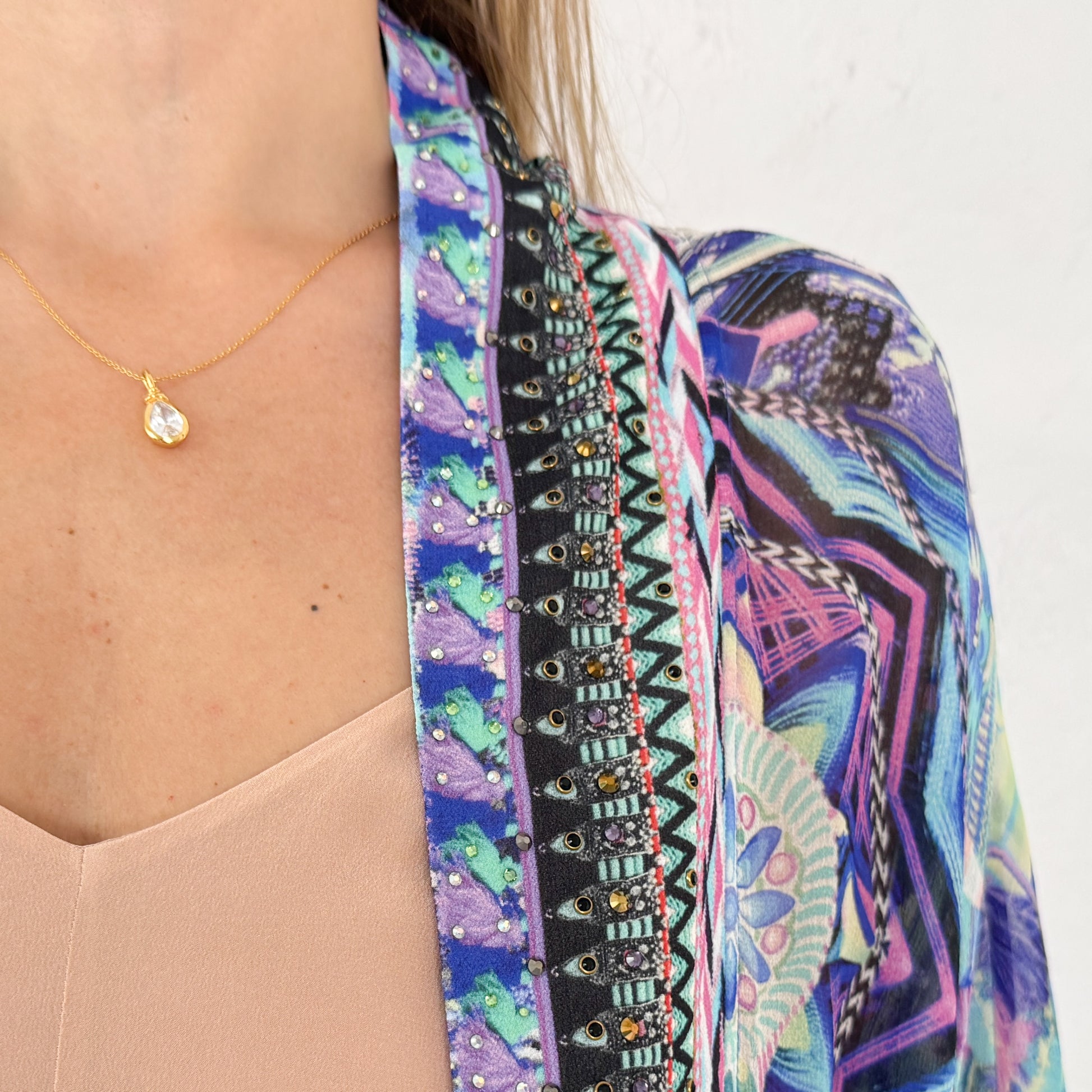 Details & Composition: A soft and floaty silhouette creates a feminine layering piece. Crystal embellishments to neckline. Fixed band collar. Relaxed layering piece great with jeans.