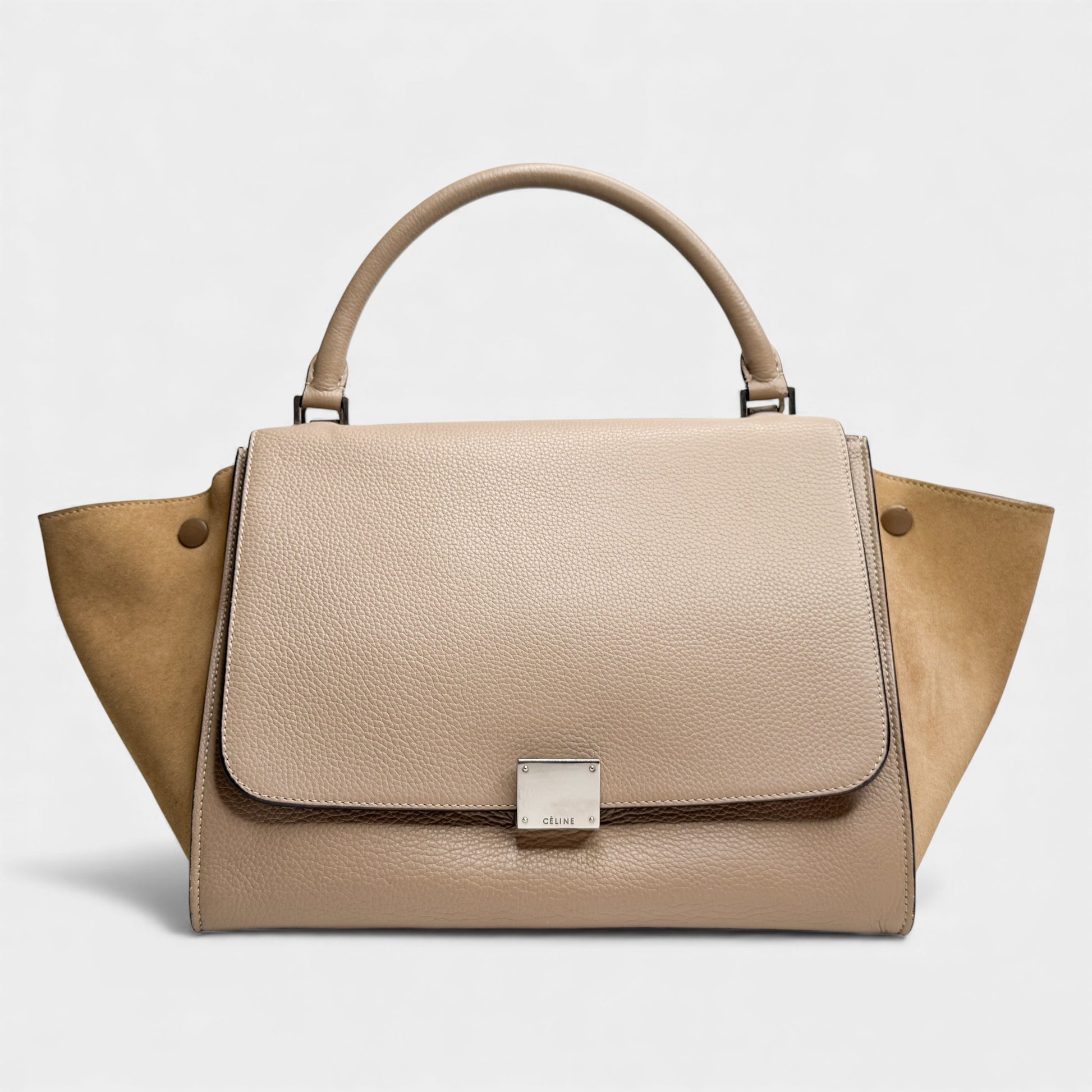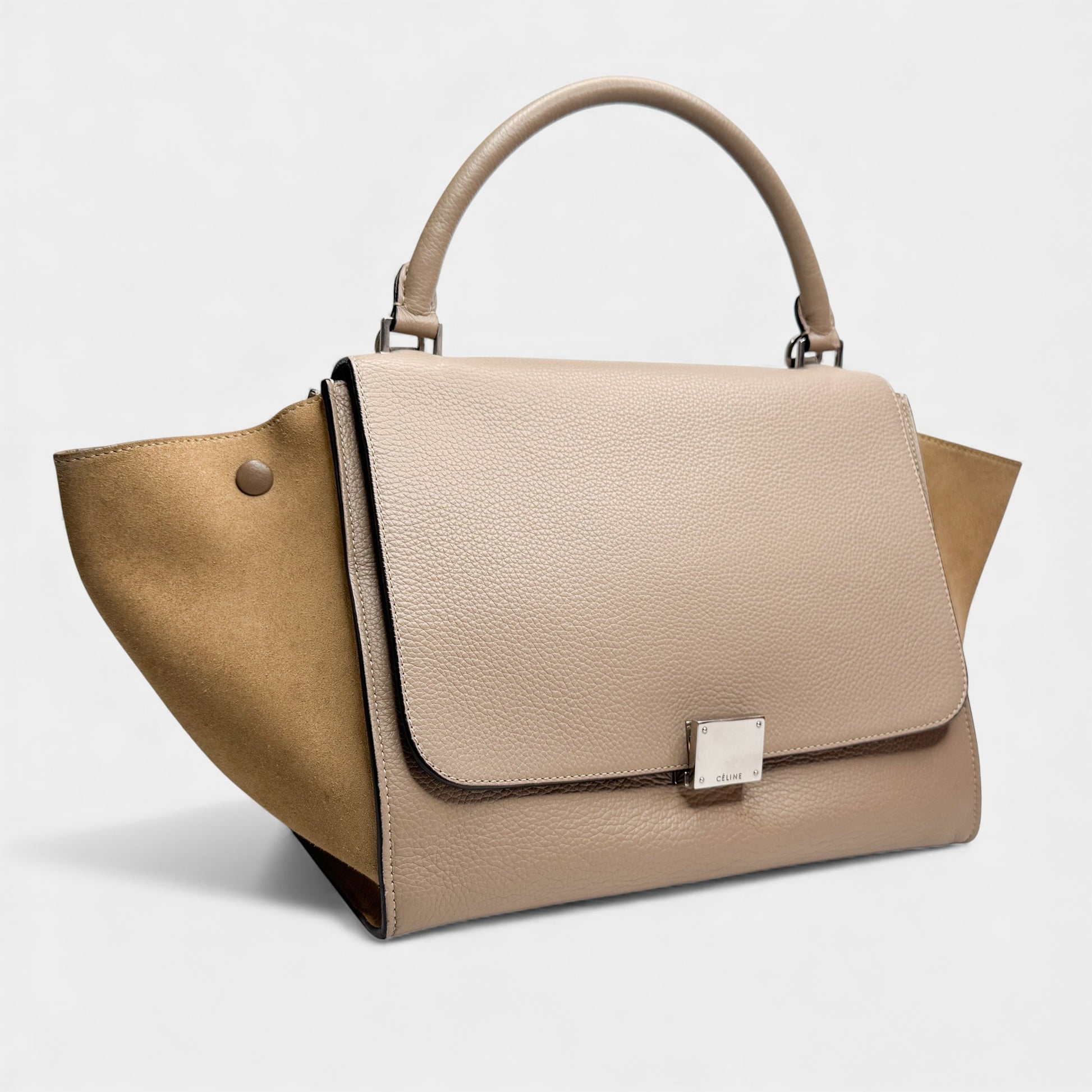 Details: Celine Trapeze top handle and shoulder bag crafted from light beige smooth leather with matching beige suede winged sides. The bag features silver-tone hardware, a back zip pocket, and a fold-over front flap that opens to a spacious leather-lined interior. The interior includes a zip closure for added security and a hanging leather pocket with two slip compartments. The structured shape can be worn expanded or with the sides fastened inward using snap closures. Made in Italy.