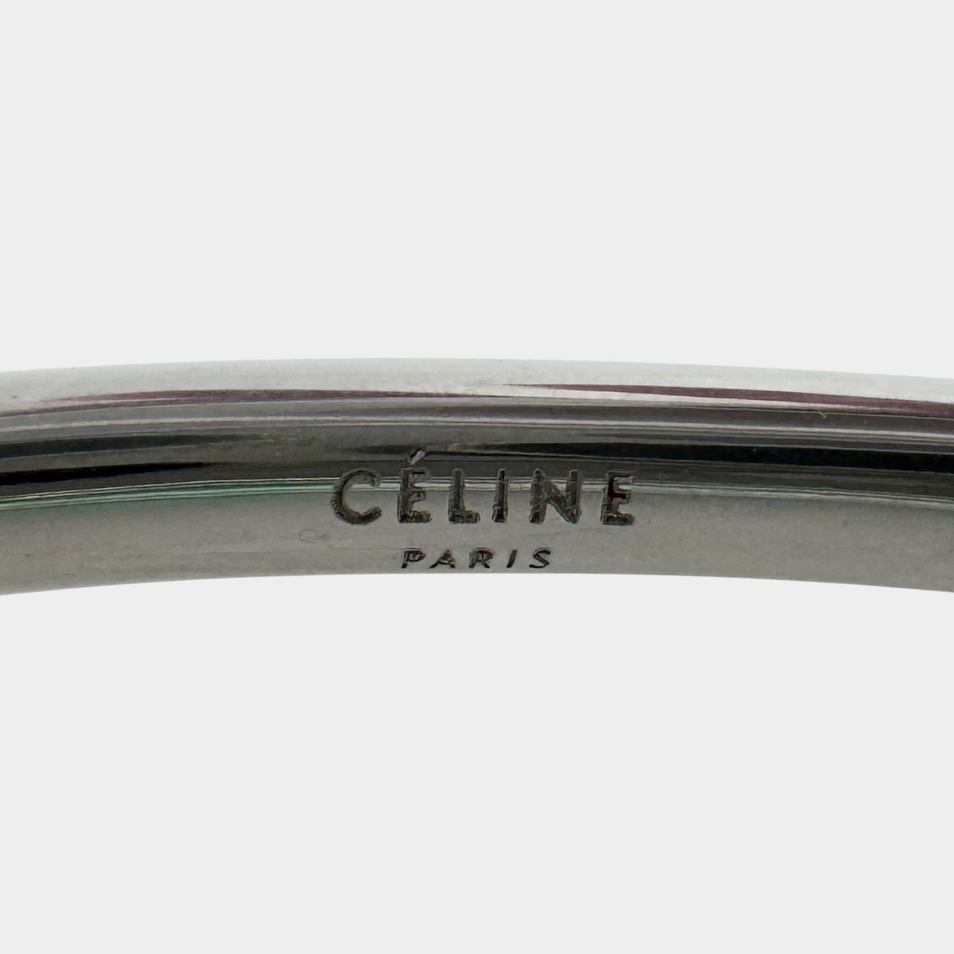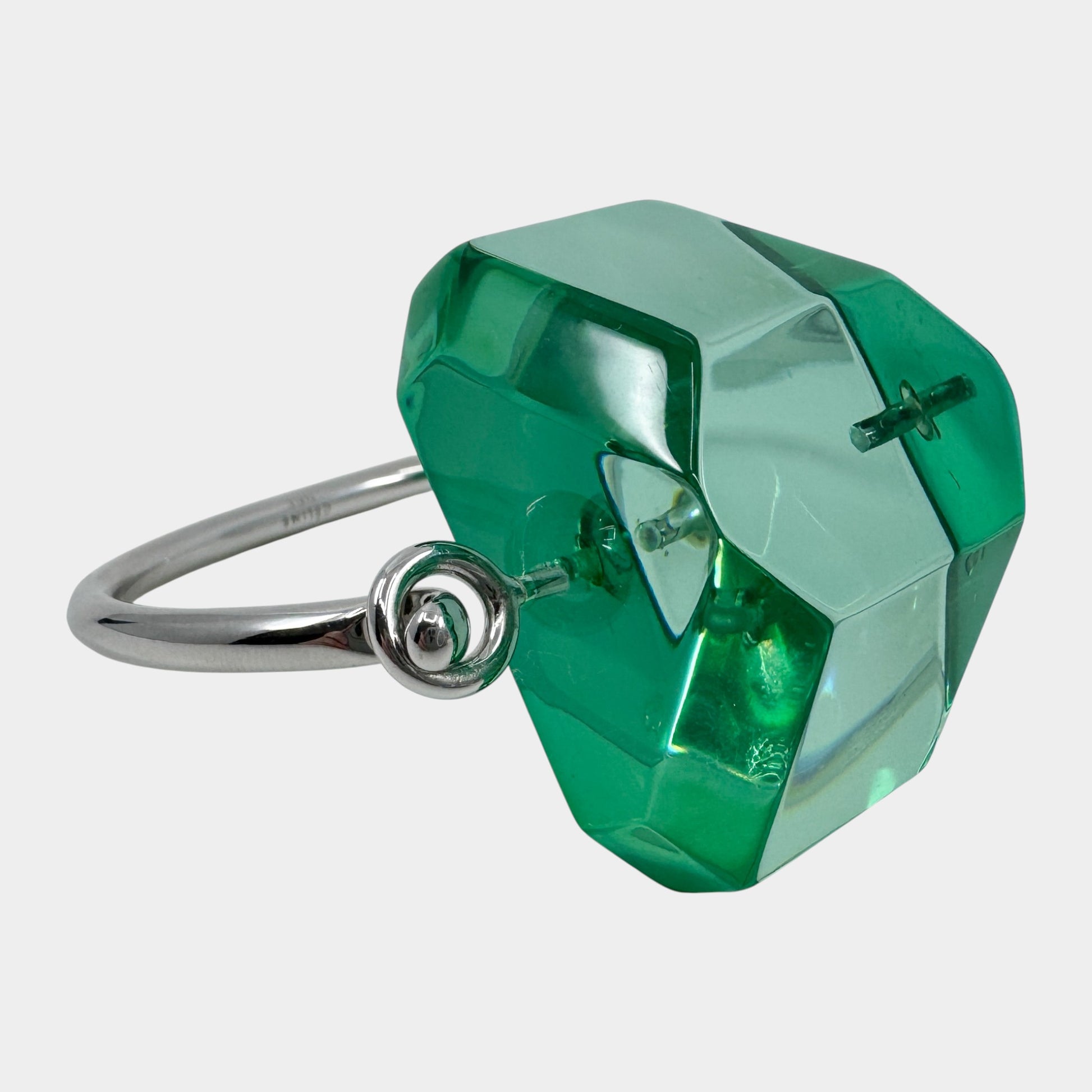 Details: A 2014 Celine design in palladium-plated silver with a faceted green plexiglass centre piece. The bangle measures 64mm x 54mm internally, with the plexiglass ornament at 38mm x 24mm x 20mm. Fishhook closure for secure wear. Fits small to medium wrists. Made in Italy. Includes original box and dust bag.