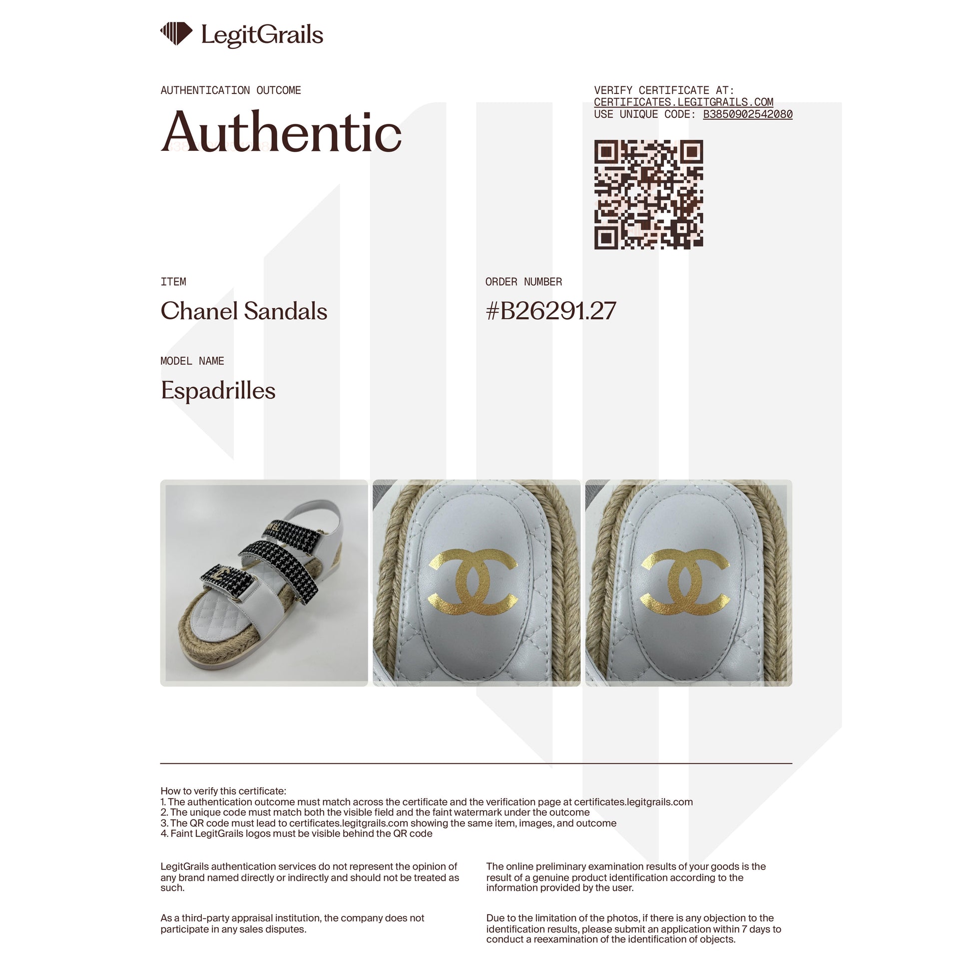 Details: Chanel black and white tweed Velcro-strap espadrille “Dad” sandals, style G38177. White quilted leather insole on an espadrille-style jute midsole with leather outsole. Authenticated in-house by our expert team and supported by third-party authentication from LegitGrails. Made in Italy.