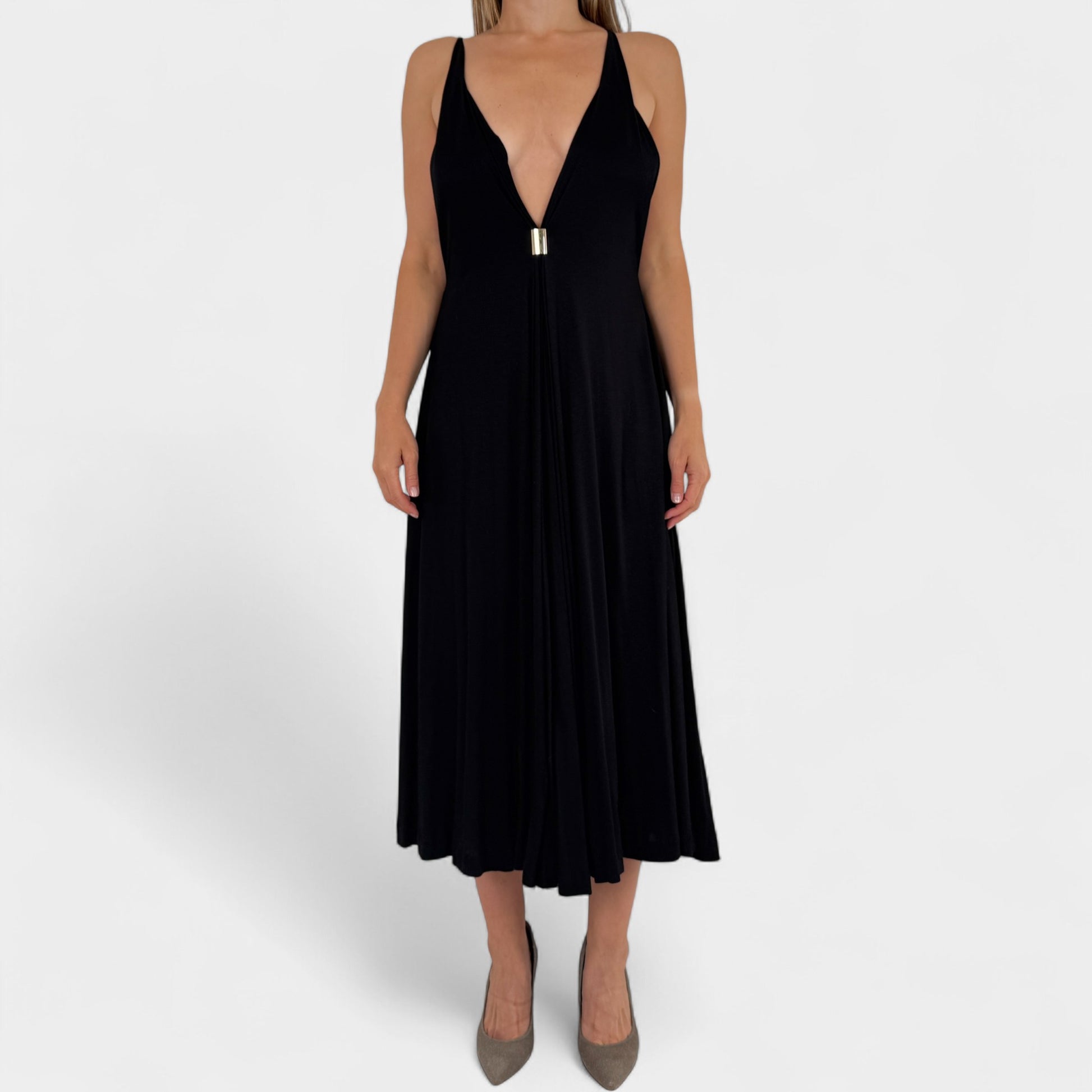 Details: Chloe black v-neck summer dress with gold detailing. Made in France from soft, flowing viscose jersey fabric.