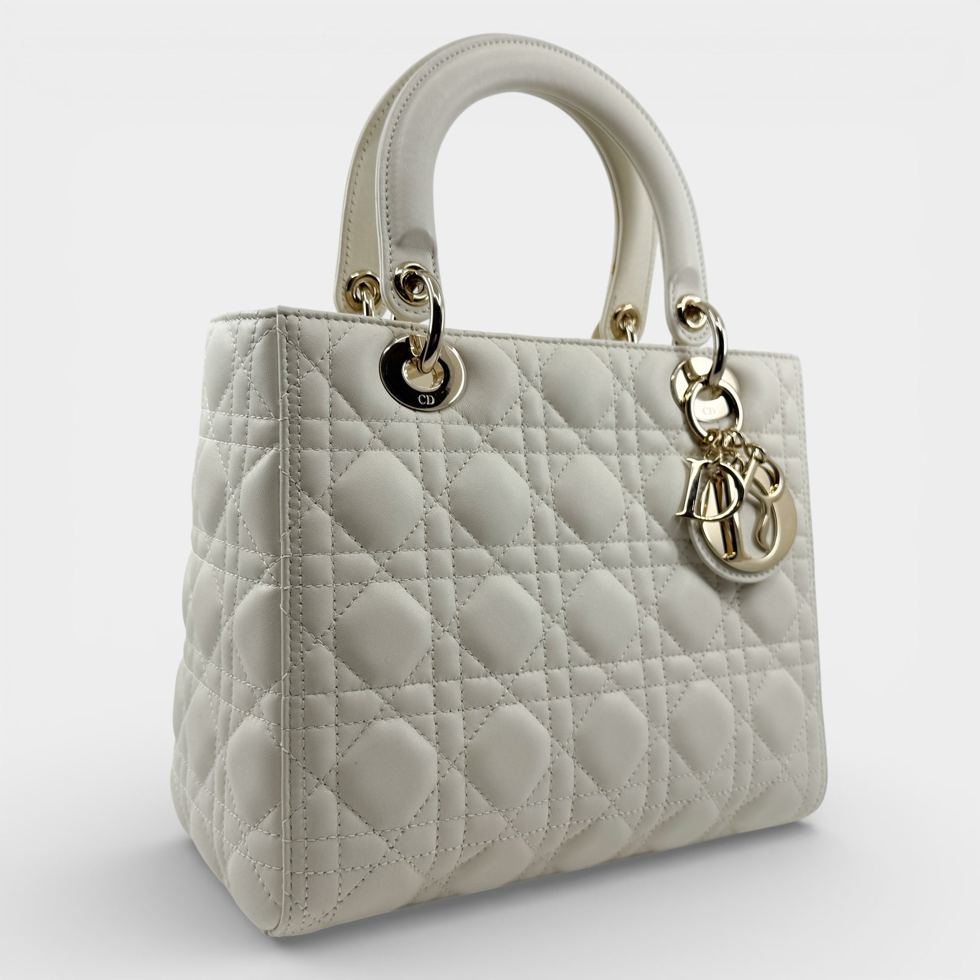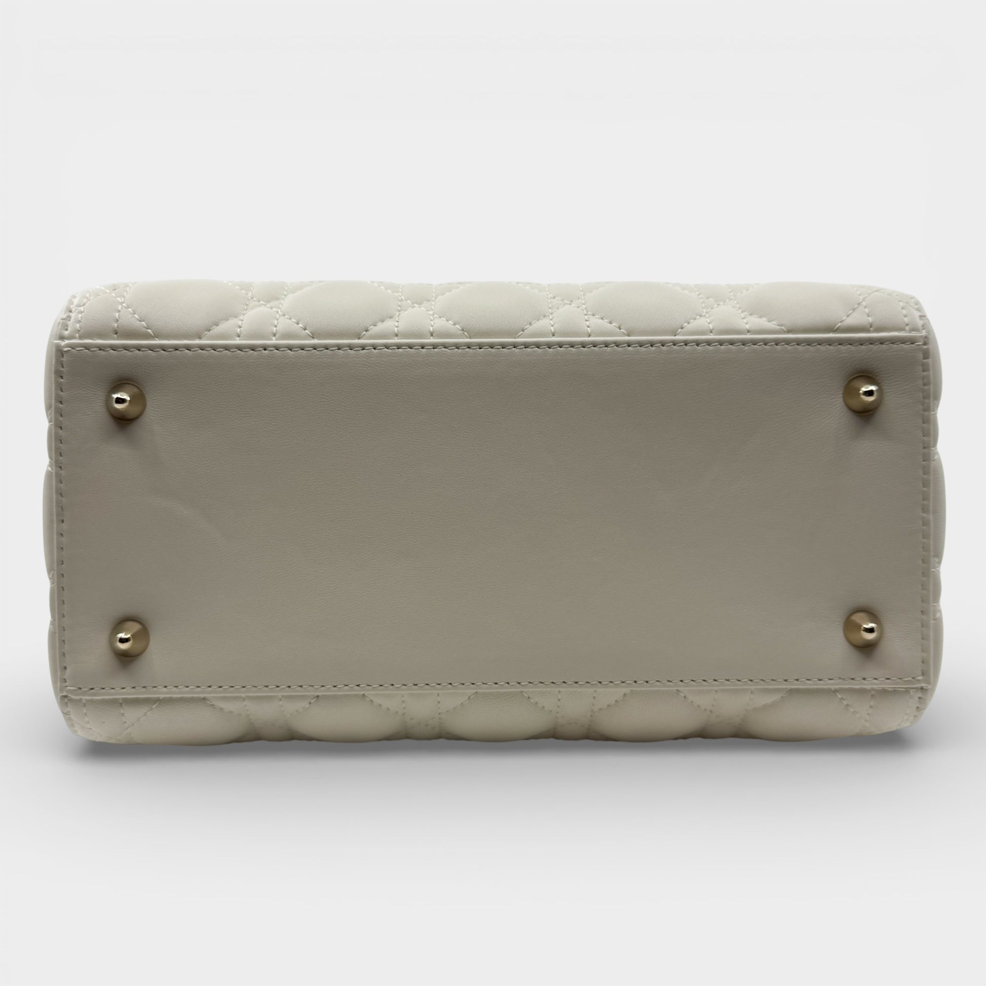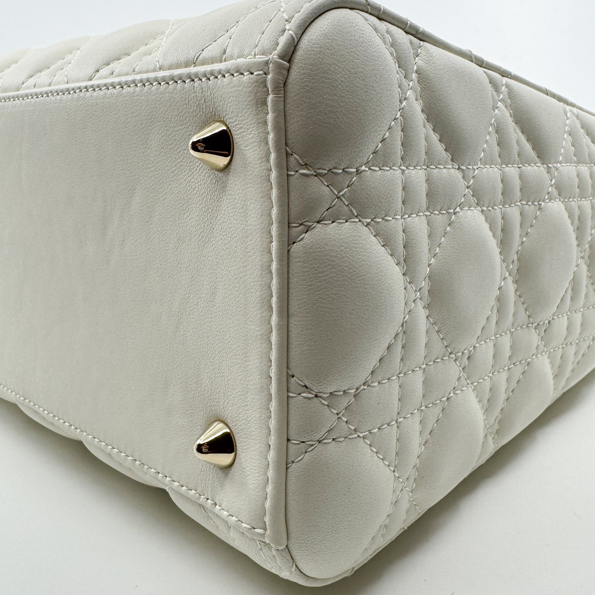 Details: The Lady Dior bag is sleek and refined, crafted in light creamy lambskin with Cannage stitching that creates the classic Dior quilted texture. Finished with pale gold-tone DIOR charms and a thin, removable leather strap, the medium Lady Dior can be carried by hand or worn crossbody. Authenticated by Entrupy.