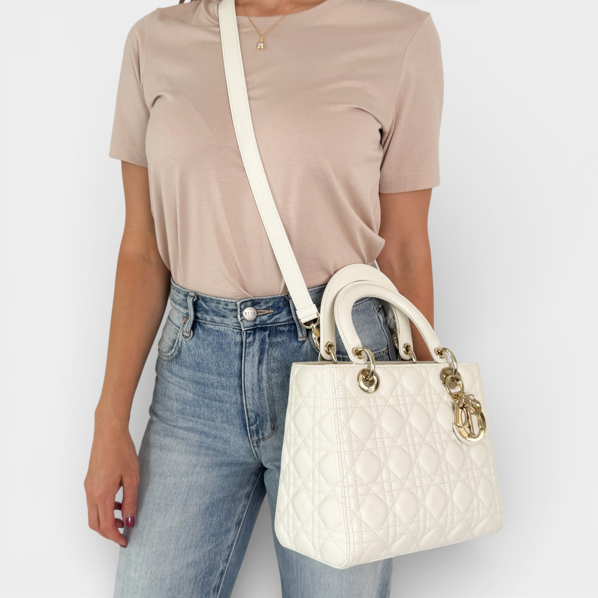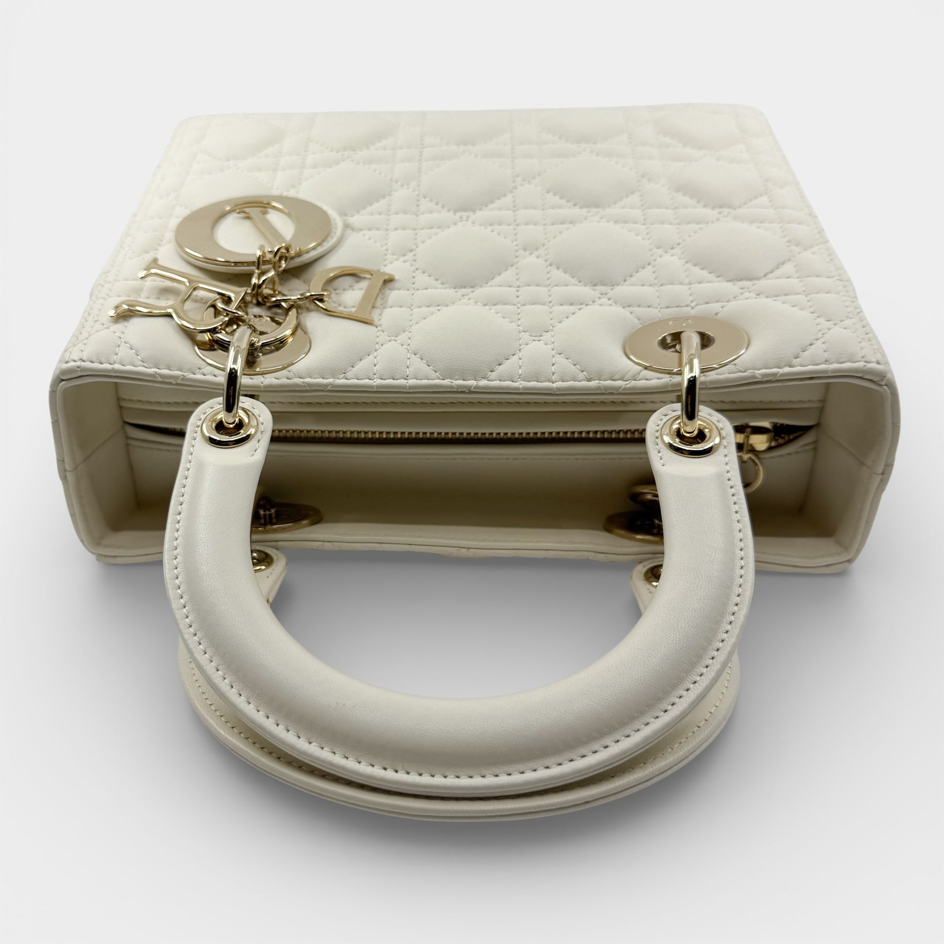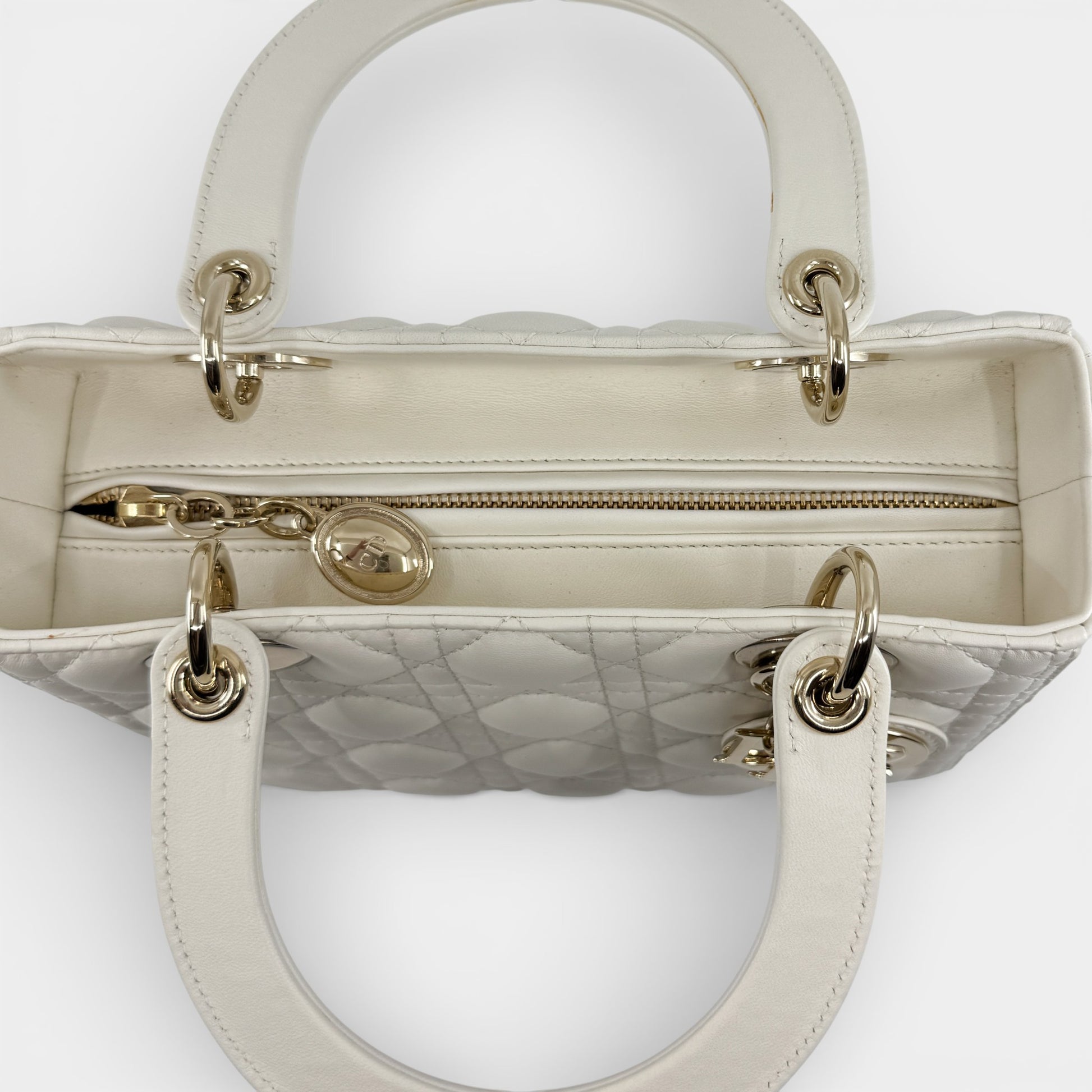 Details: The Lady Dior bag is sleek and refined, crafted in light creamy lambskin with Cannage stitching that creates the classic Dior quilted texture. Finished with pale gold-tone DIOR charms and a thin, removable leather strap, the medium Lady Dior can be carried by hand or worn crossbody. Authenticated by Entrupy.