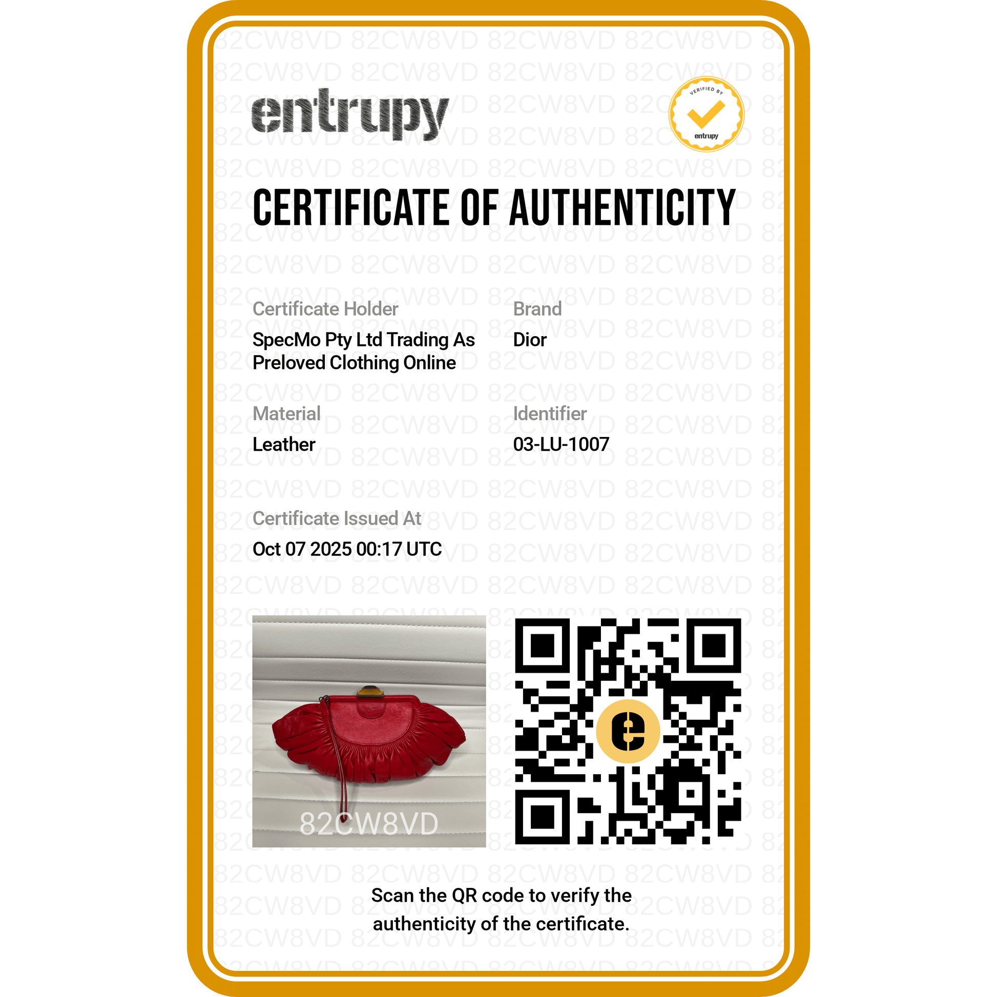 Details: This vintage Christian Dior clutch bag, designed by John Galliano, features red pleated leather crafted with the distinctive Plissé technique. It includes a practical wristlet strap and a black interior lining. Marked Christian Dior Paris, Made in Italy, this piece is a genuine collectible accessory from the Galliano era. Ideal for collectors seeking authentic vintage Dior leather goods. Includes Entrupy certificate of authenticity.
