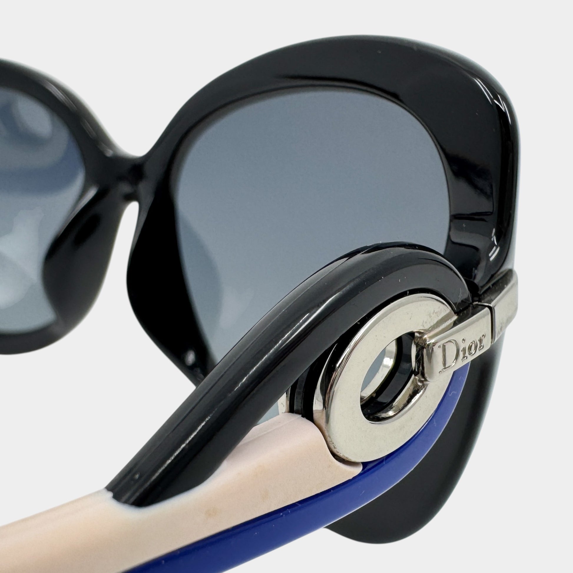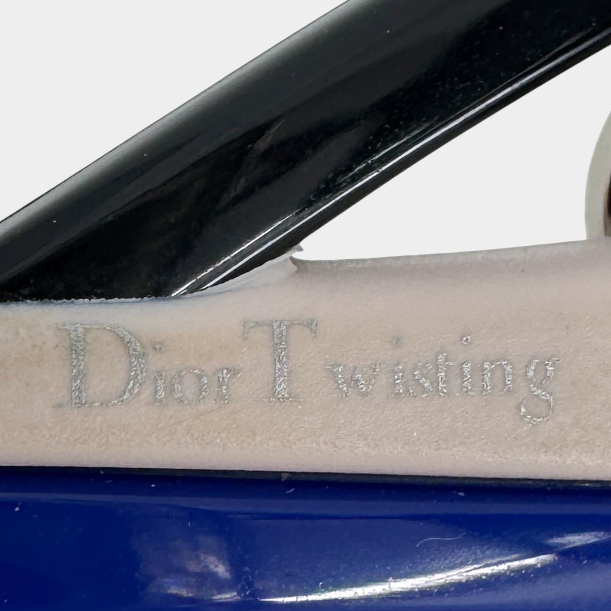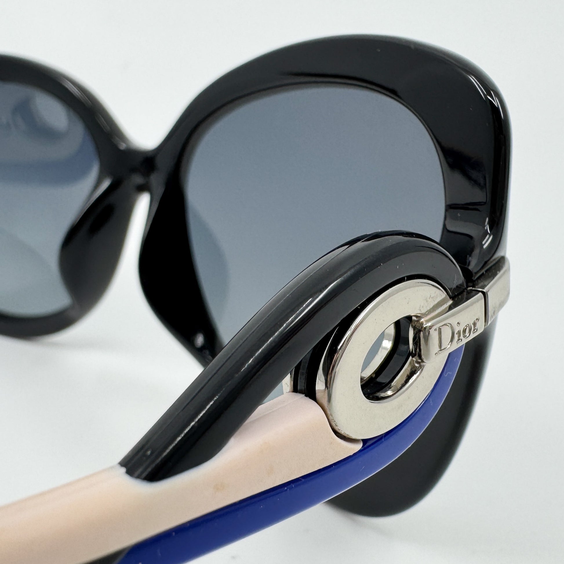Details: Christian Dior Vintage Optyl Twisting Butterfly Sunglasses. Made in Italy. Striking black butterfly-style frames with dark lenses and sculptural arms in a swirl of blue, pink, and black — a signature Dior Twisting design. Crafted from lightweight and durable Optyl material, known for its comfort and high-gloss finish.