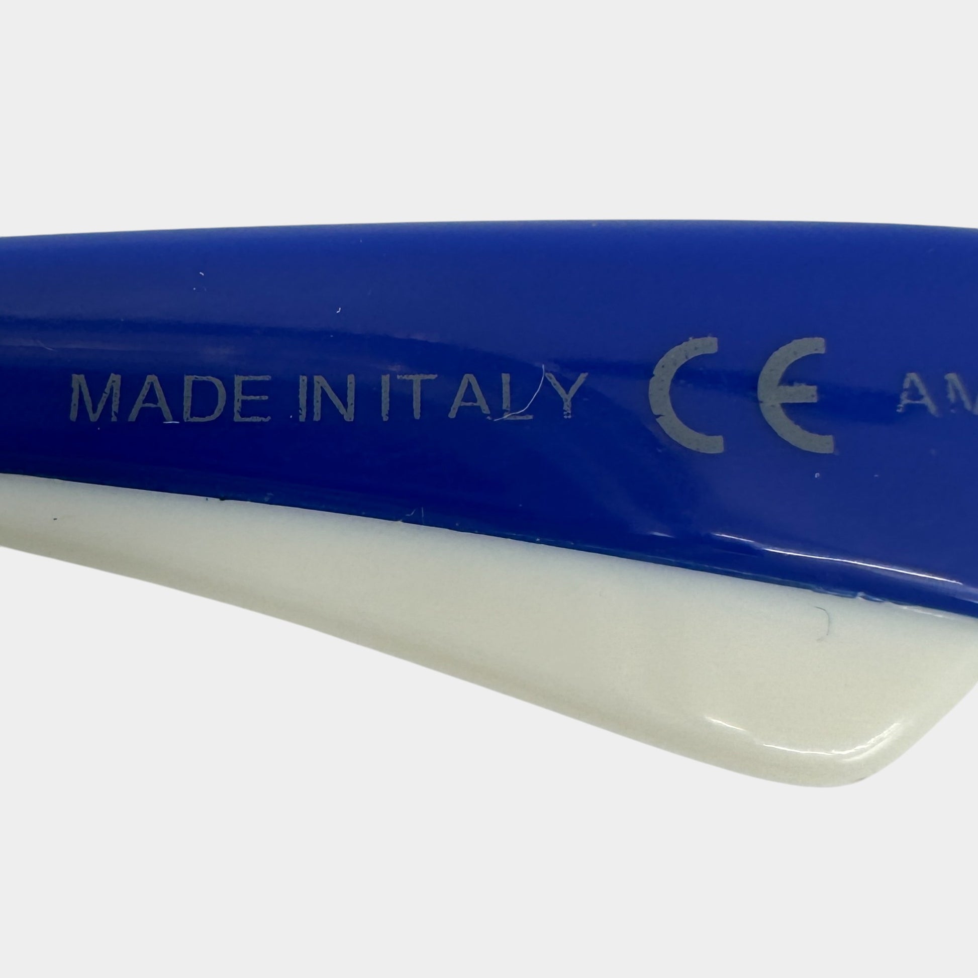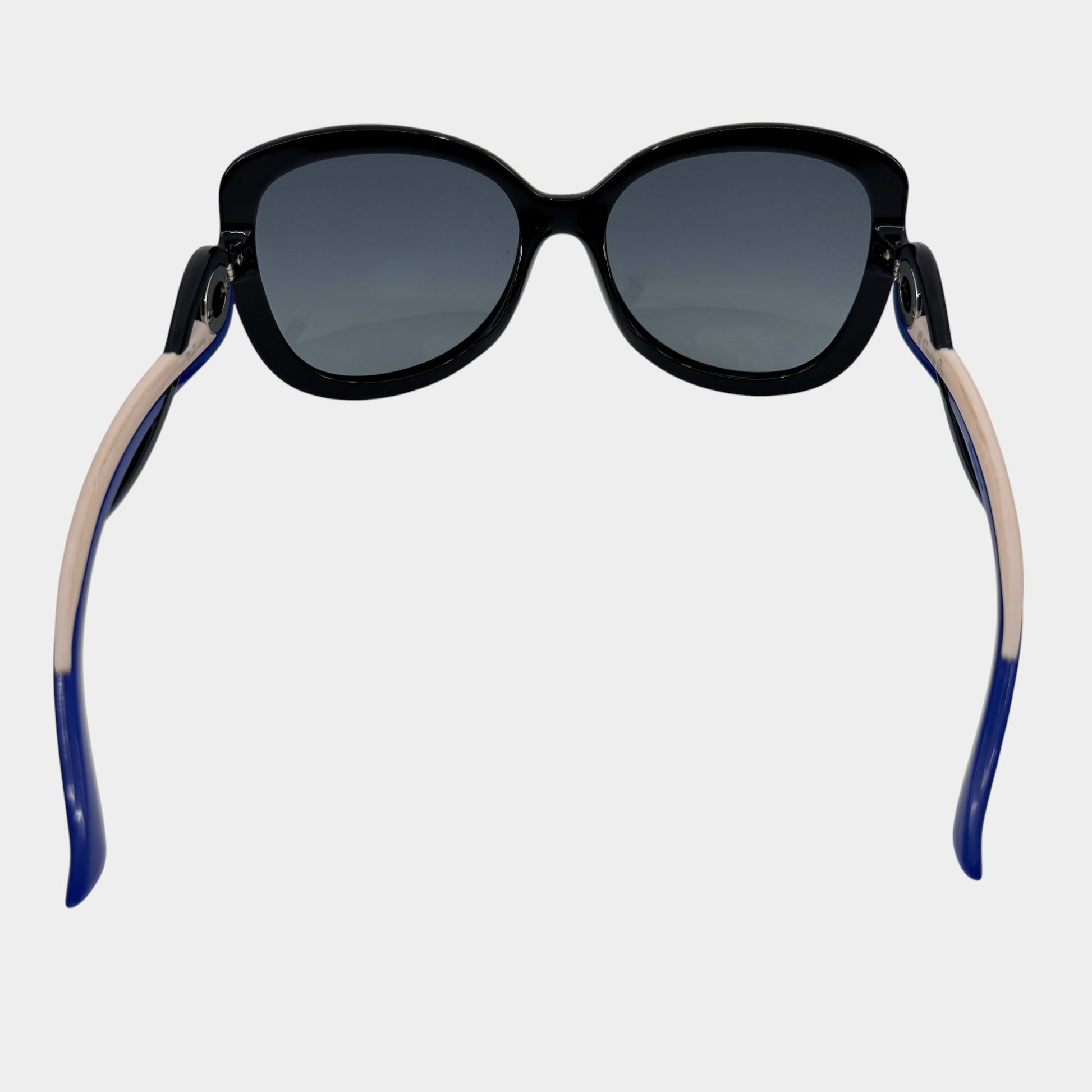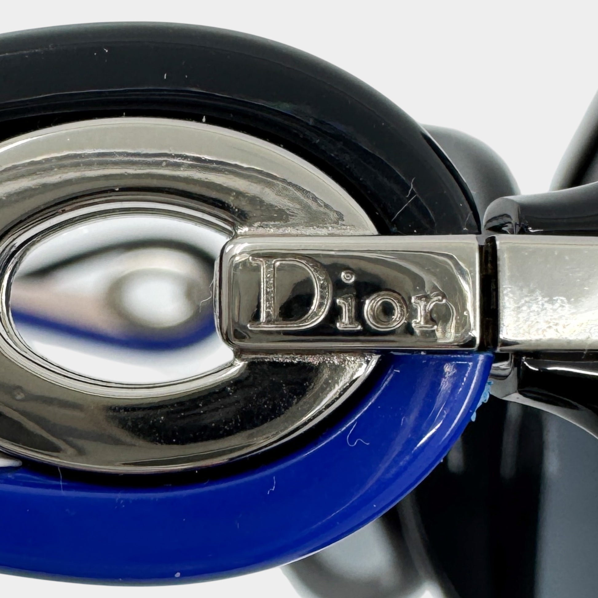 Details: Christian Dior Vintage Optyl Twisting Butterfly Sunglasses. Made in Italy. Striking black butterfly-style frames with dark lenses and sculptural arms in a swirl of blue, pink, and black — a signature Dior Twisting design. Crafted from lightweight and durable Optyl material, known for its comfort and high-gloss finish.