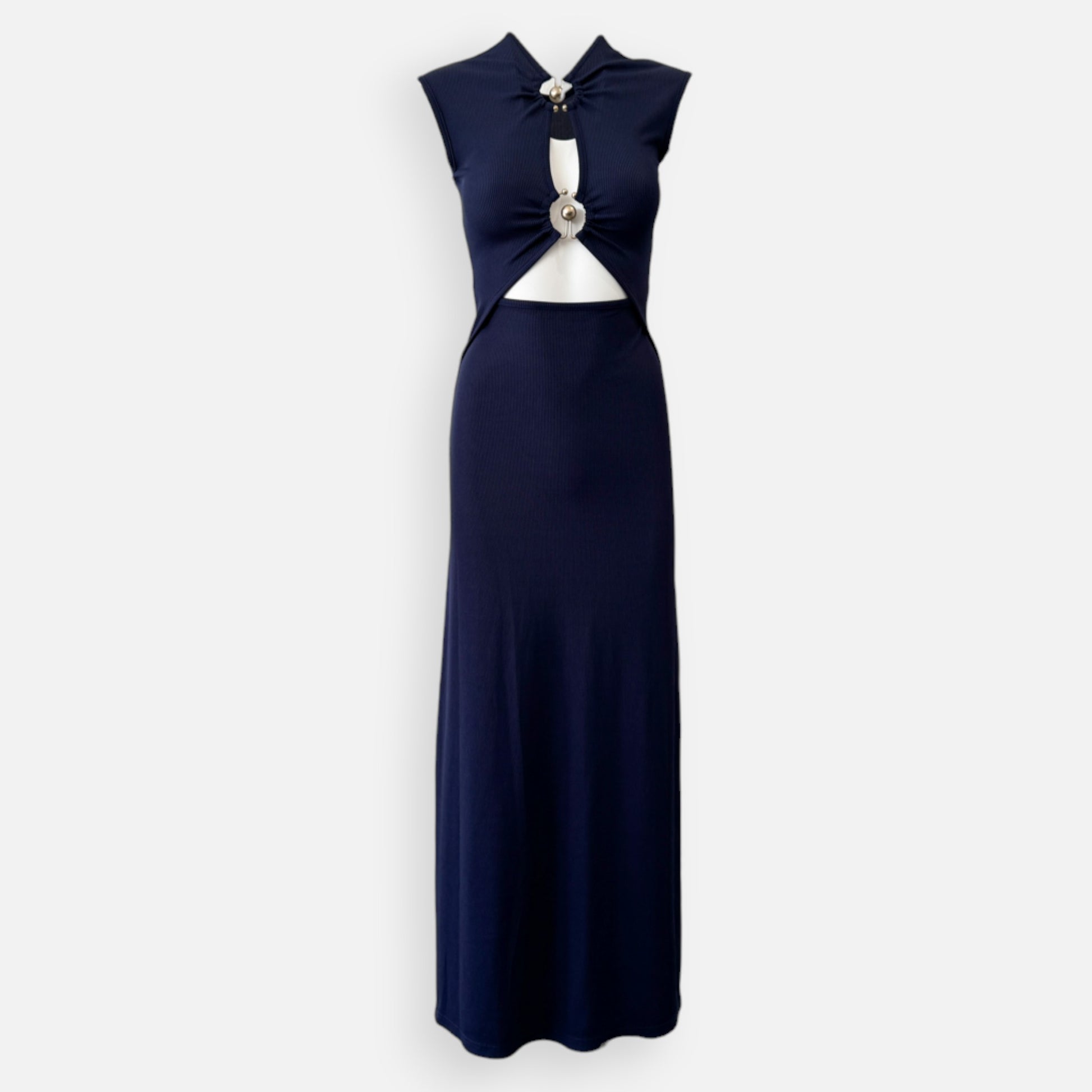 Details: Navy blue Orbit ruched maxi dress from CHRISTOPHER ESBER featuring a long fitted design, ribbed detailing, plunging v-neck, sleeveless and straight hem. Silver metal orbit detailing.