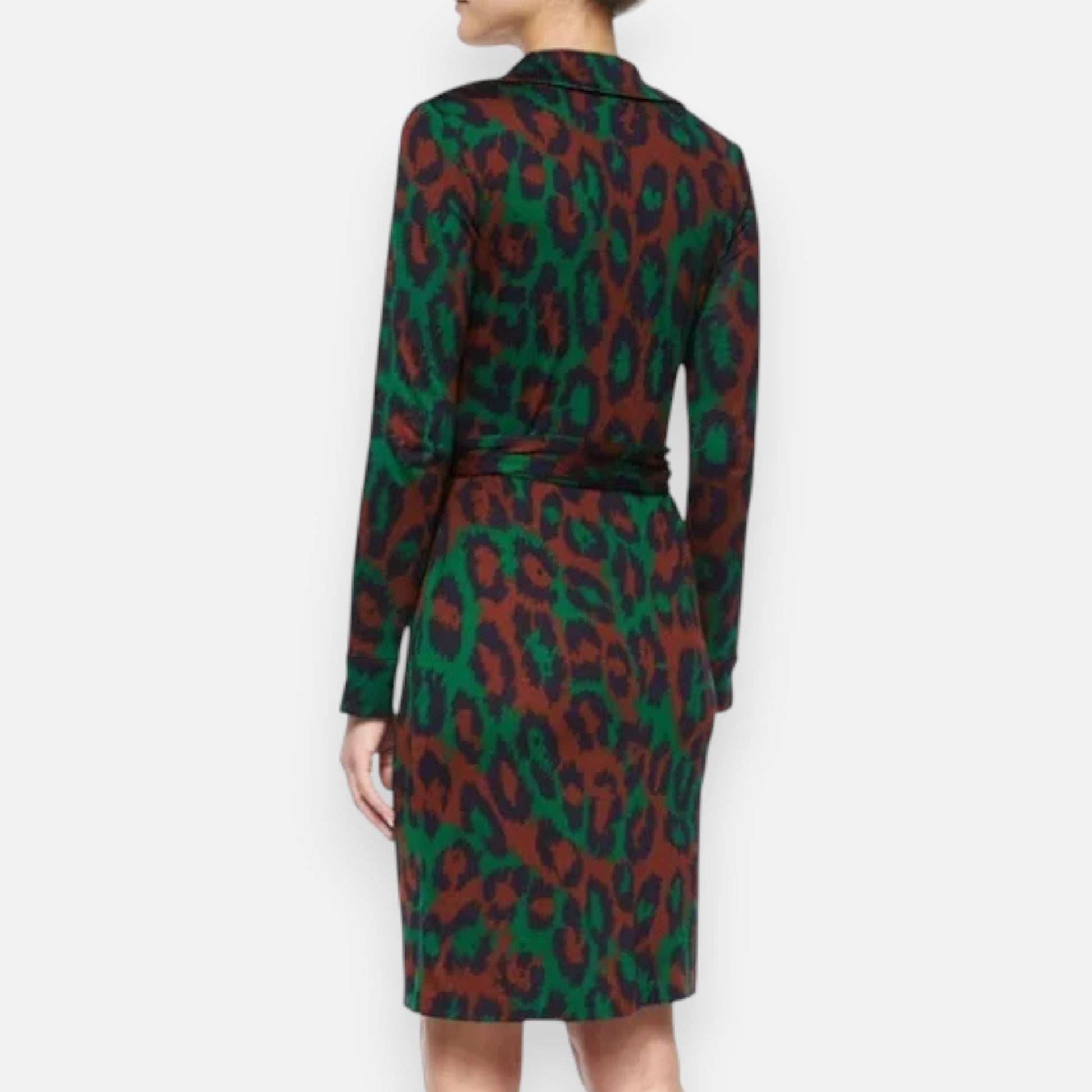 Details: 100% silk wrap dress in a green and rust brown animal print.