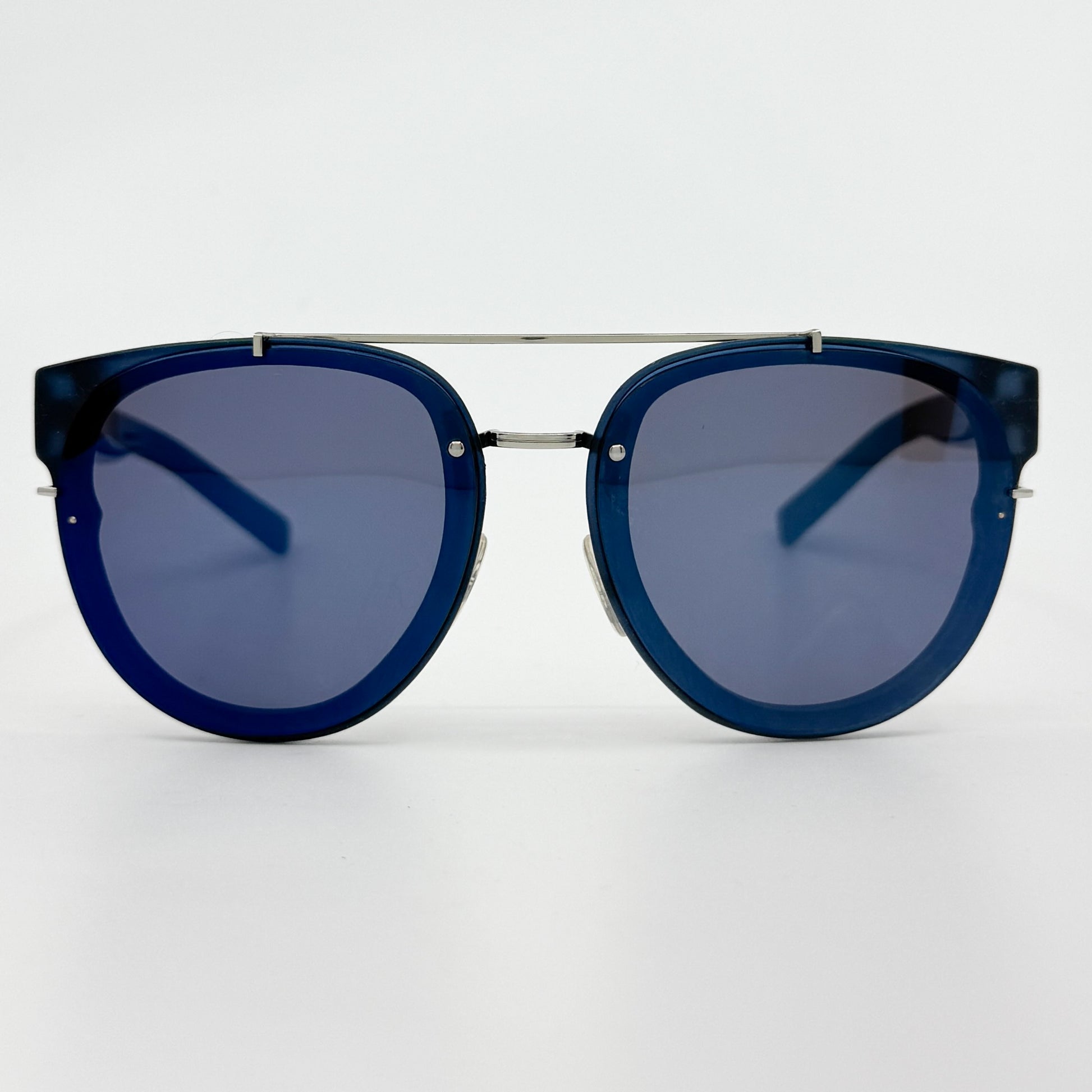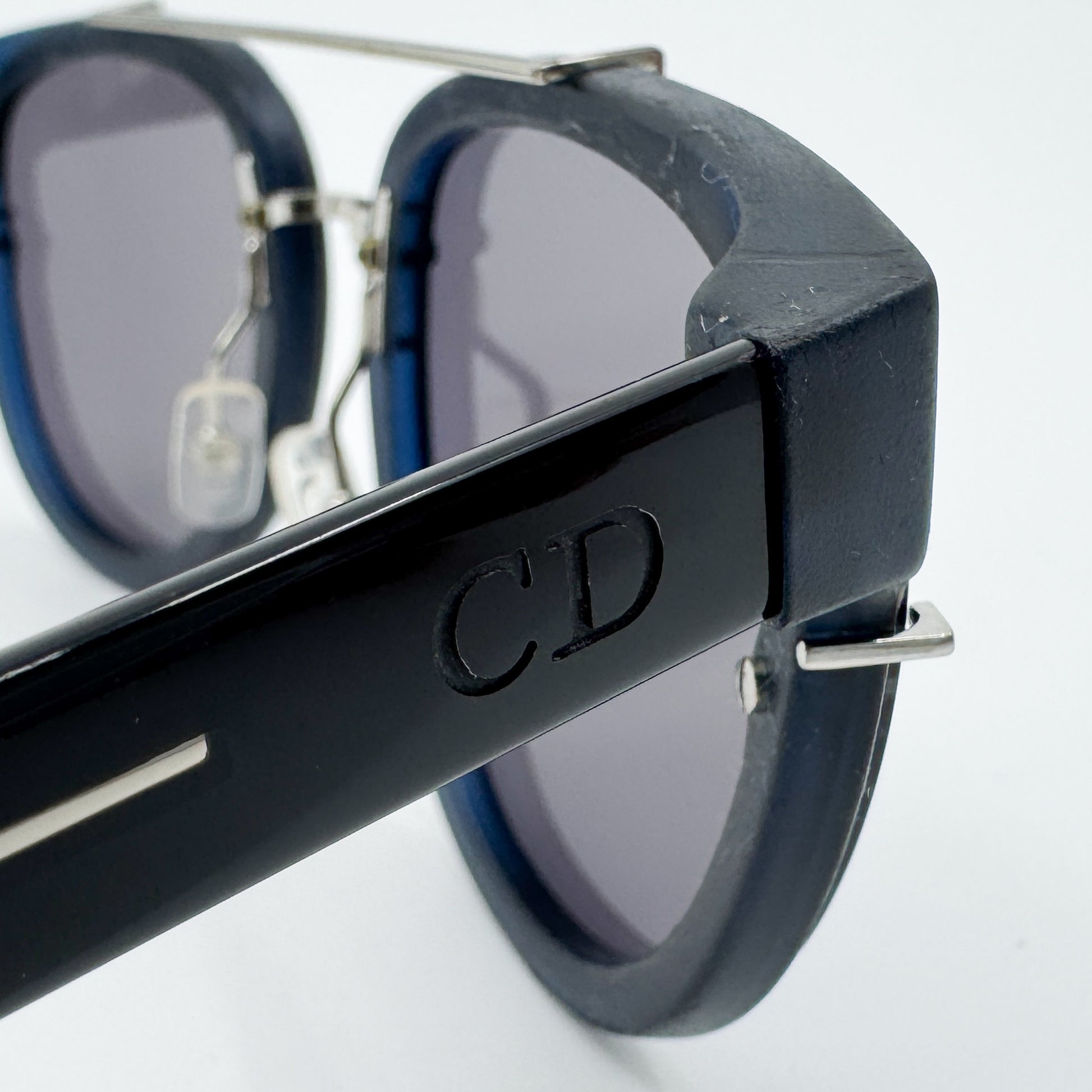 Details: Sleek and sculptural, these Dior Homme sunglasses feature a deep blue acetate frame with silver-tone metal accents and matching blue-tinted lenses. The slim silver brow bar and engraved “CD” logo at the temples elevate the modern aviator silhouette. A bold and versatile unisex style with strong architectural lines.