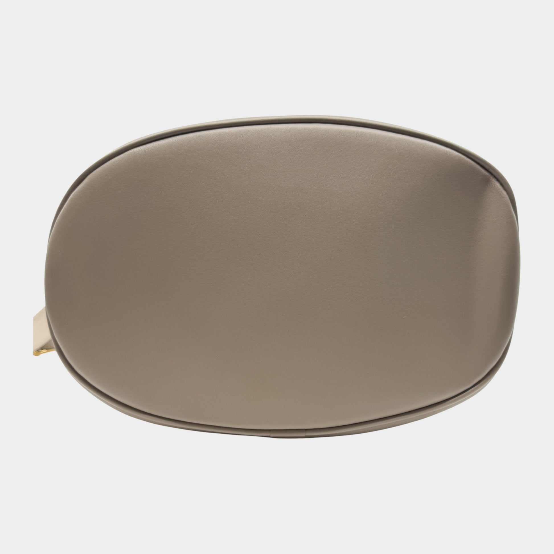 Details: A structured leather drawstring bucket bag by Edward Gilbert, Australian luxury leather designer. Leather is beige with a light sheen. Made in Spain.