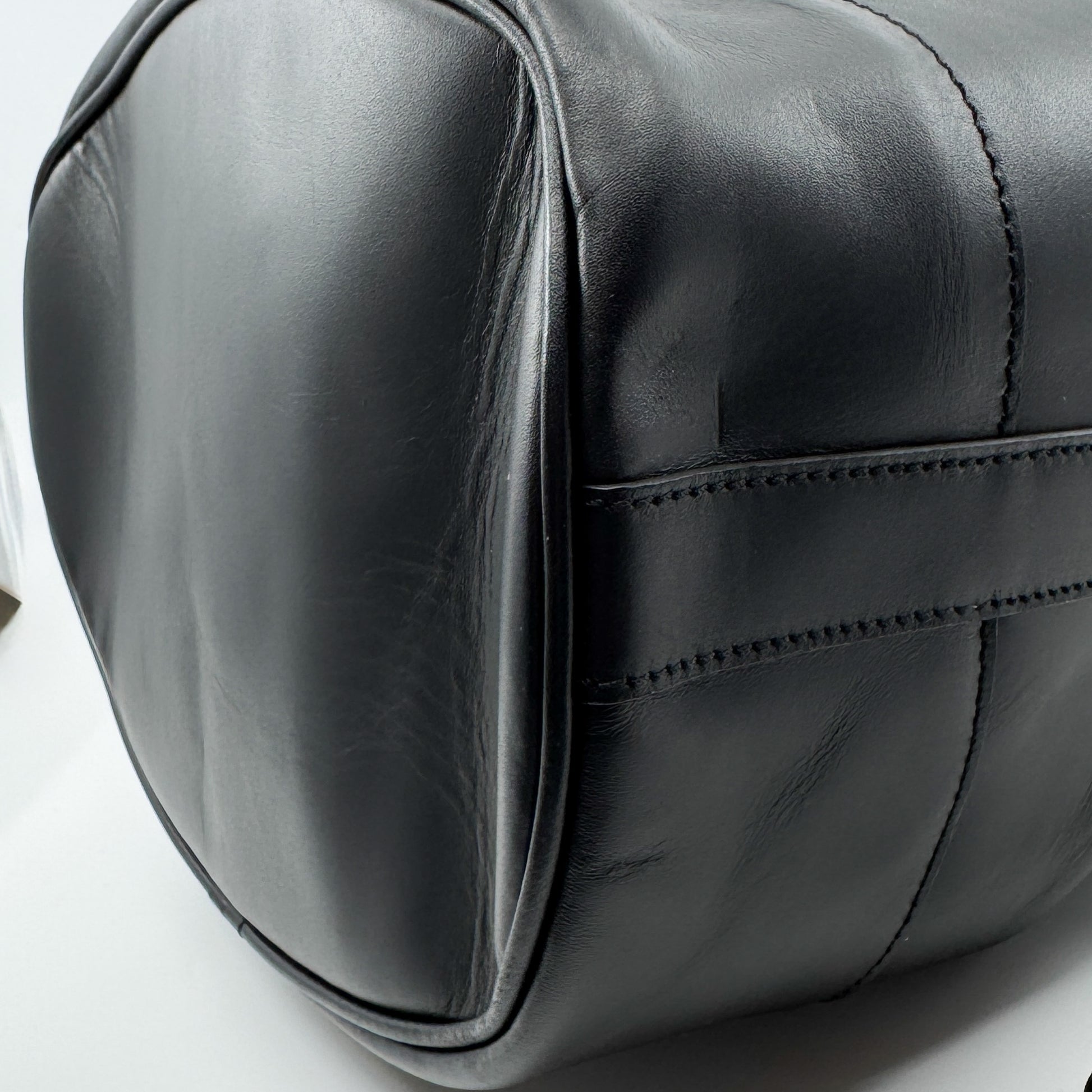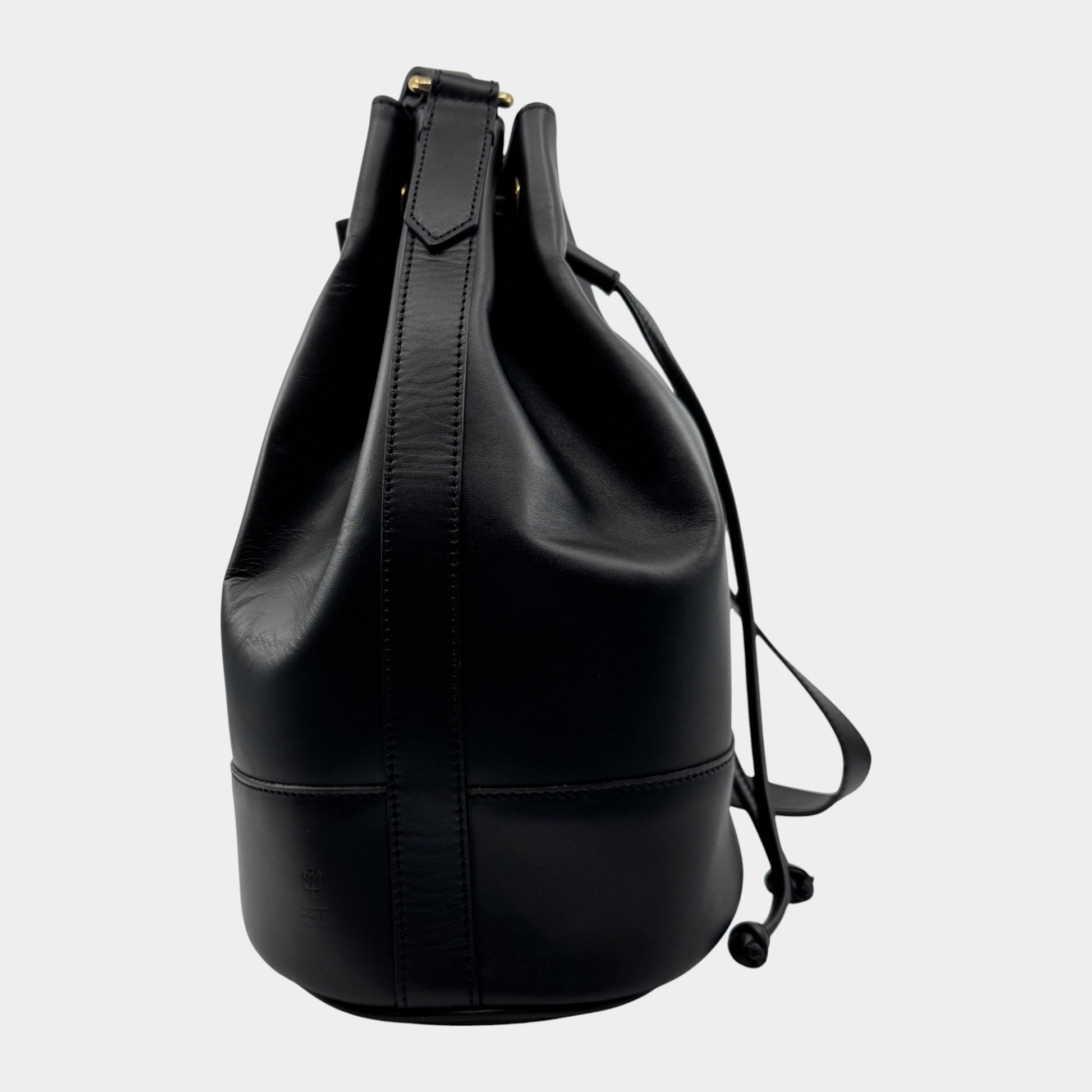 Details: A structured leather drawstring bucket bag by Edward Gilbert, Australian luxury leather designer. Leather is black with a light sheen. Made in Spain.