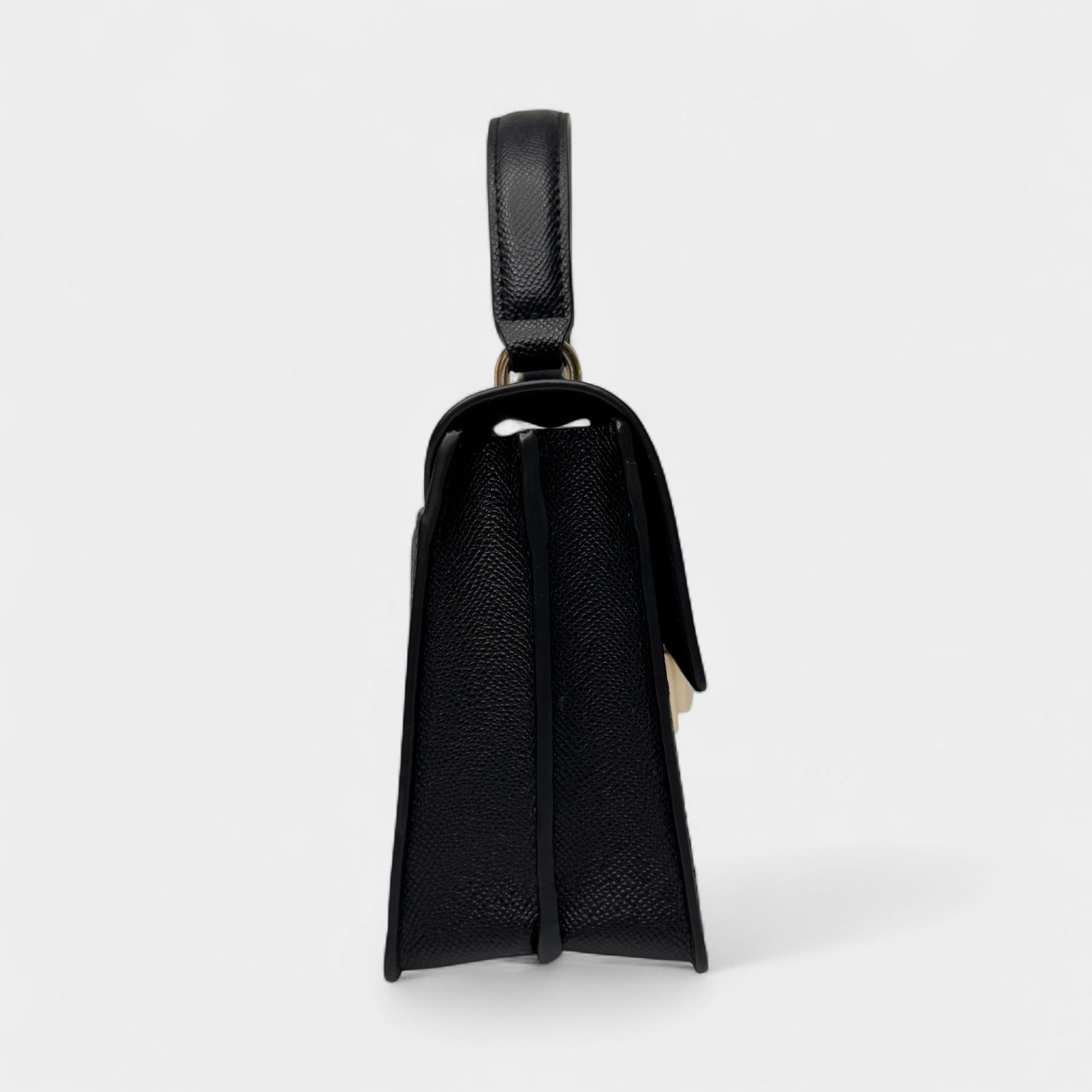 Details: This Furla handbag in black grainy leather features silvery gold-tone hardware. The classic design includes a slightly padded top handle, flap closure, and an adjustable, removable strap with a drop of up to 50 cm. Inside, the textile-lined interior offers a zip pocket and a slip pocket for secure organisation. Includes dust bag.