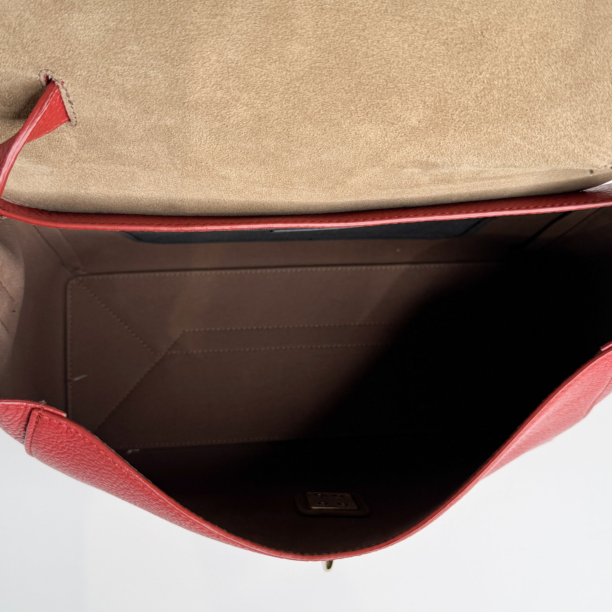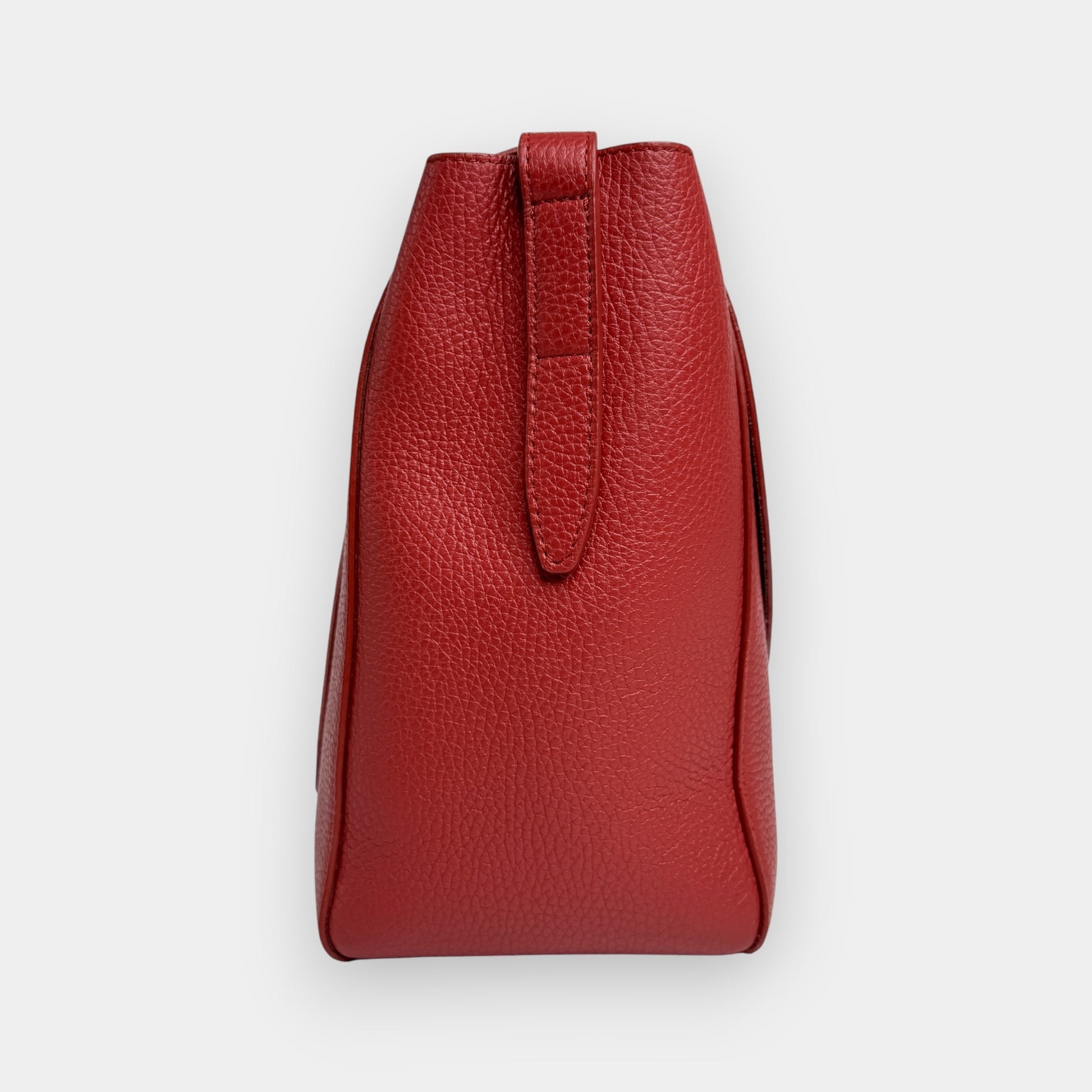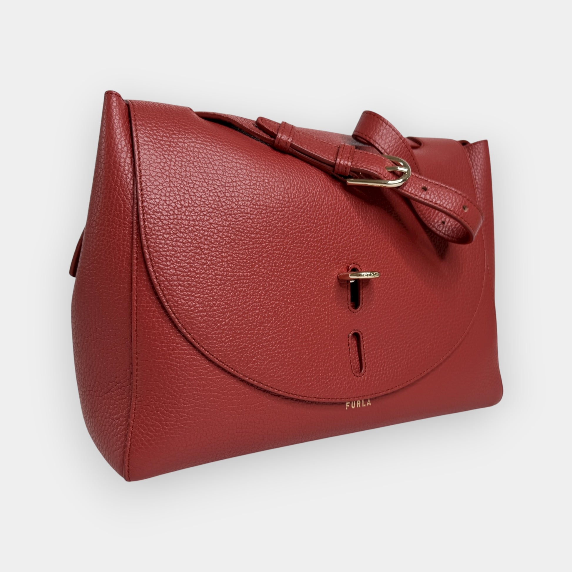 Details: Furla Net top handle bag in deep red grainy calf leather. Features the signature metal twist closure with oval cut-out, gold-stamped Furla logo, and adjustable buckle handle that can be worn over the shoulder. Includes practical outer pocket at the back and internal compartments for organisation. Comes with dust bag.