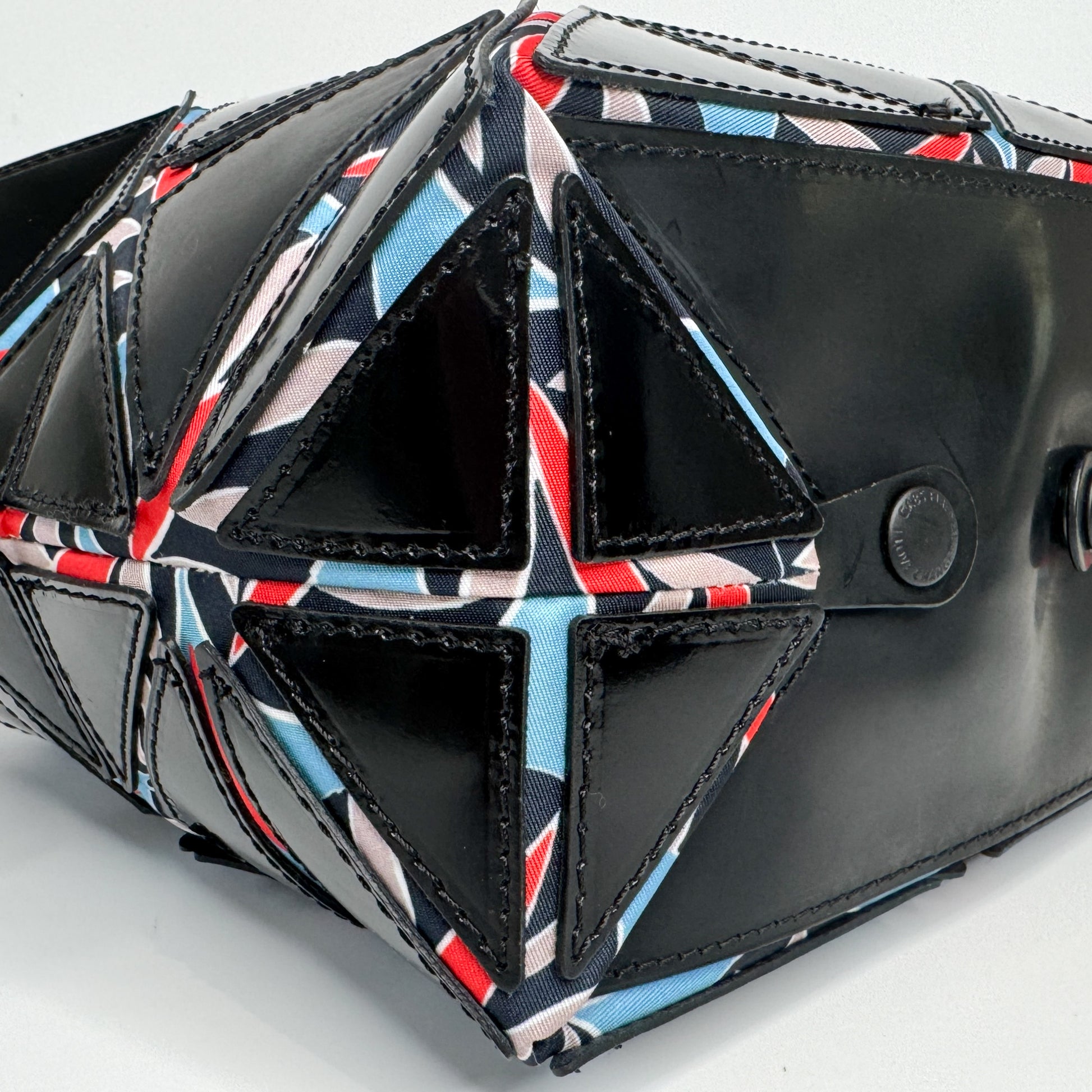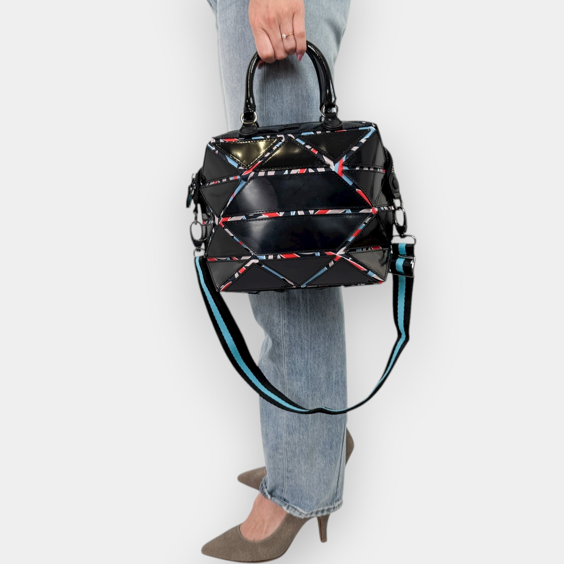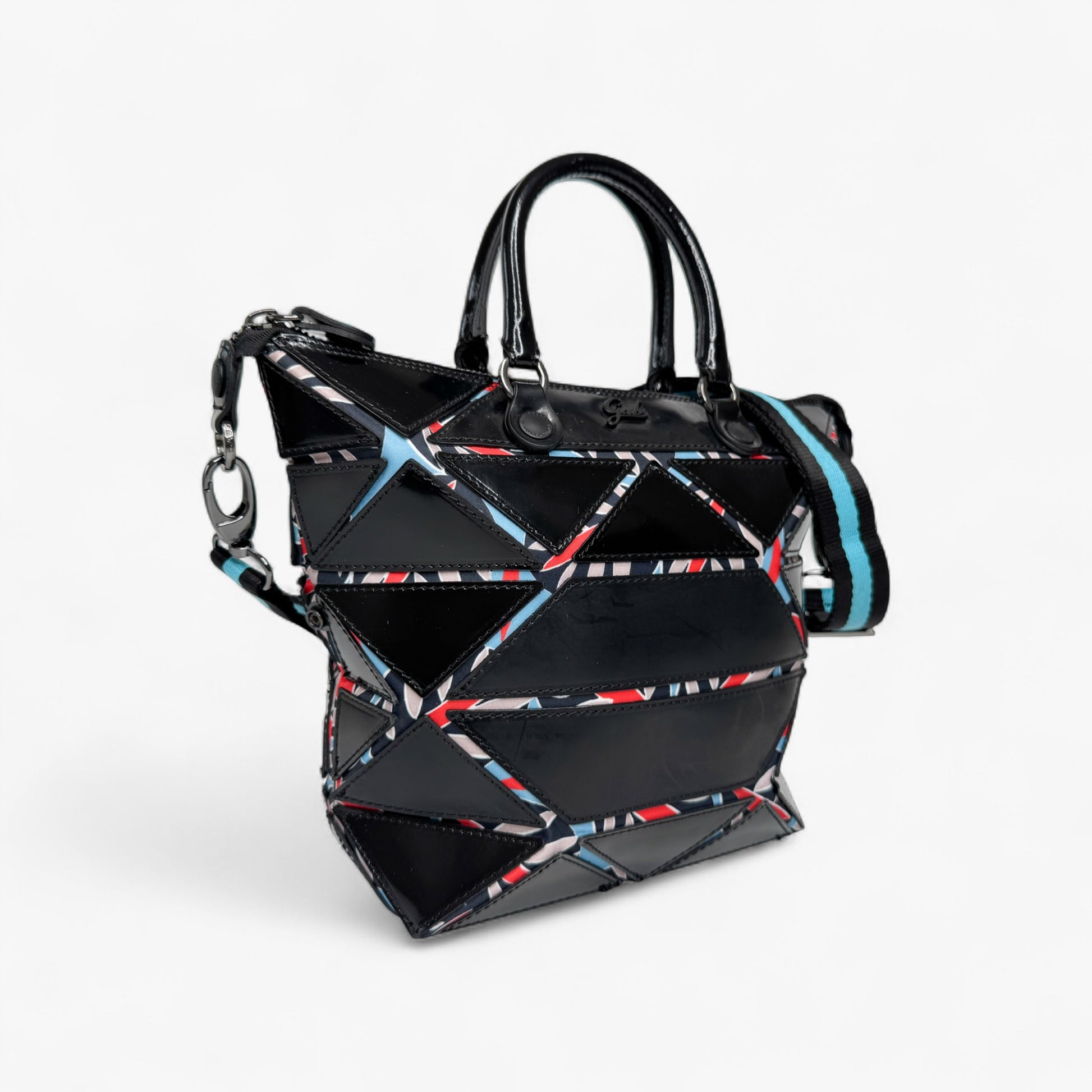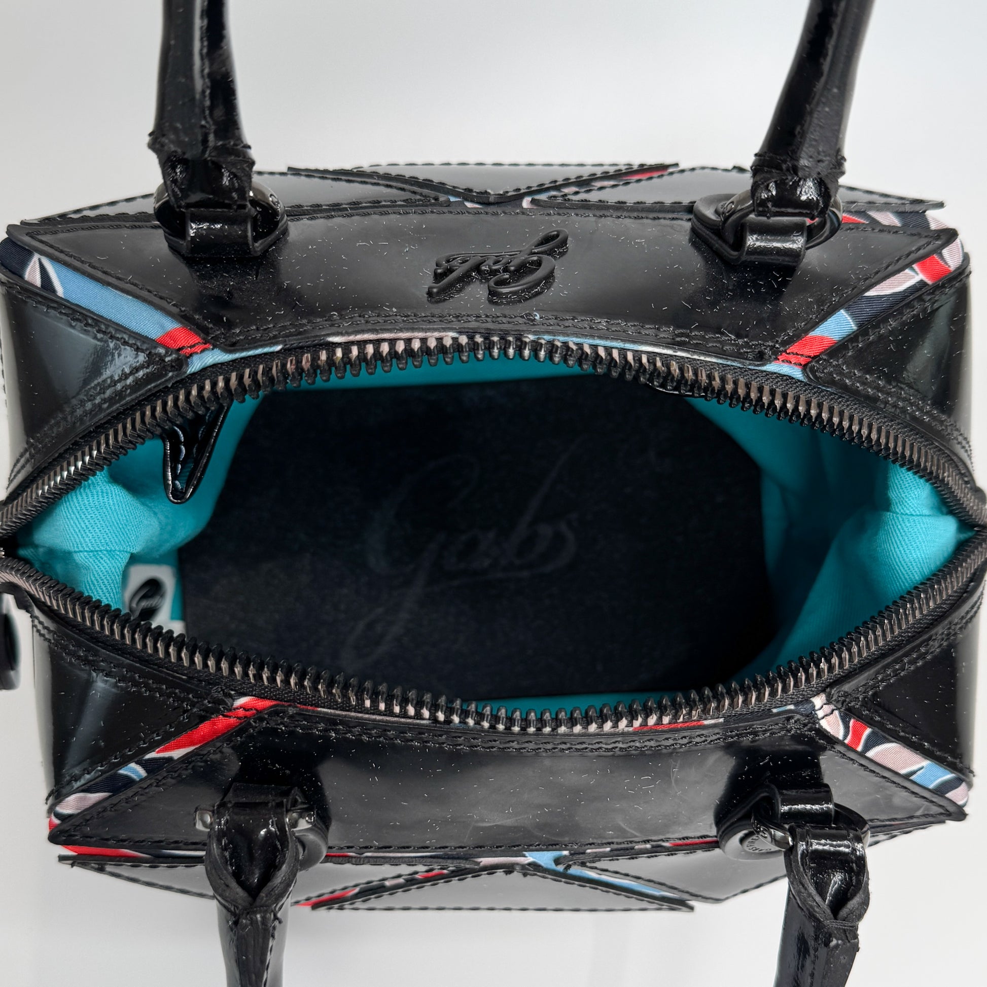 Details: Gabs Italy convertible shopper tote bag crafted with black glossy leather panels over a colourful textile base. Features a versatile design that converts from a zip tote to a top handle bag and includes a detachable striped webbing strap for crossbody wear. Finished with signature Gabs branding.