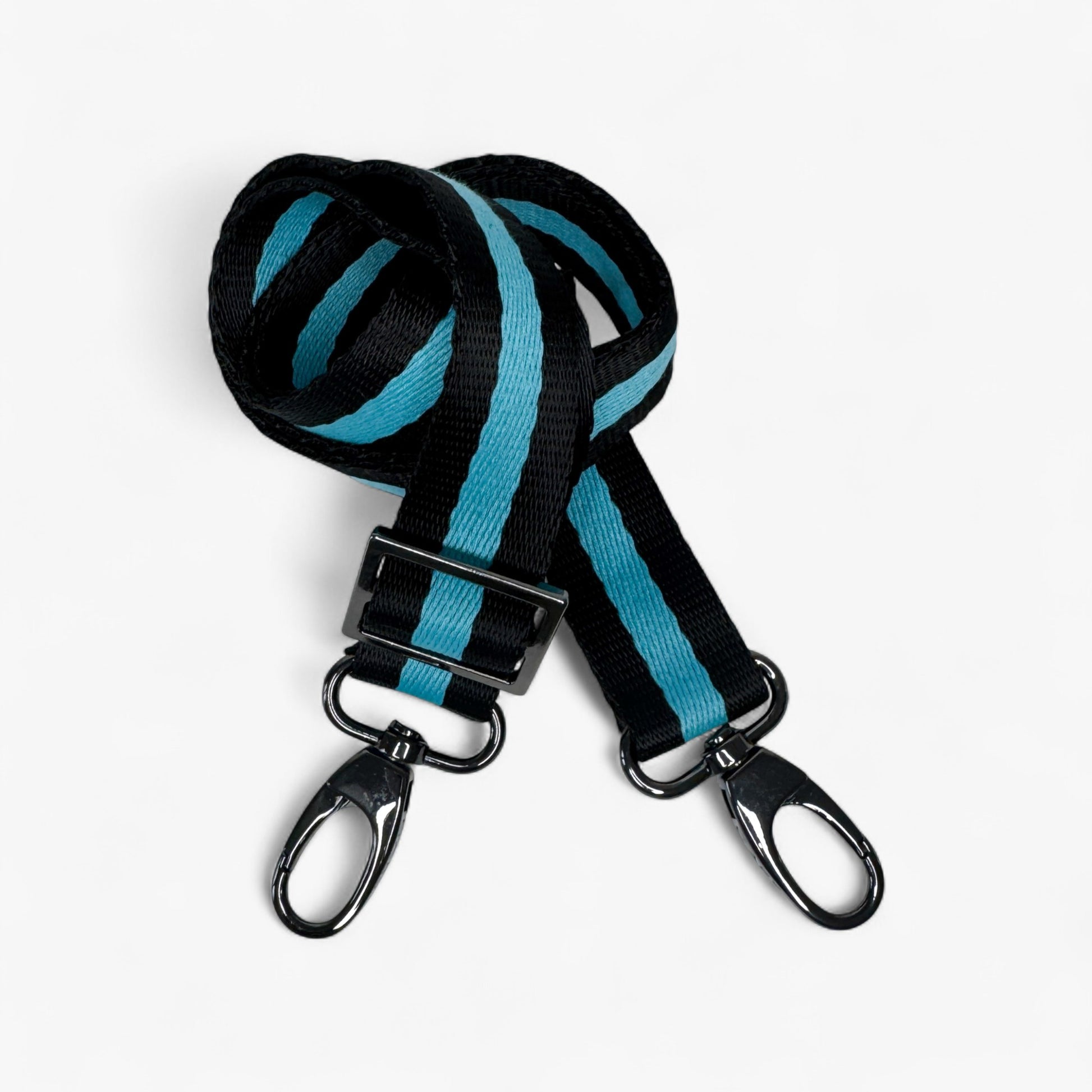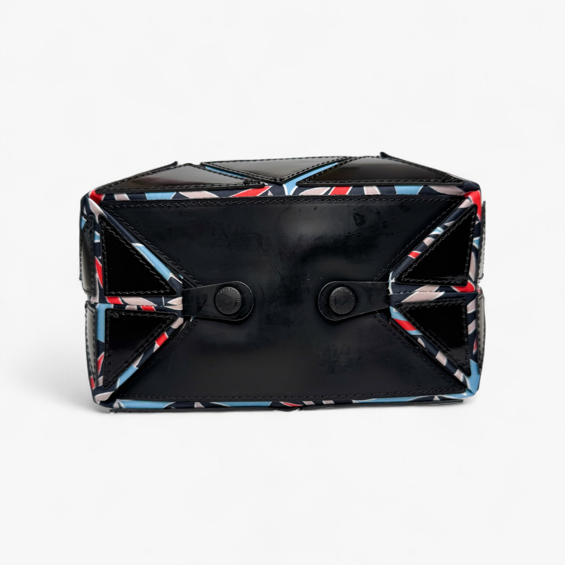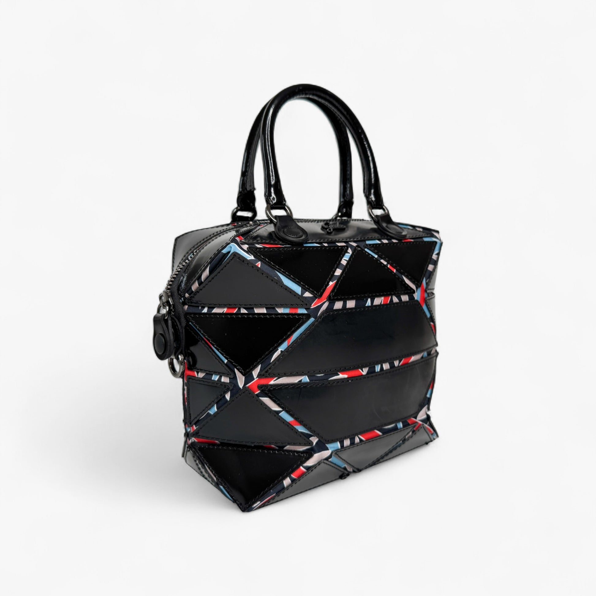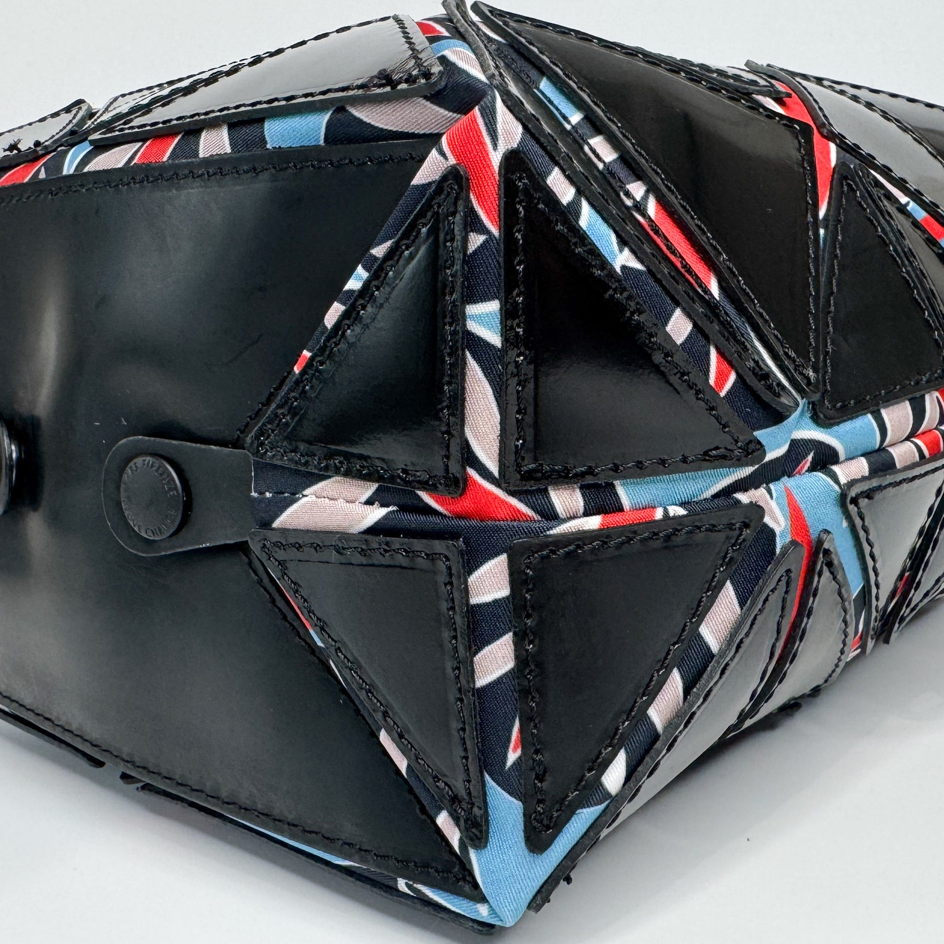 Details: Gabs Italy convertible shopper tote bag crafted with black glossy leather panels over a colourful textile base. Features a versatile design that converts from a zip tote to a top handle bag and includes a detachable striped webbing strap for crossbody wear. Finished with signature Gabs branding.