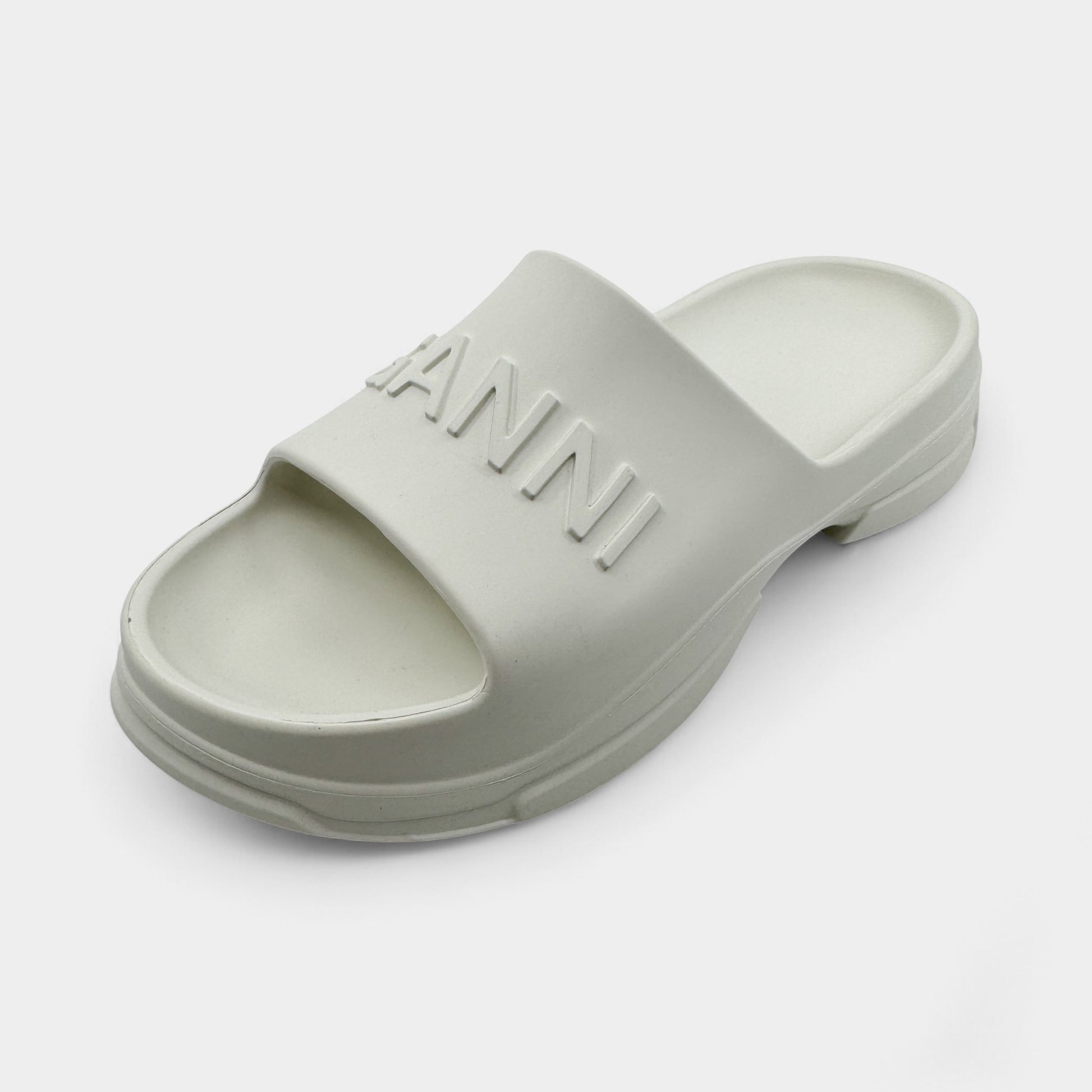 Details: Ganni slide made of creamy-white coloured sugarcane resin, with an embossed Ganni logo on the front. Sole height 4 cm.