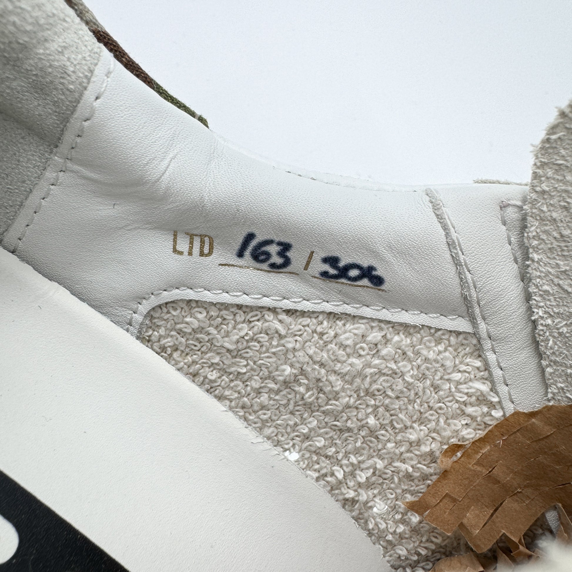 Details: Classic Golden Goose Private EDT sneakers crafted from white distressed leather with pink star and turquoise blue laces. Limited edition number 163 of 306.