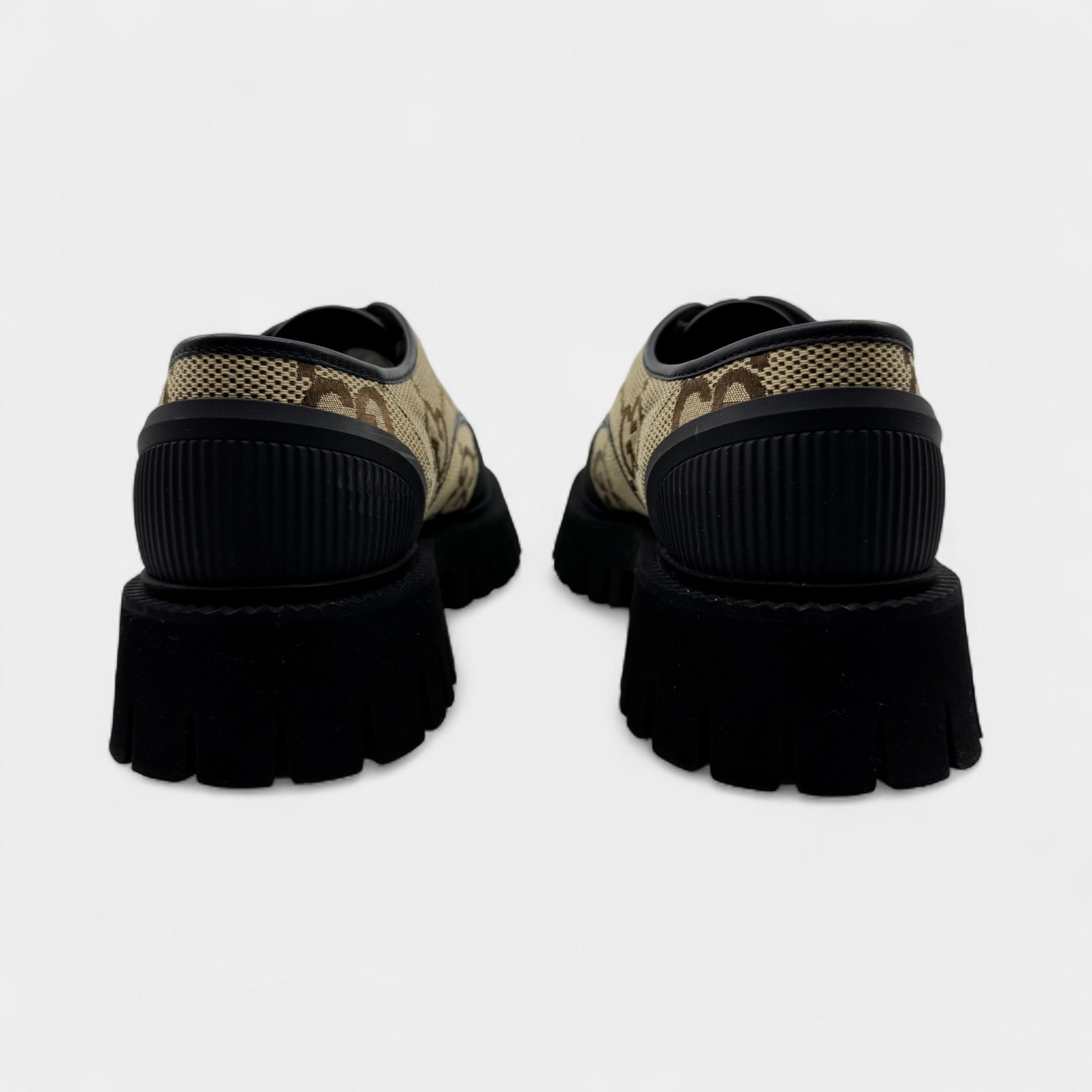 Details: Gucci Maxi GG lace-up Derby shoes are modern take on a classic silhouette. Fabricated from canvas and leather, they sit atop a chunky rubber outsole and feature a ribbed rubber toe and heel cap. Made in Italy.