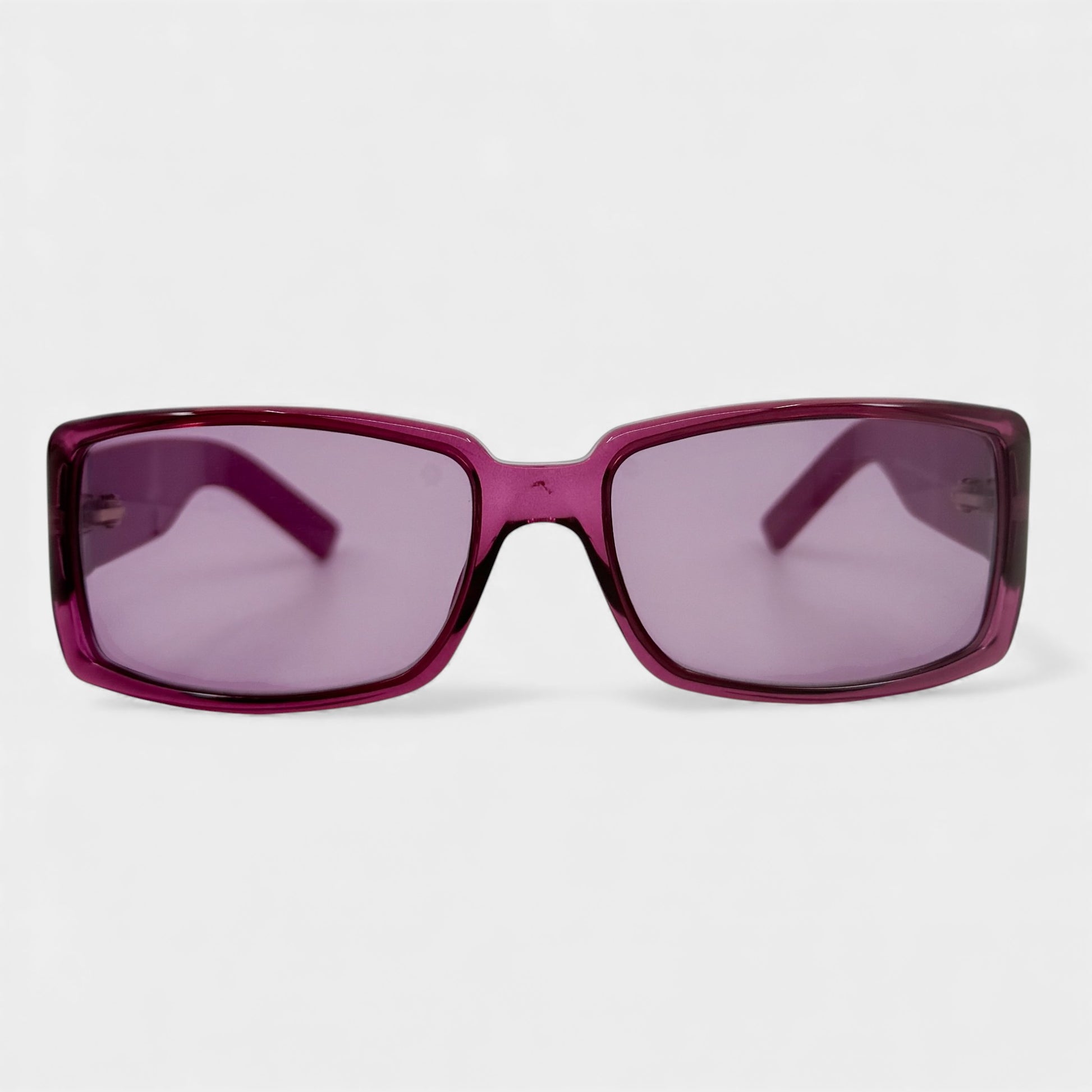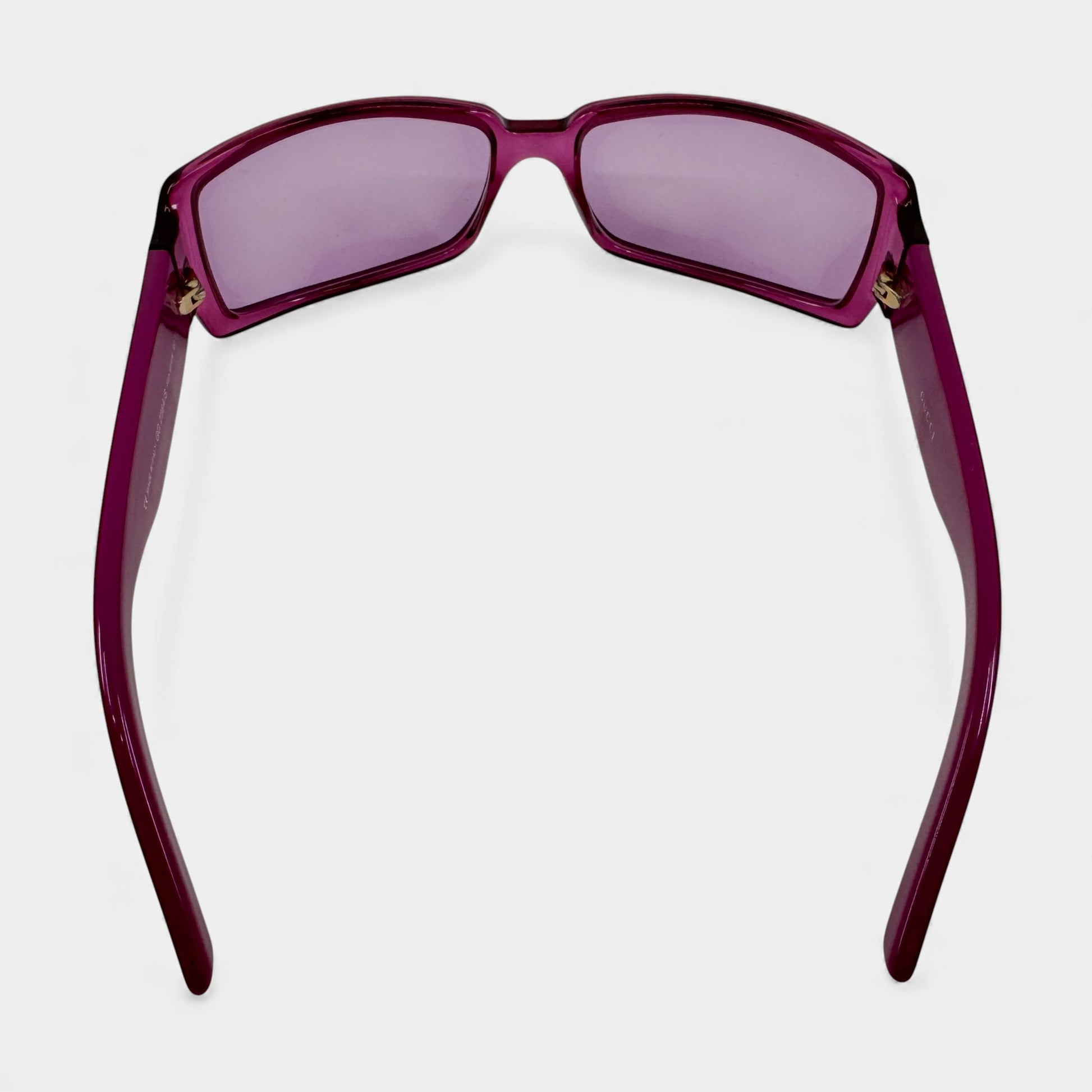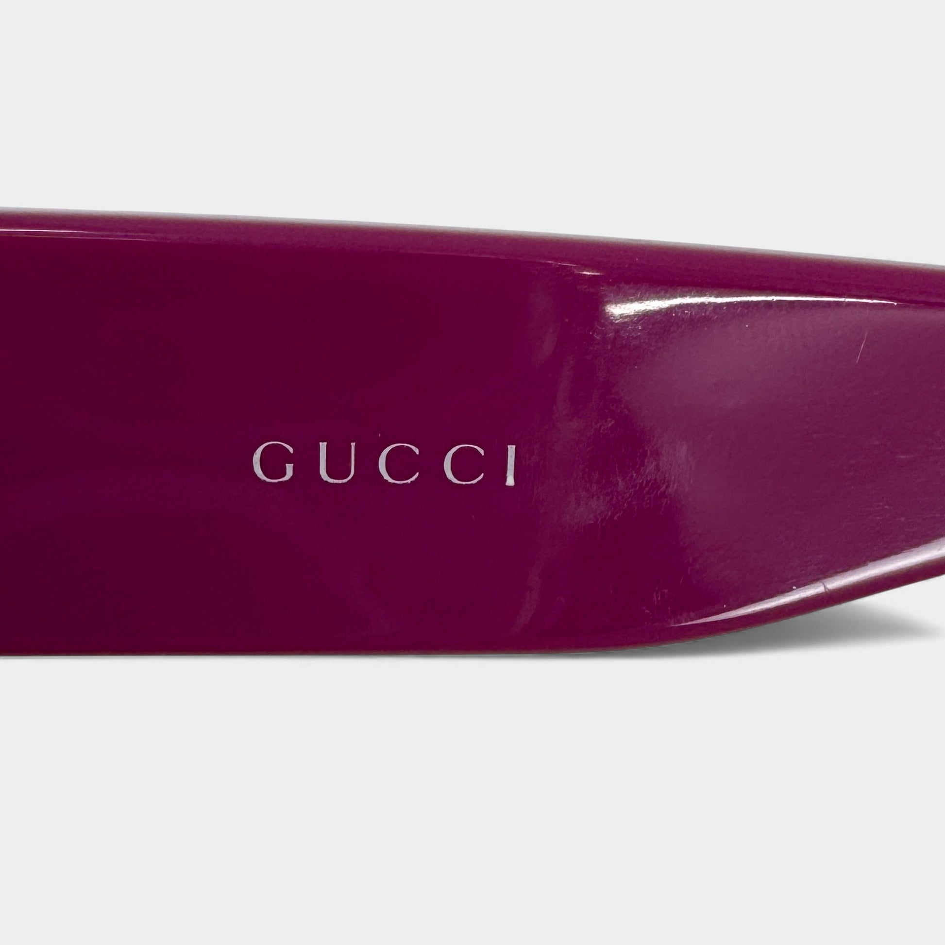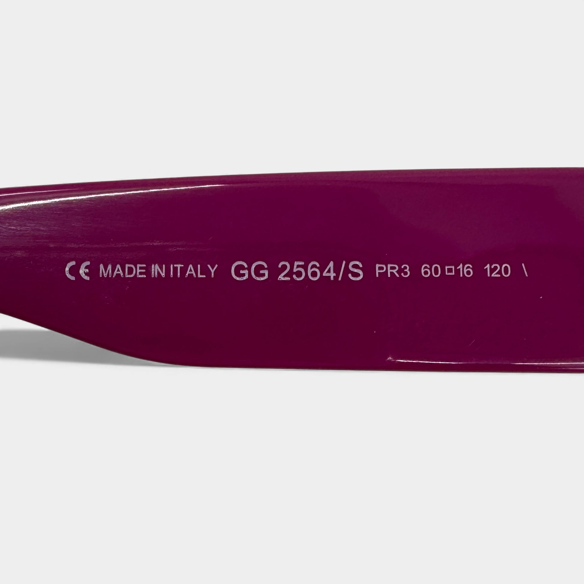 Details: Gucci Vintage Fuchsia Pink Gradient Sunglasses (Style GG2564/S). Made in Italy. Bold rectangular design in glossy fuchsia acetate with pink gradient lenses. Features signature gold interlocking GG logo hardware at each temple — a standout statement piece from Gucci’s early 2000s collection.