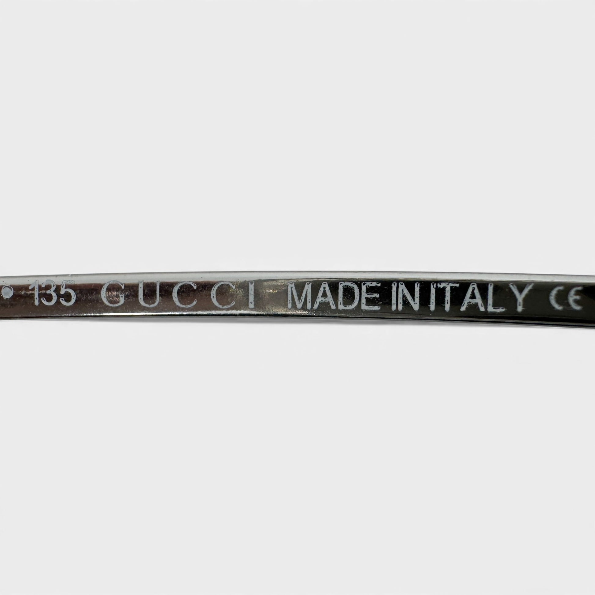 Details: Gucci Vintage Lilac Gradient Frameless Sunglasses (Style GG1715/S). Made in Italy. Elegant frameless design with lilac-to-clear gradient lenses and fine silver-tone metal arms. Lightweight and refined with subtle Gucci branding at the temples.
