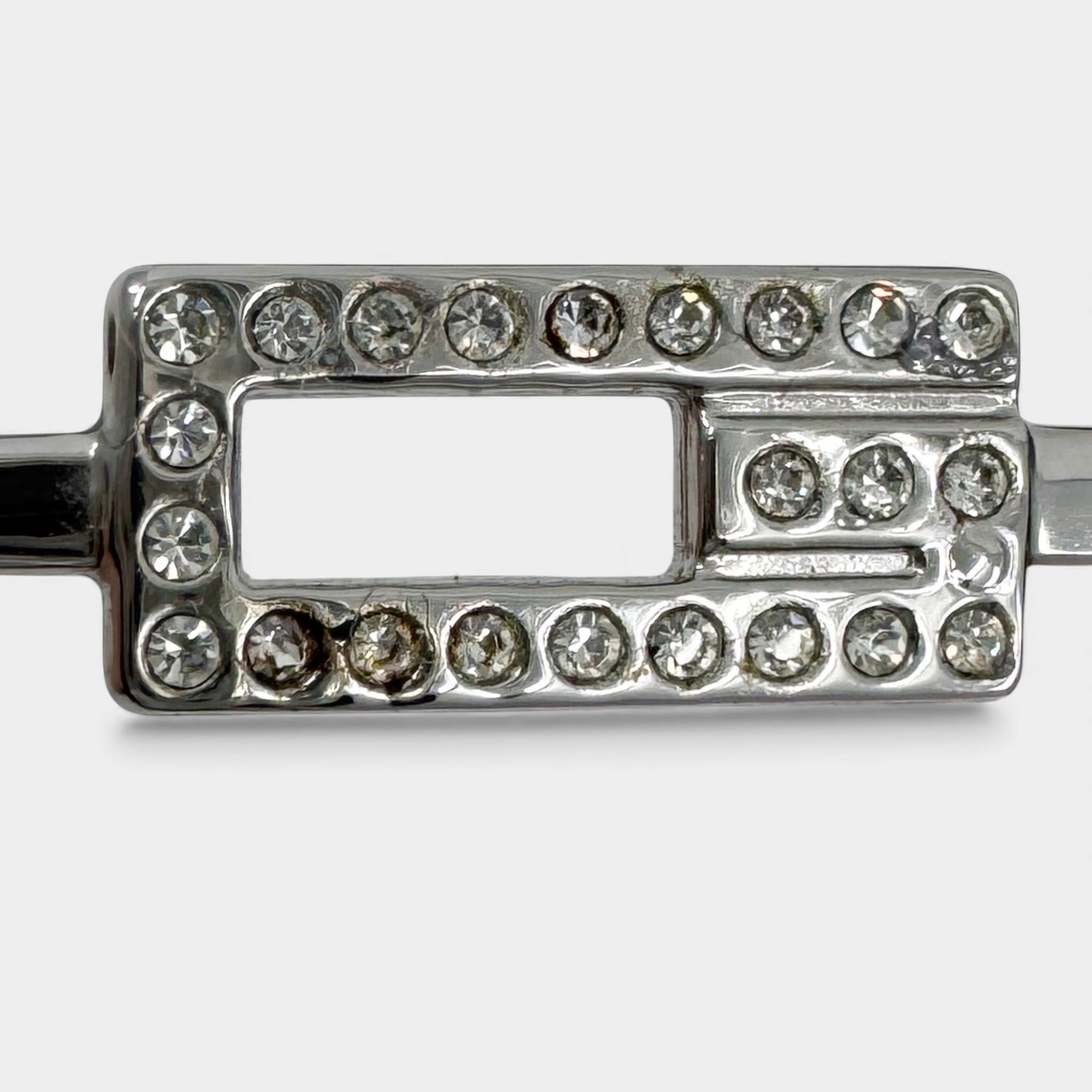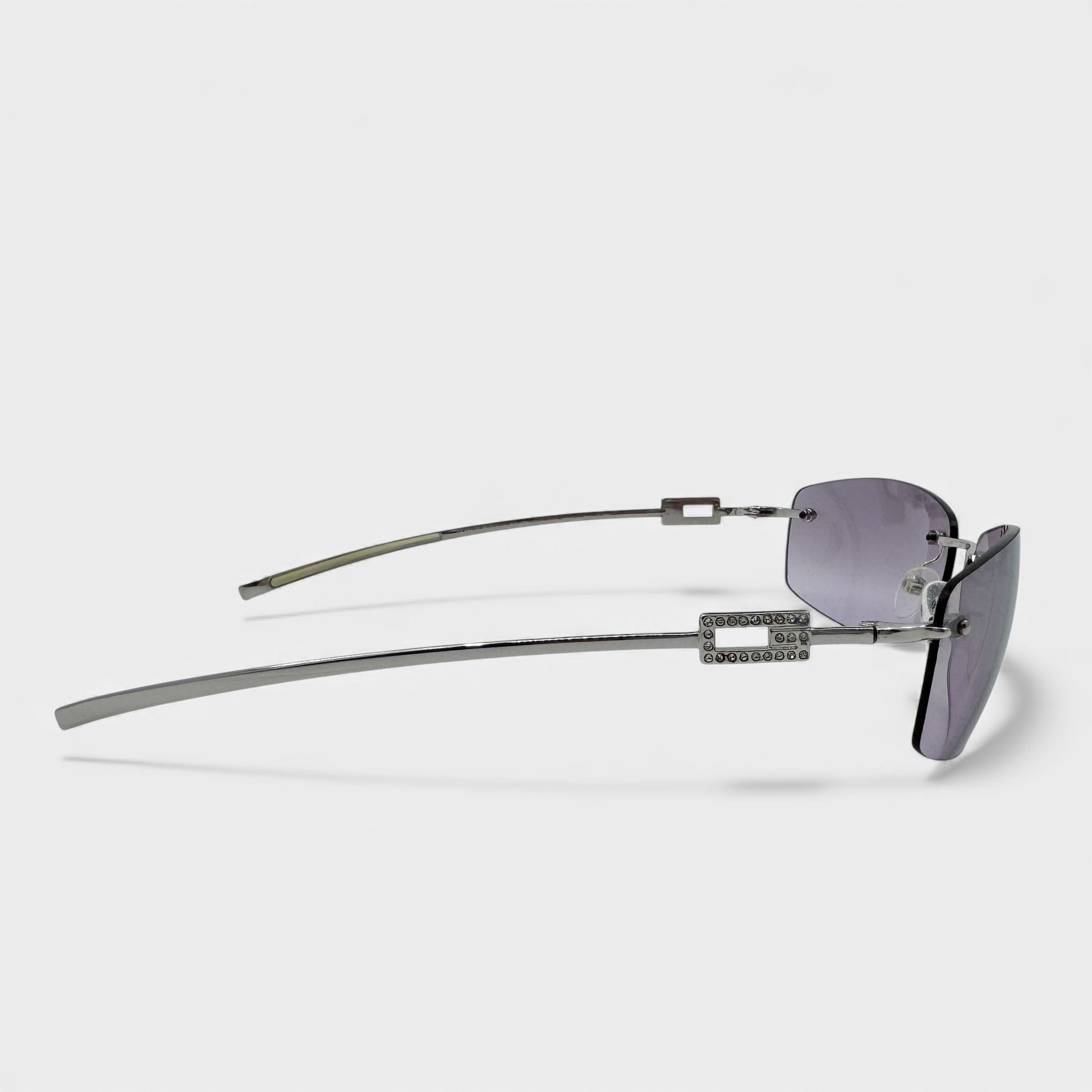Gucci Vintage Rimless Purple Strass Logo Sunglasses (Style GG1784/S). Made in Italy. Elegant rimless design with purple-tinted lenses and fine silver-tone metal frames. Features diamante-studded Gucci logo detailing at each temple — a sophisticated and glamorous vintage piece.