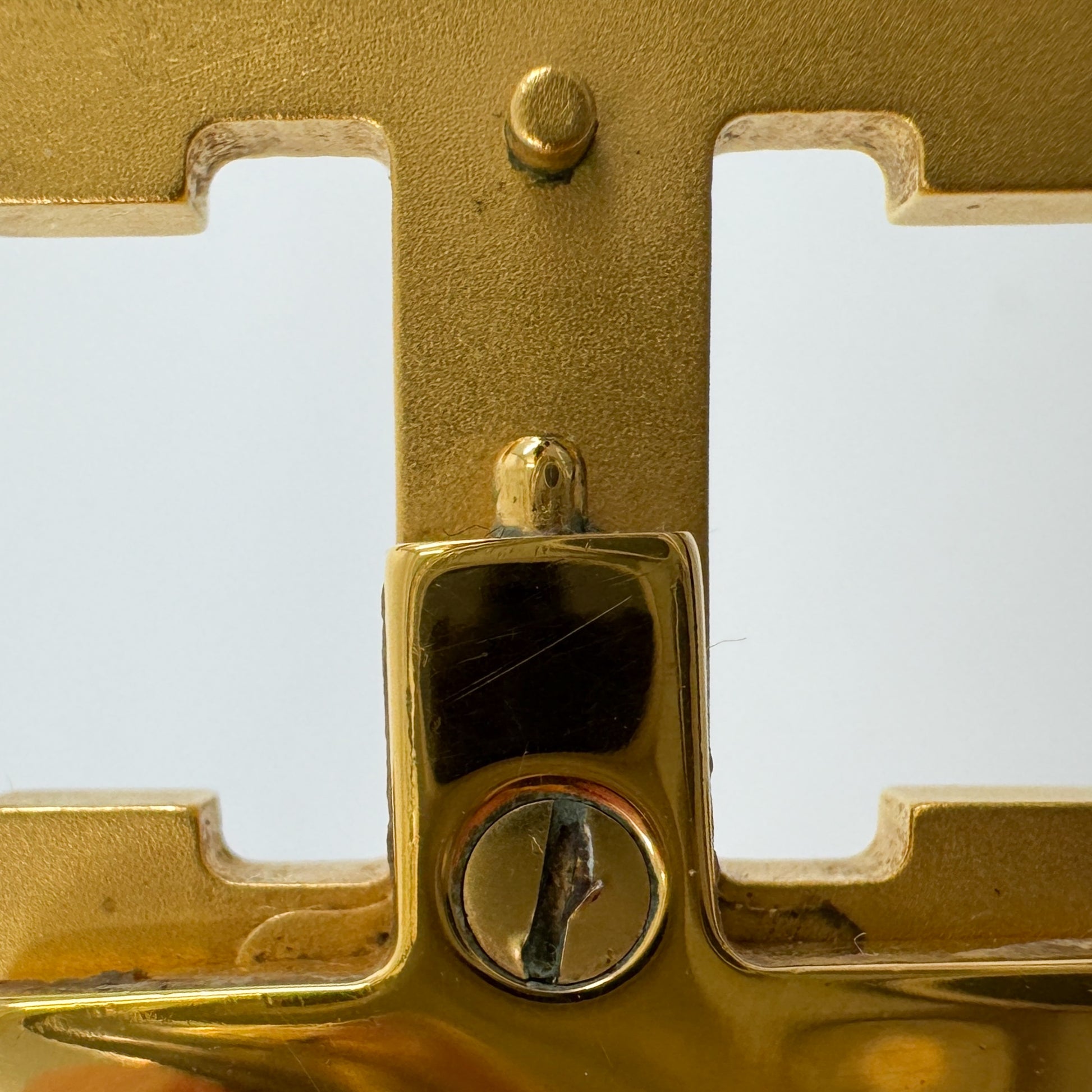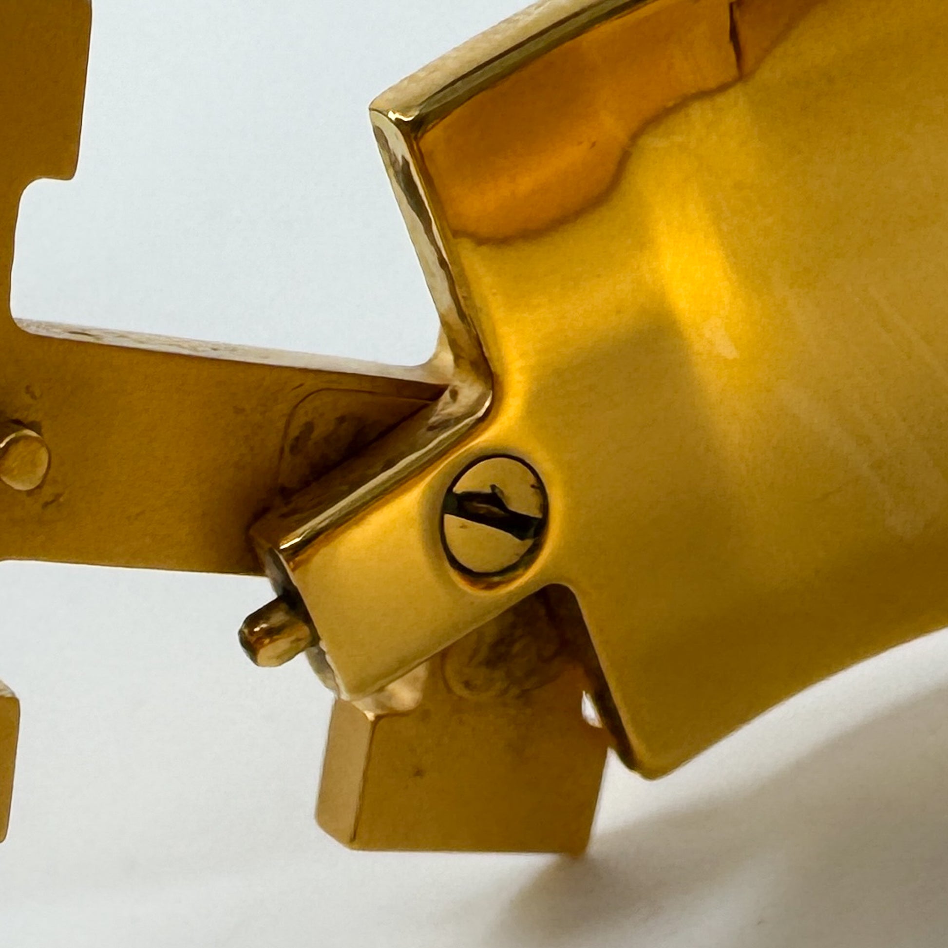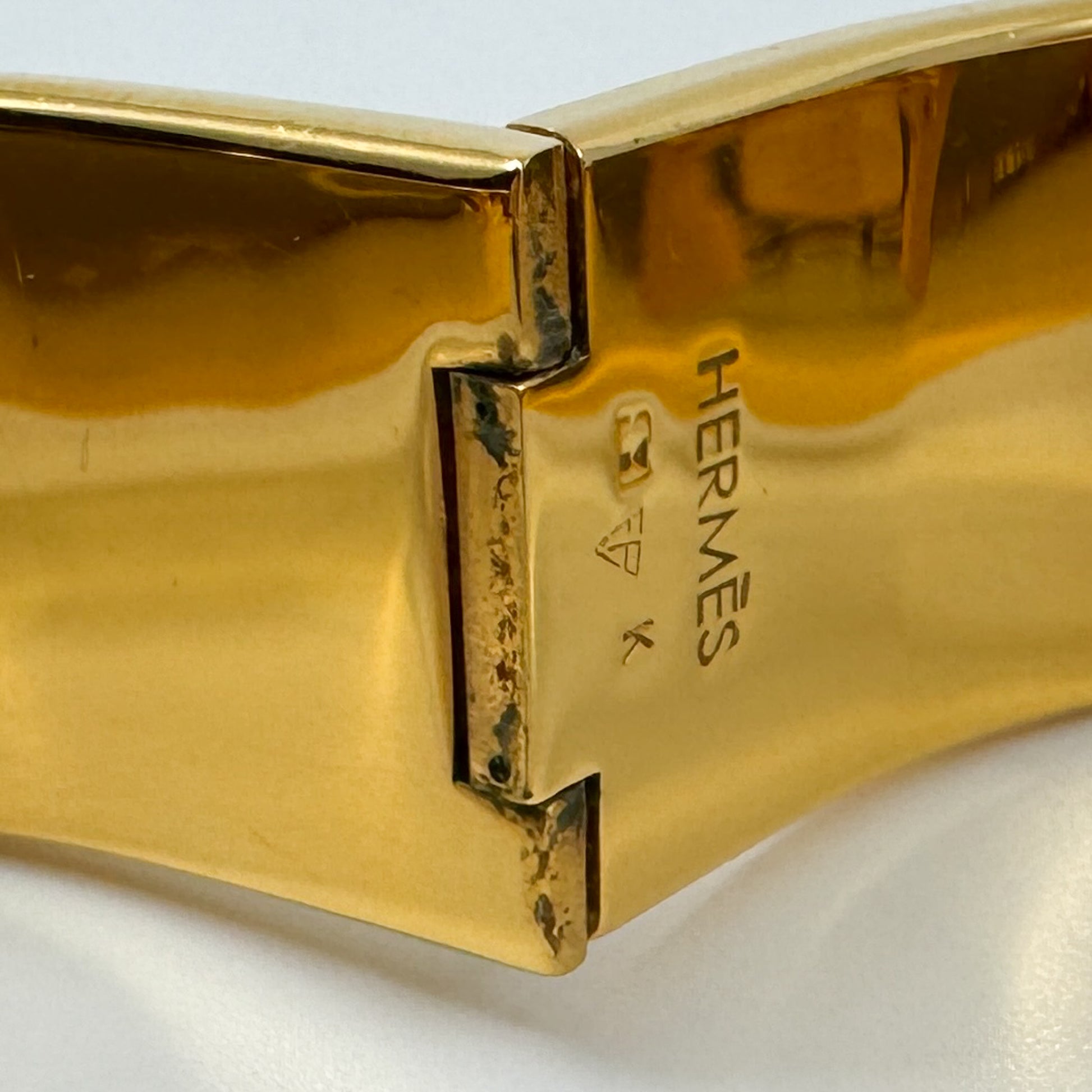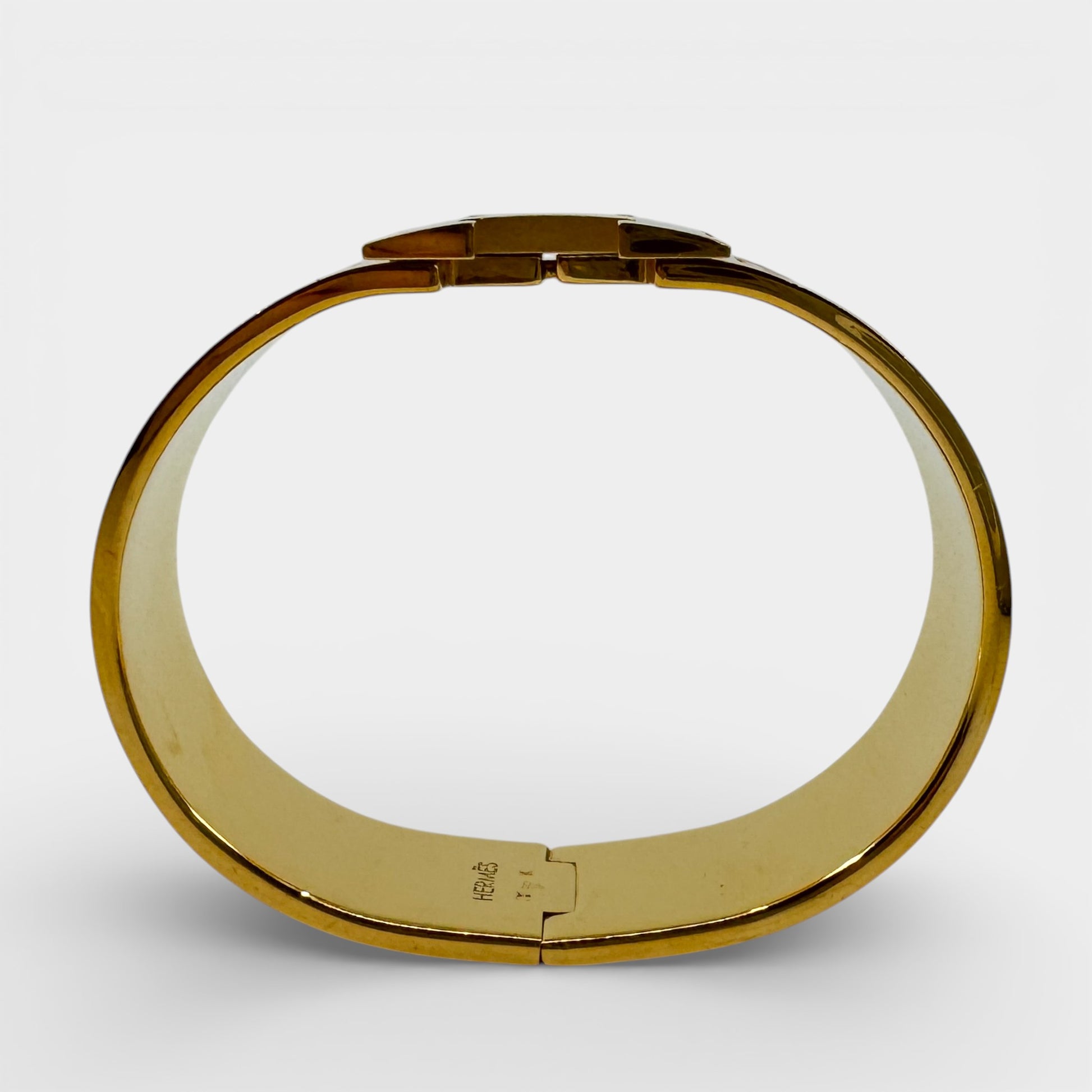 Details: Hermès Clic-Clac H PM wide bangle in iconic Hermès orange enamel with a yellow gold-plated finish. This signature hinged design closes with the classic “H” clasp. The little ritual is half the charm: slide it on, press the ends together, rotate the H until it sits straight… and click. Made in France. Authenticated in-house by our expert team and supported by third-party authentication from LegitGrails.
