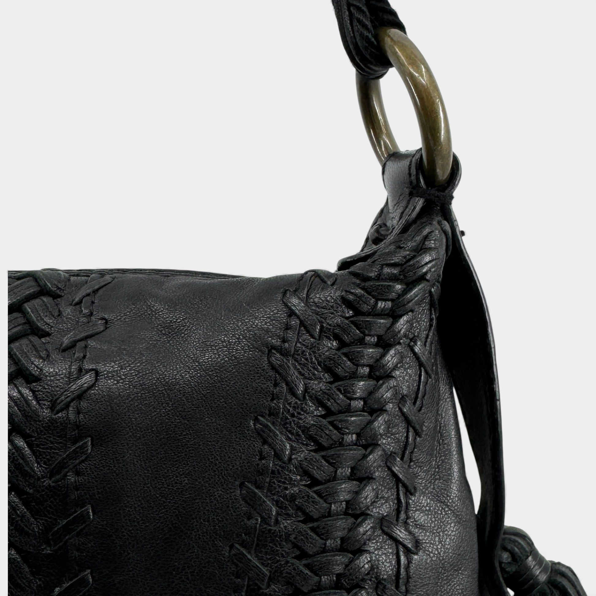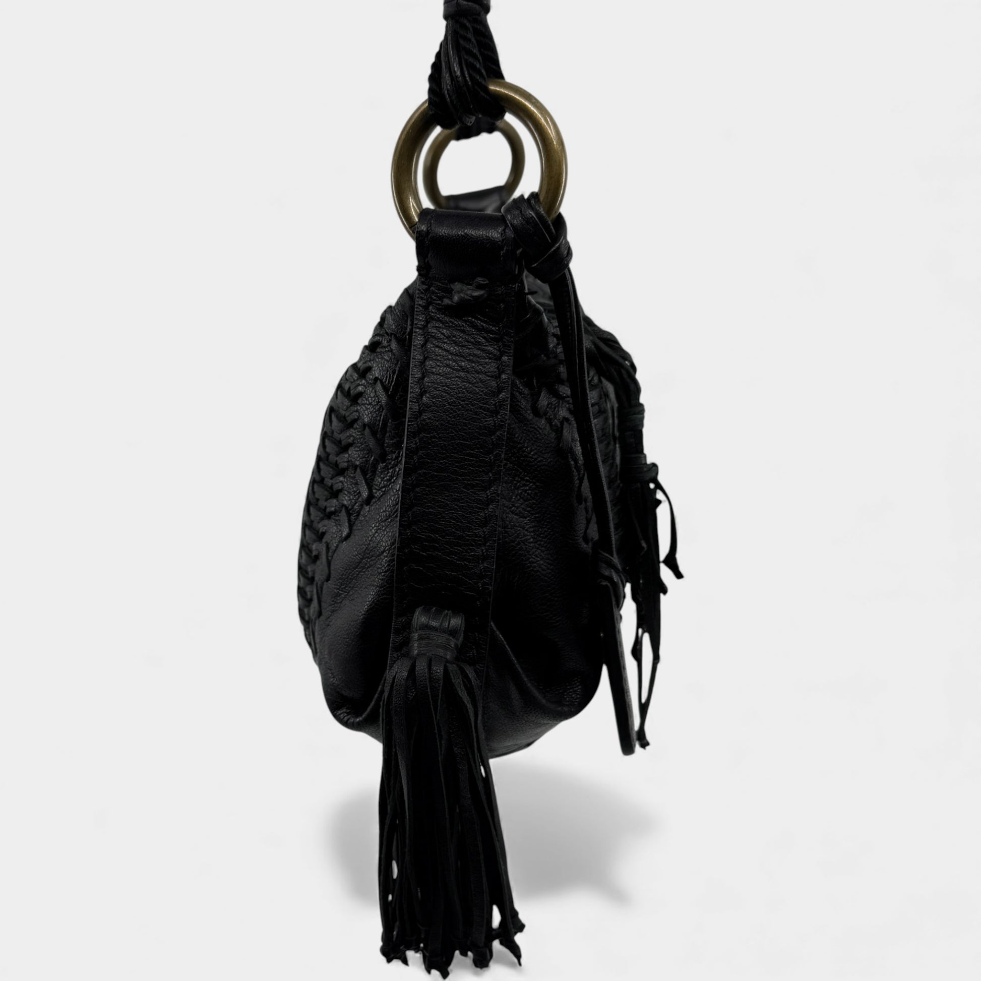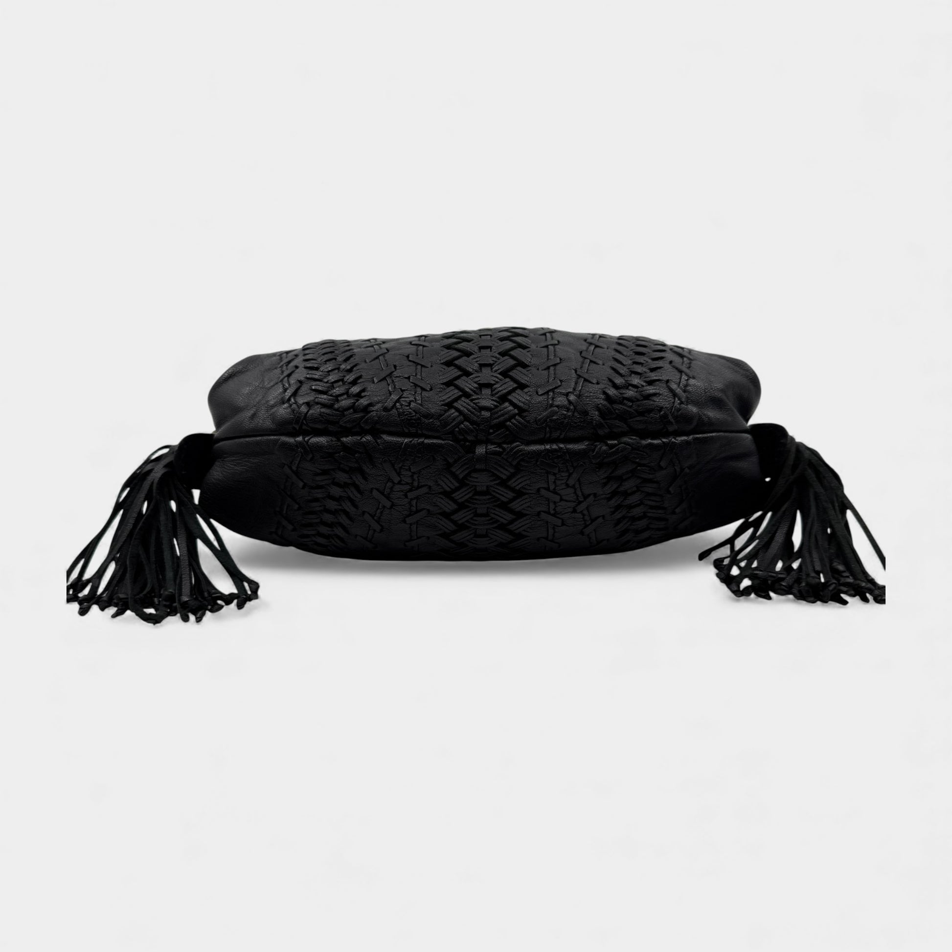 Isabella Fiore Black Woven Leather Tassel Boho Shoulder Bag