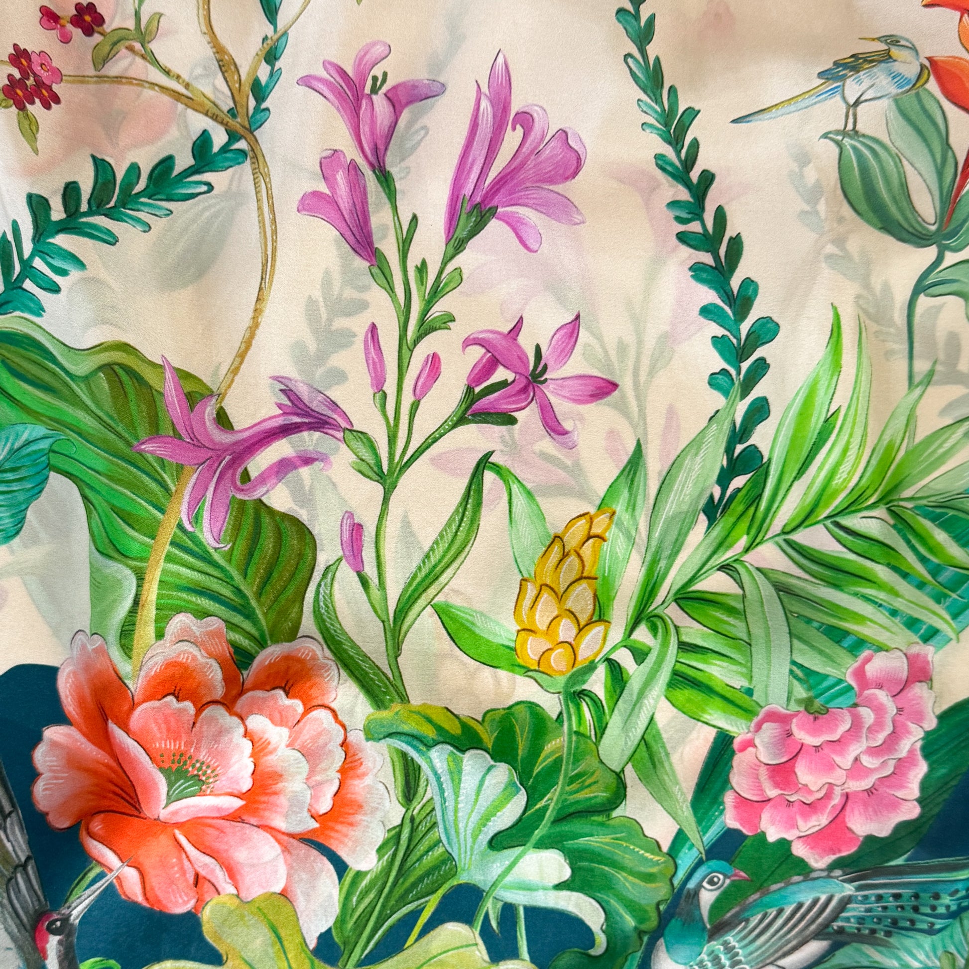 Details: Johnny Was Arya pants in multicolour D’Amour floral print silk. Wide-leg silhouette with elasticated waistband, front and back box pleating, partial lining, and slip pockets at the hips. Flowing design offers a comfortable yet elevated look, ideal paired with a coordinating silk cami.