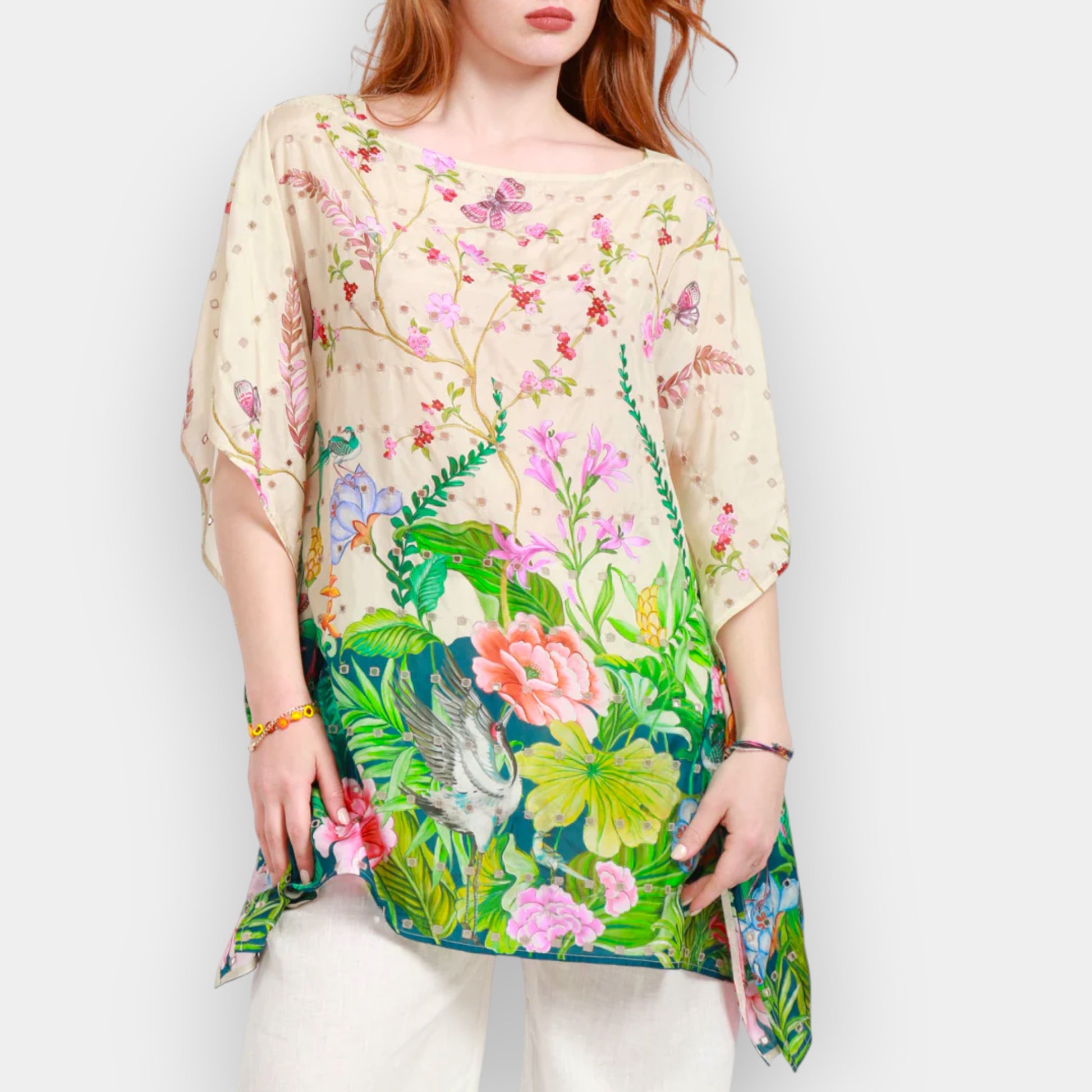 Details: A colourful, nature-inspired poncho top from Johnny Was with a flowing silhouette and dramatic cascading sleeves. Features allover eyelet detailing and a relaxed fit for effortless layering.