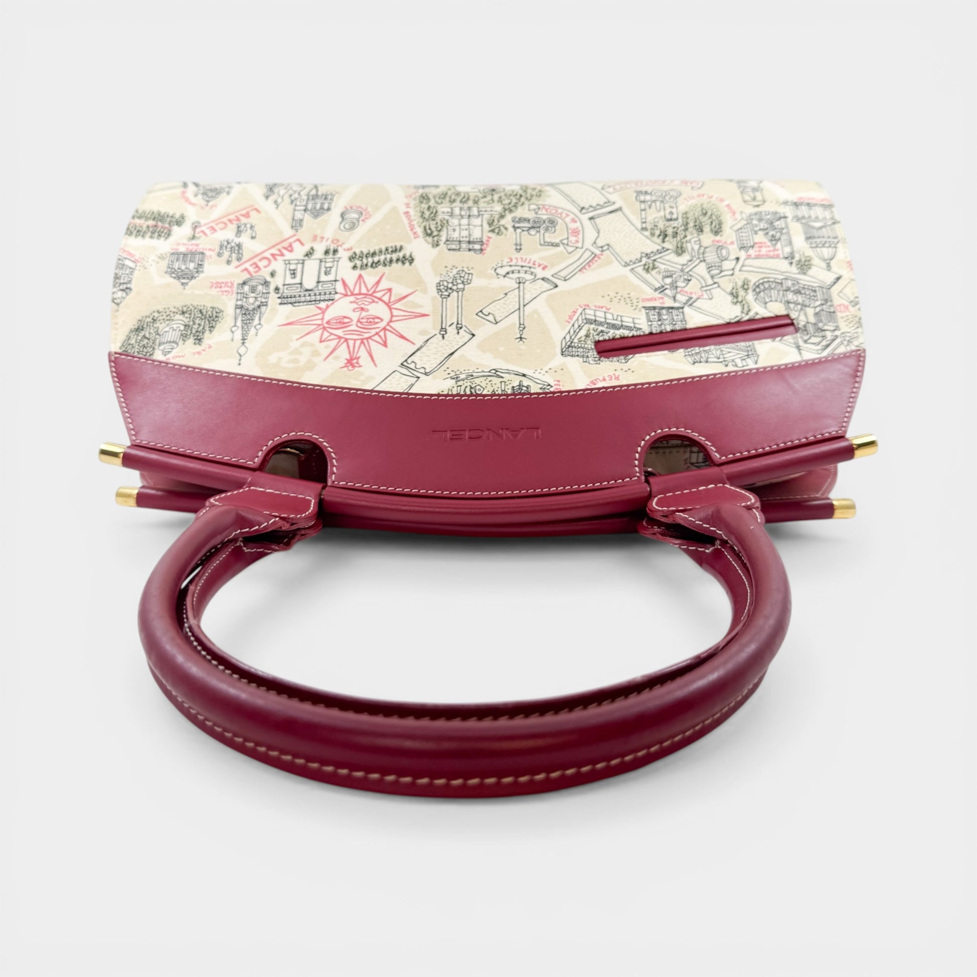 Details: Lancel Paris Map Print bag features a distinctive canvas body printed with an artistic map of Paris. Combination of printed canvas with leather trim and handles. Features a small exterior slip pocket, zip-top closure with a large internal lined compartment and internal zip pocket. Gold-tone hardware.
