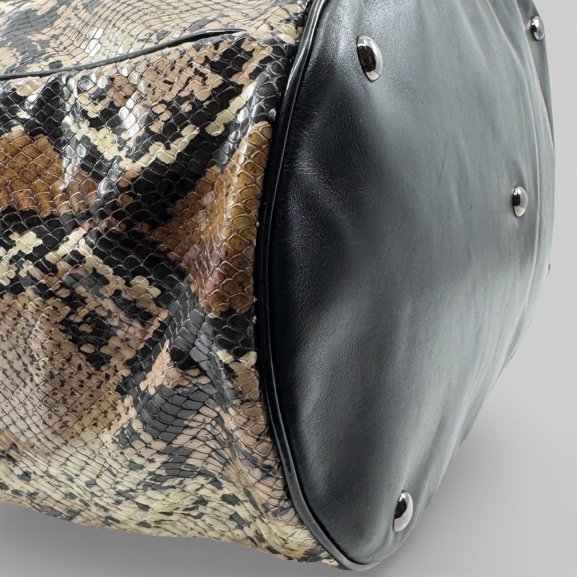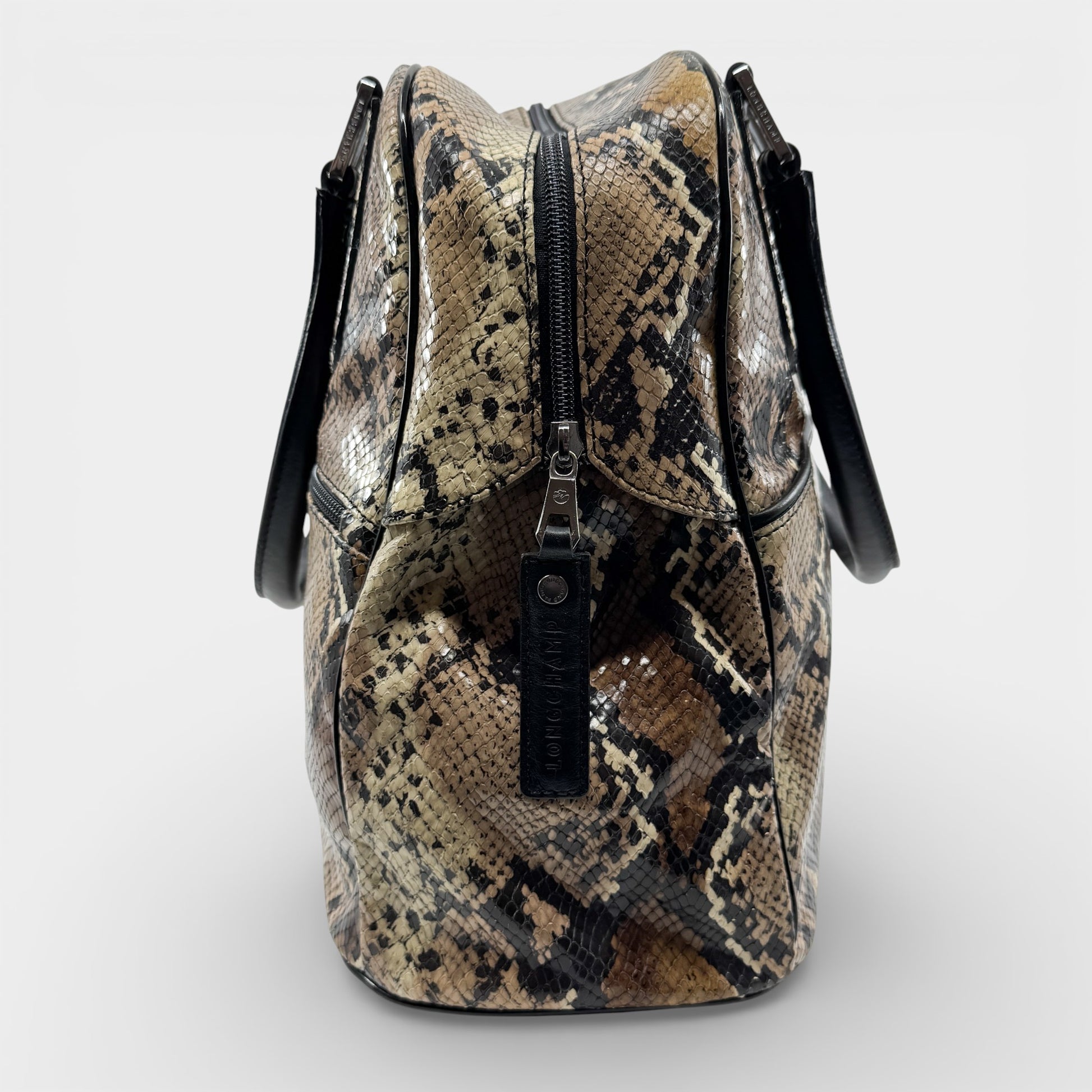 Details: Longchamp black and beige python snake embossed (cows leather) cosmos top handle bag. Light silver-gold hardware. Large internal compartment with zip pockets. Comes with Longchamp dust bag. Origin France.