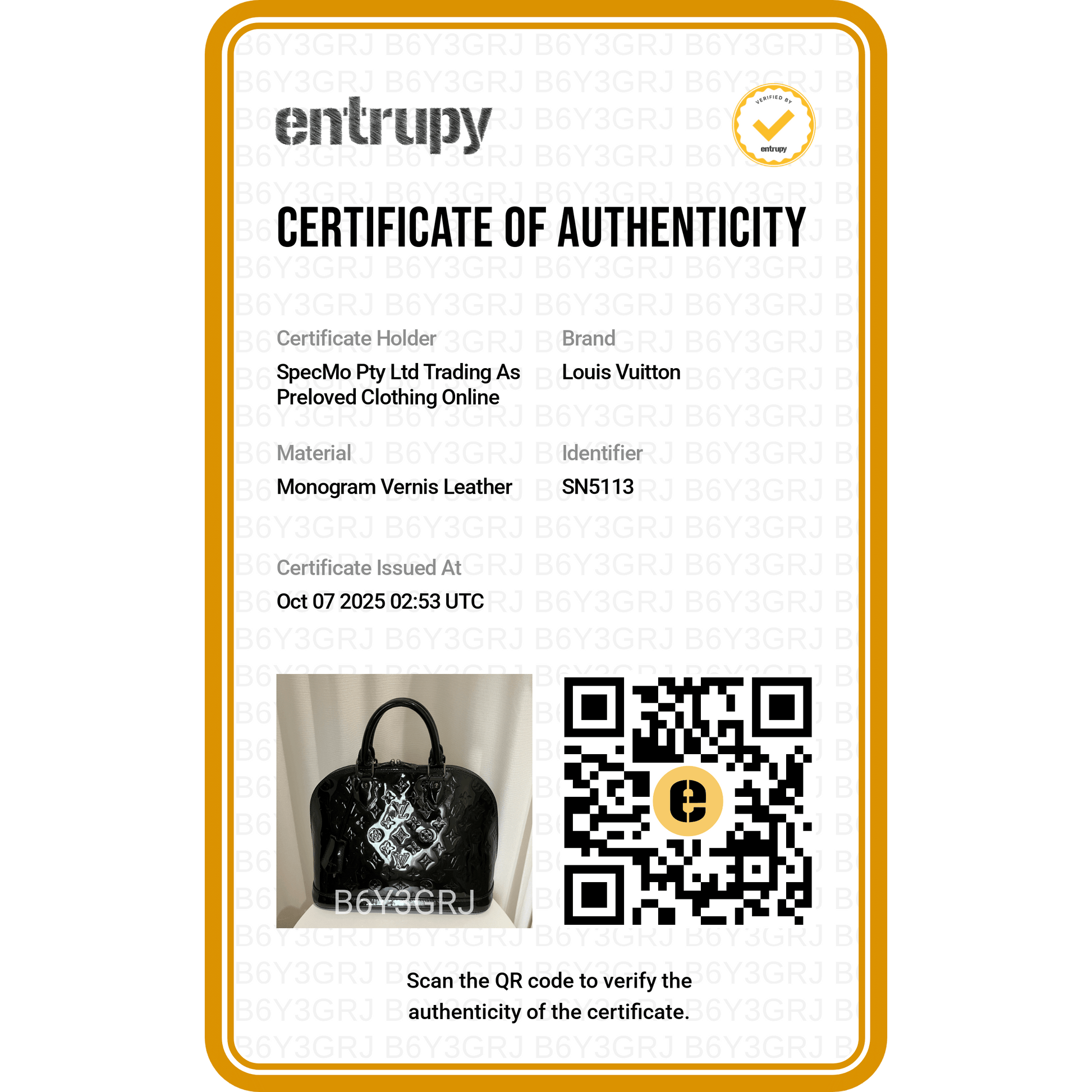Details: The Louis Vuitton Alma PM is a structured handbag originally introduced in 1934 and inspired by Art Deco design. This version is crafted from glossy black Monogram Vernis patent leather and features double rolled leather handles, dark gunmetal silver-tone hardware, and a black zip-around closure. It includes a coordinating padlock with keys and a fabric-lined interior with a slip pocket for small essentials. This model was produced in France and remains one of Louis Vuitton’s most iconic silhouettes. Date code: SN5113, made in France in 2013. No dust bag, no crossbody strap.
