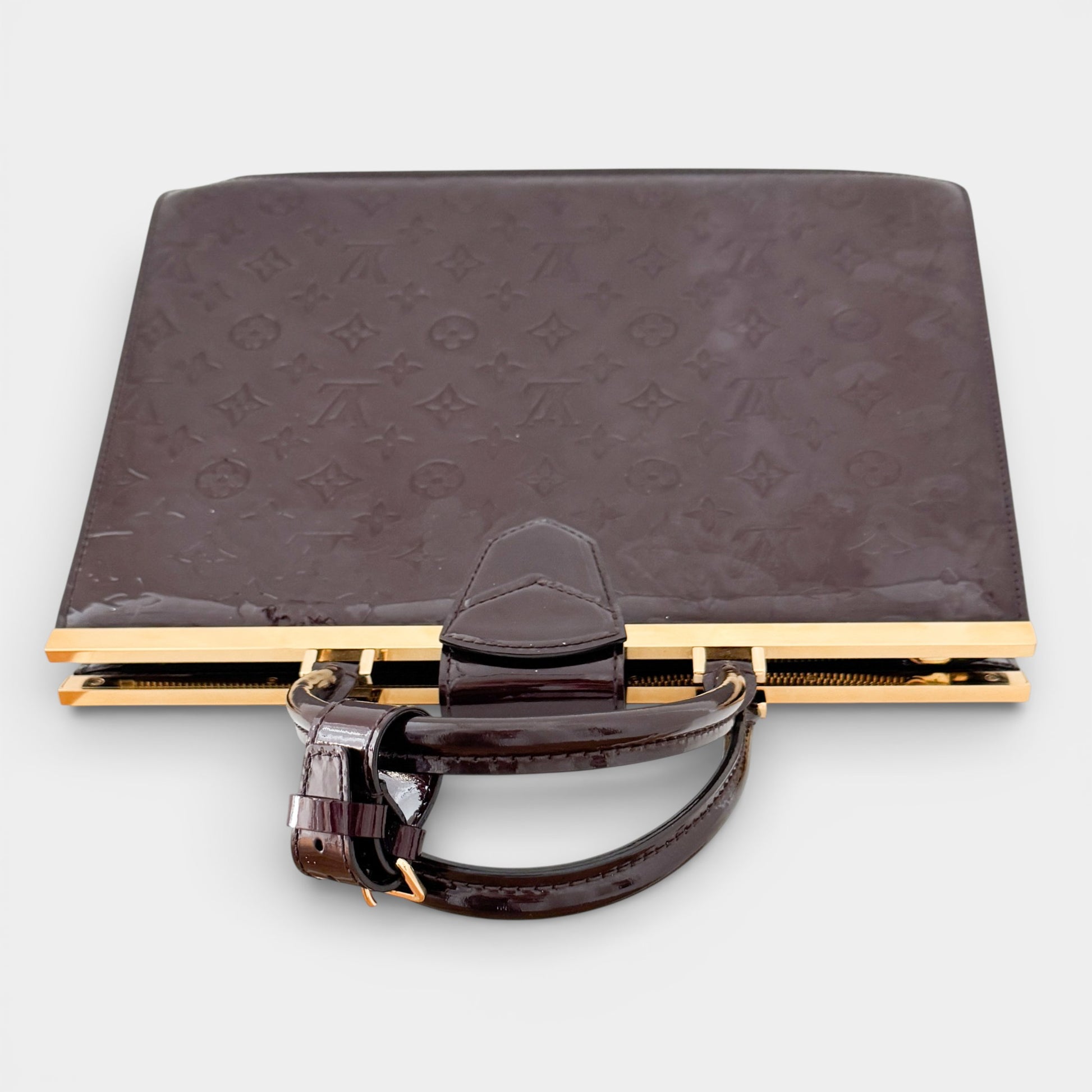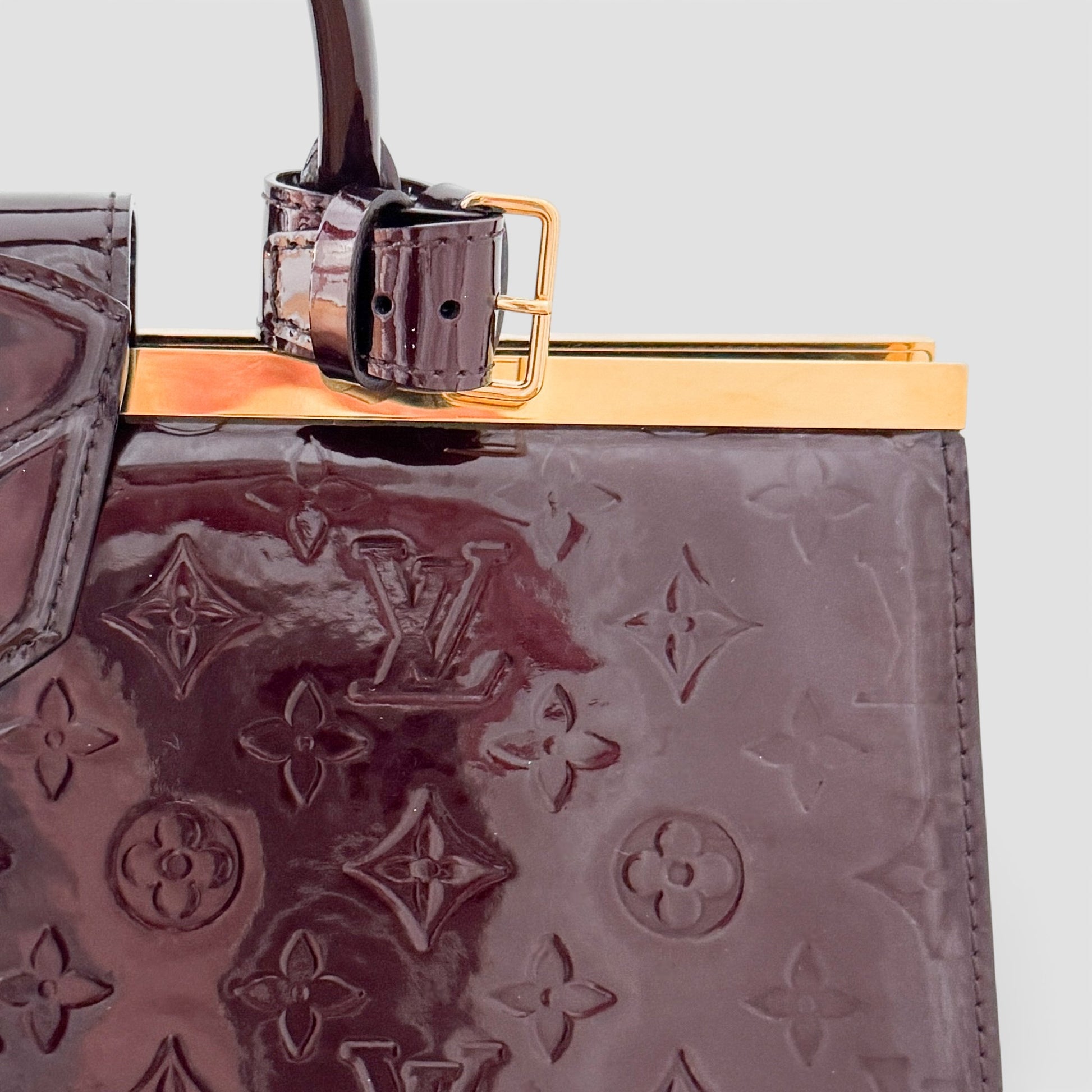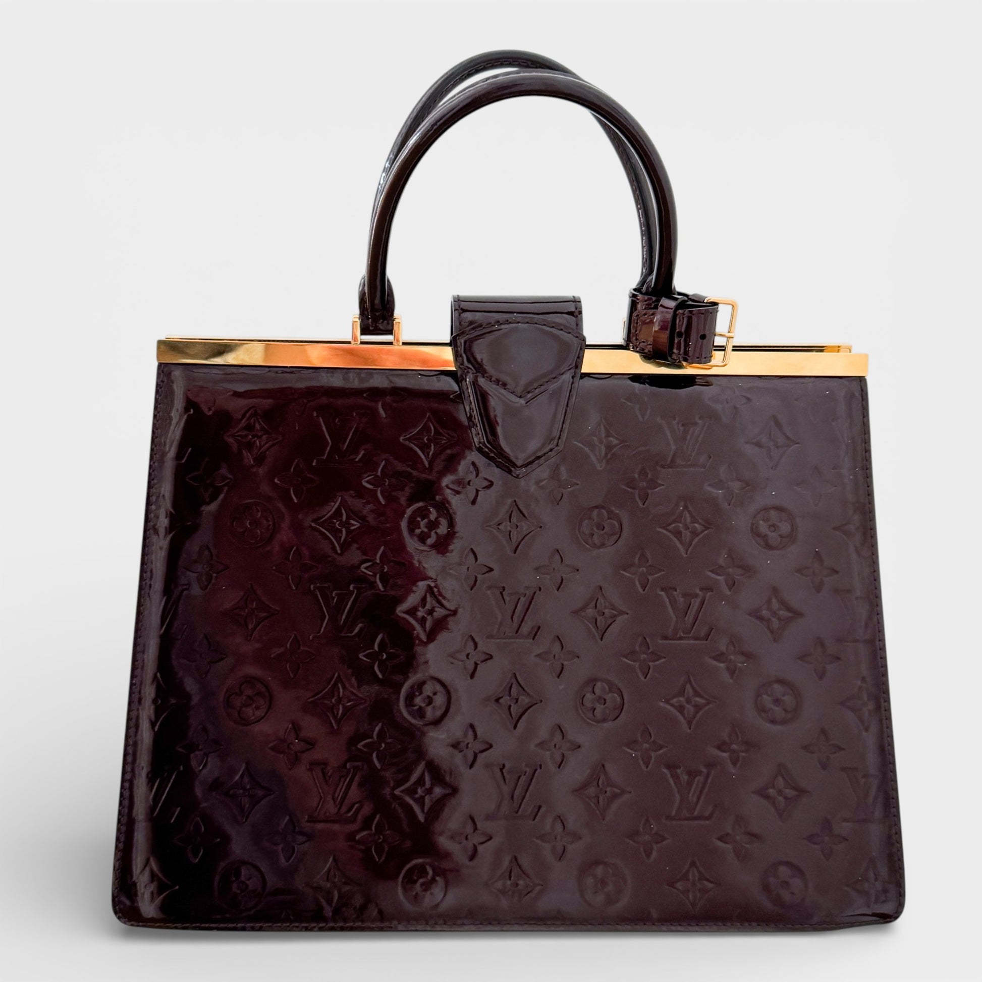 Features: Amarante monogram vernis patent leather exterior; gold tone hardware; double rolled top handles; open top with magnetic closure; tonal textile lined interior with 1 x central zipped pocket dividing the bag into two main compartments with 2 x flat pockets.