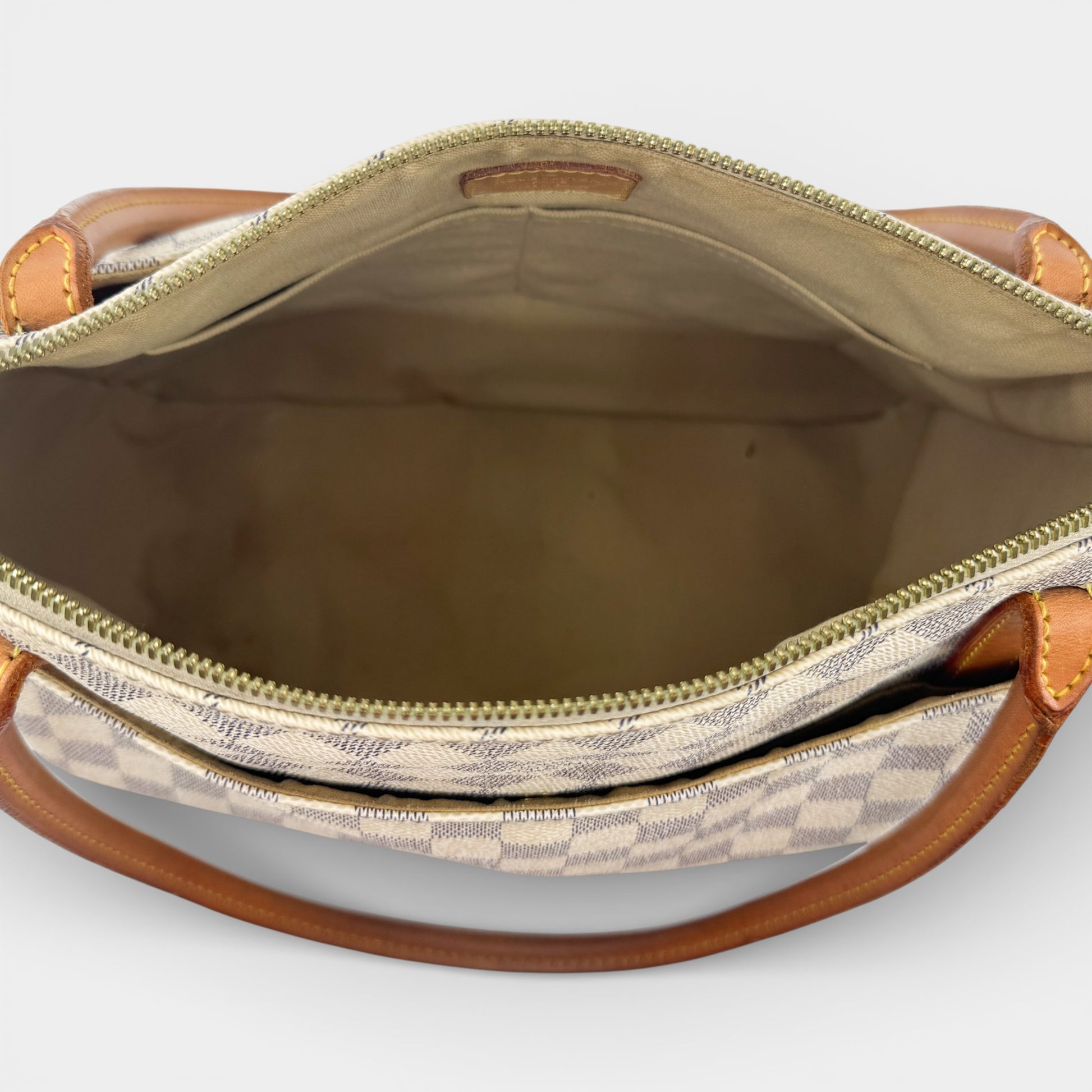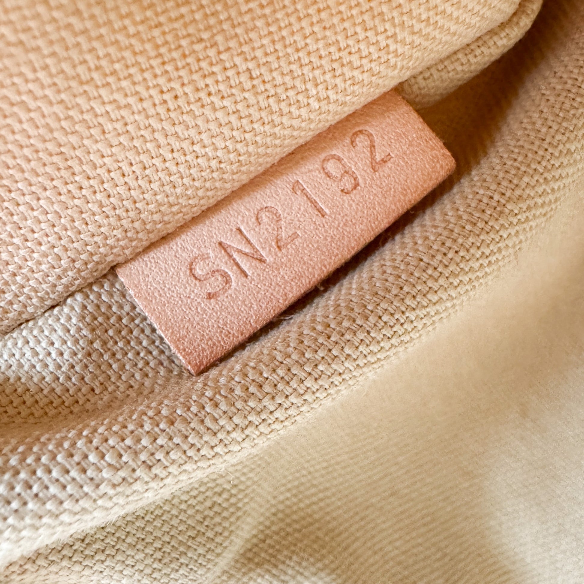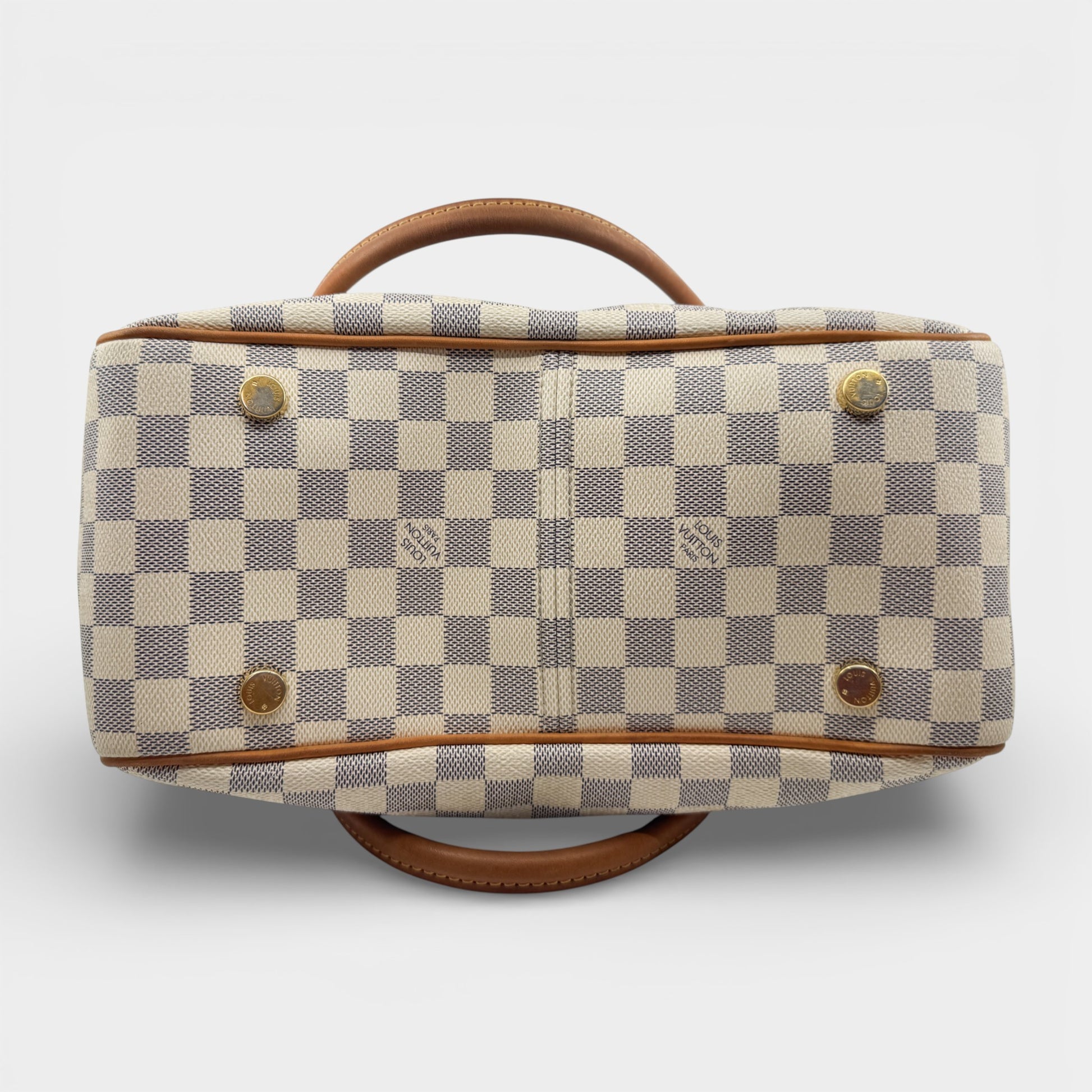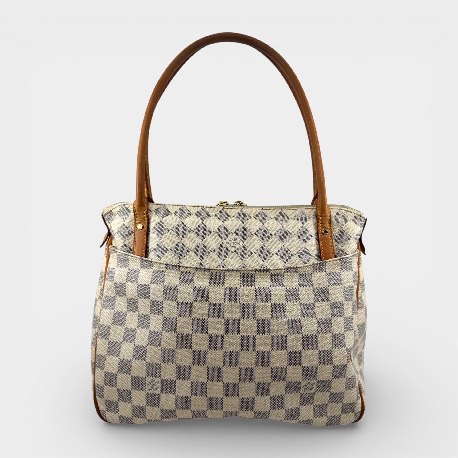 Details & Composition: Damier Azur canvas body with Vachetta leather trim, rolled Vachetta leather handles and a two-way top zip closure. Exterior front and back slip pockets and interior slip pockets. Serial Number: SN 2192 (France 2012).