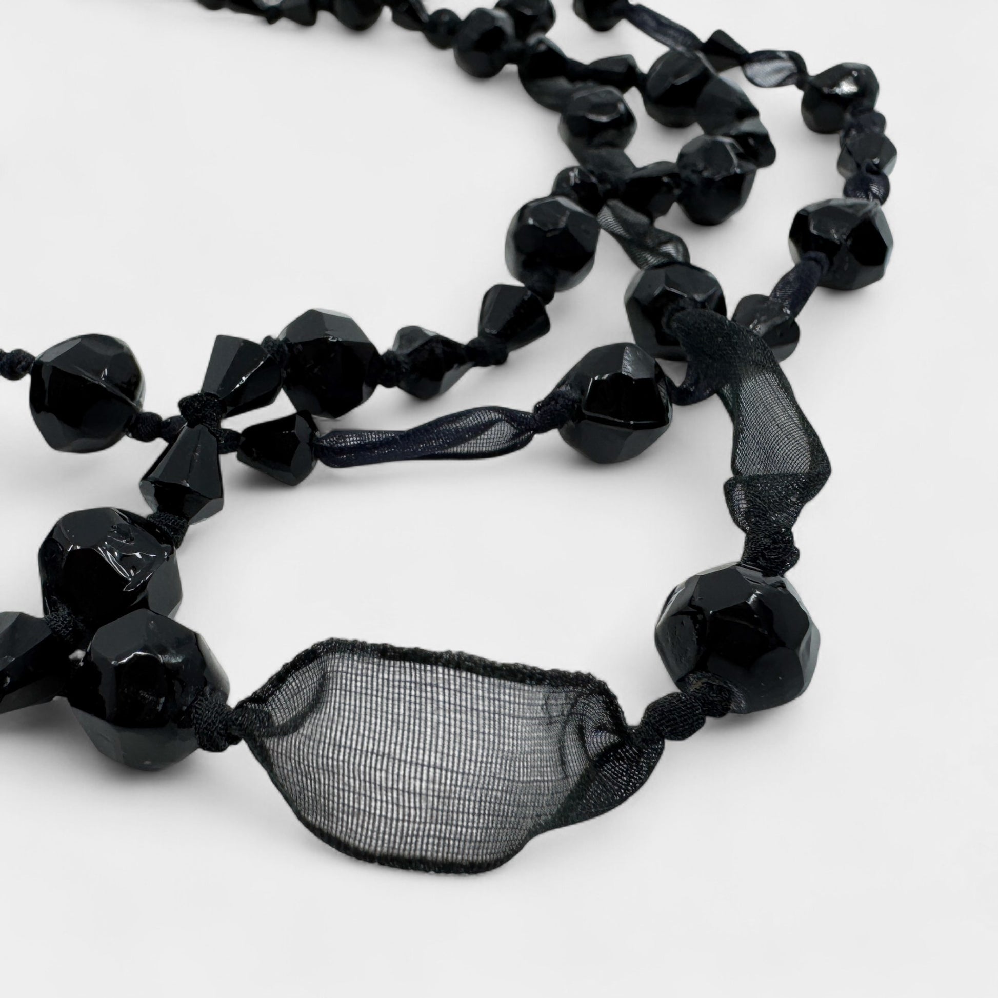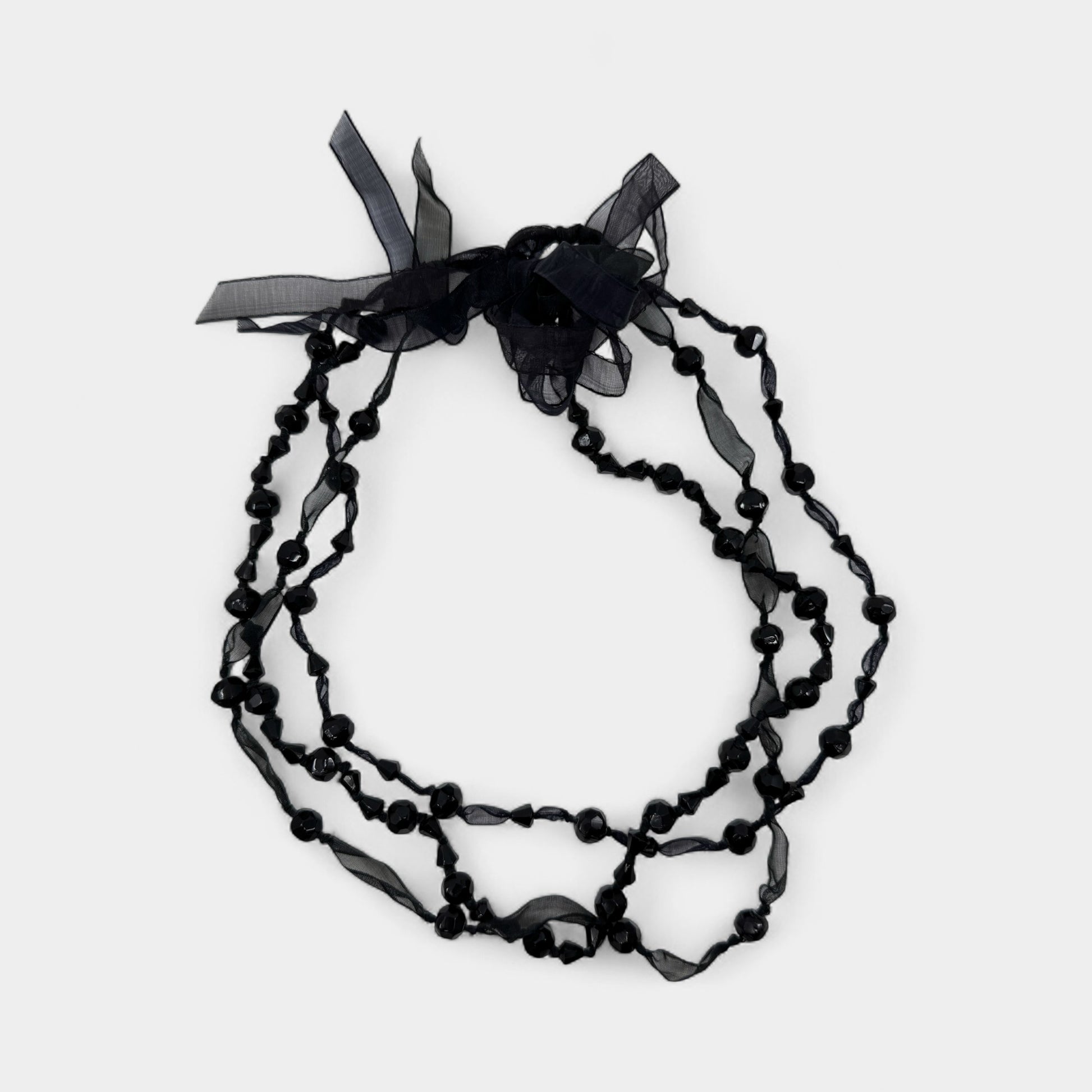 Details: Italian Murano black glass beaded necklace with ribbon. The necklace is made up of 3 strands, held together by a ribbon tie. Ties with ribbons at the back of the neck.