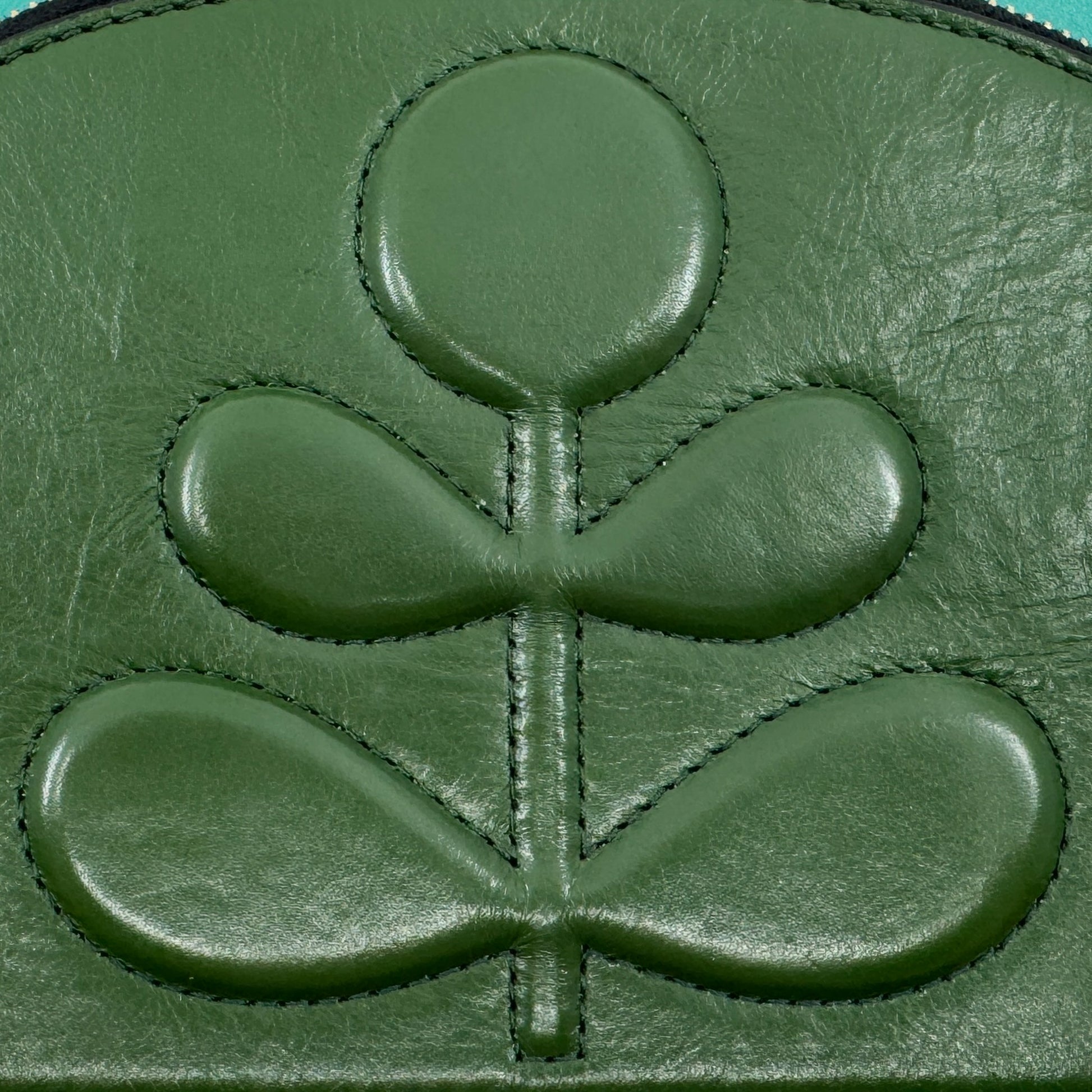 Details: Orla Kiely's renowned Portia in green and turquoise leather. Designed with practicality in mind, the Portia East offers two separate compartments to keep your essentials well organised. The soft, adjustable leather strap can be worn crossbody or shortened for shoulder wear, making it ideal for any outing. It boasts a large embossed stem on the front, an internal slip pocket, dedicated card slots, and a curved zip pocket. The Portia East is a stylish addition to any wardrobe and currently sold out oat Orla Kiely.