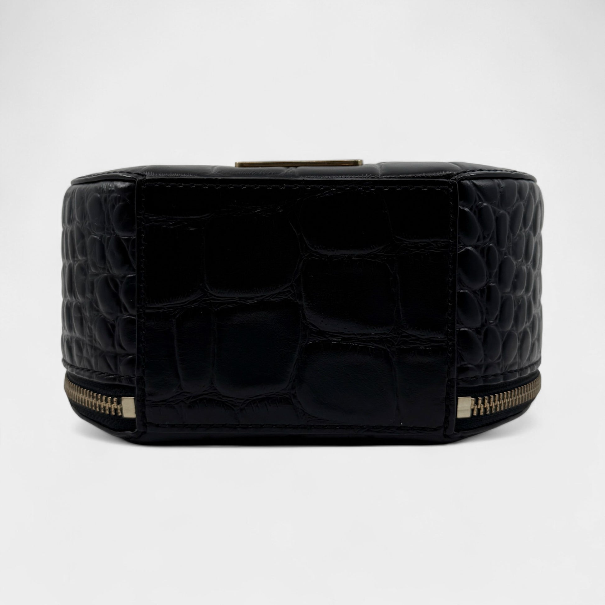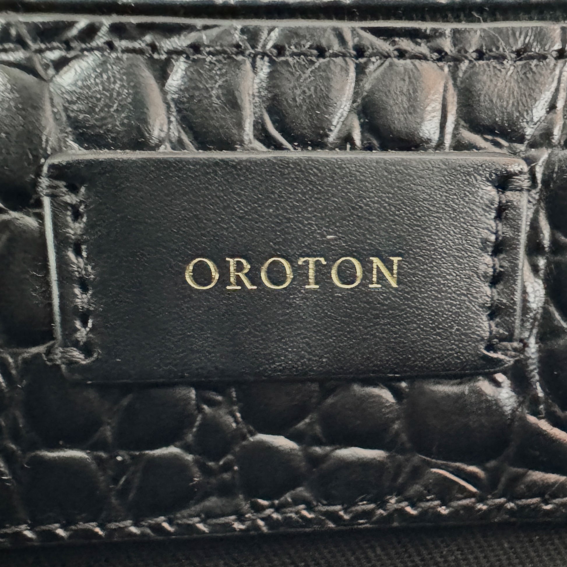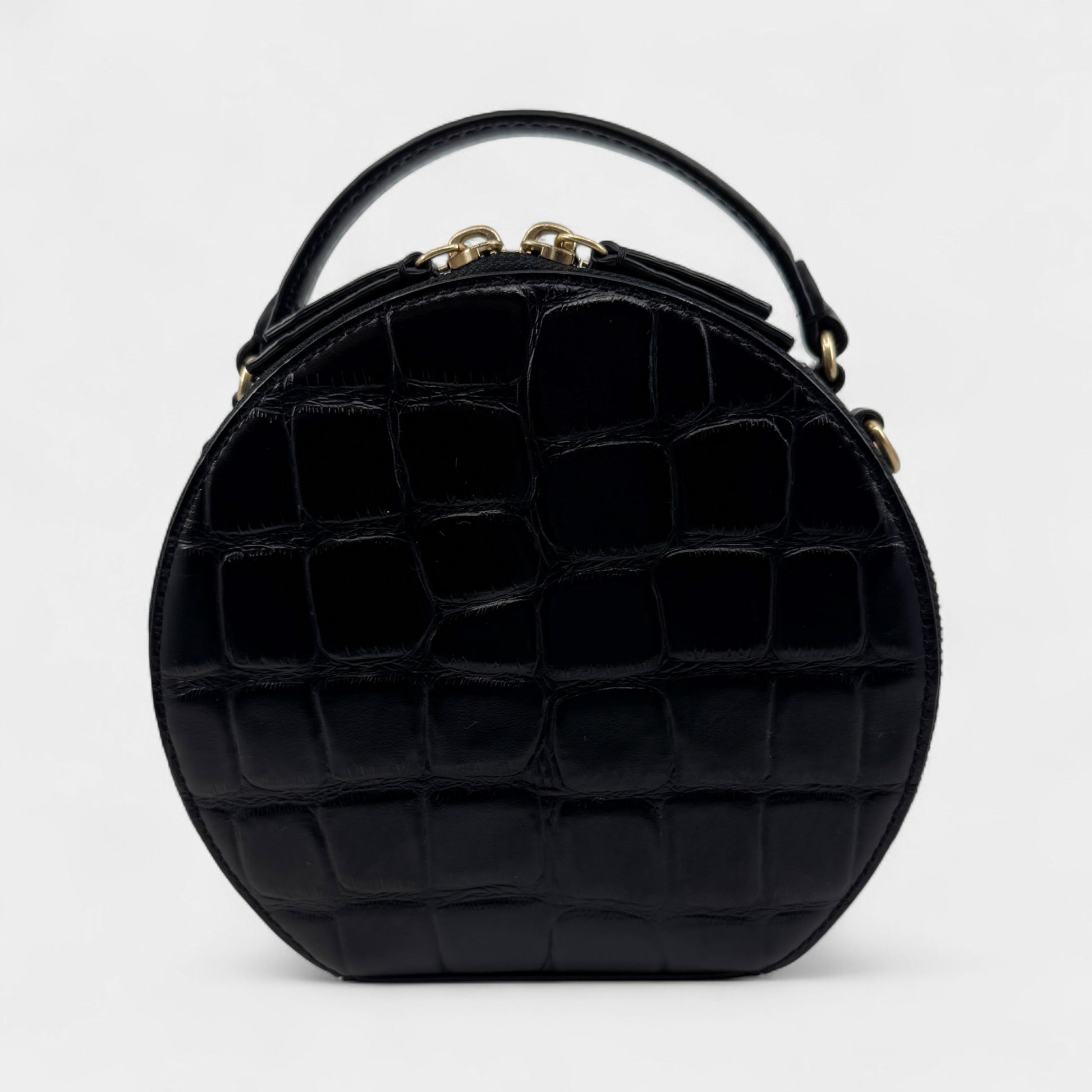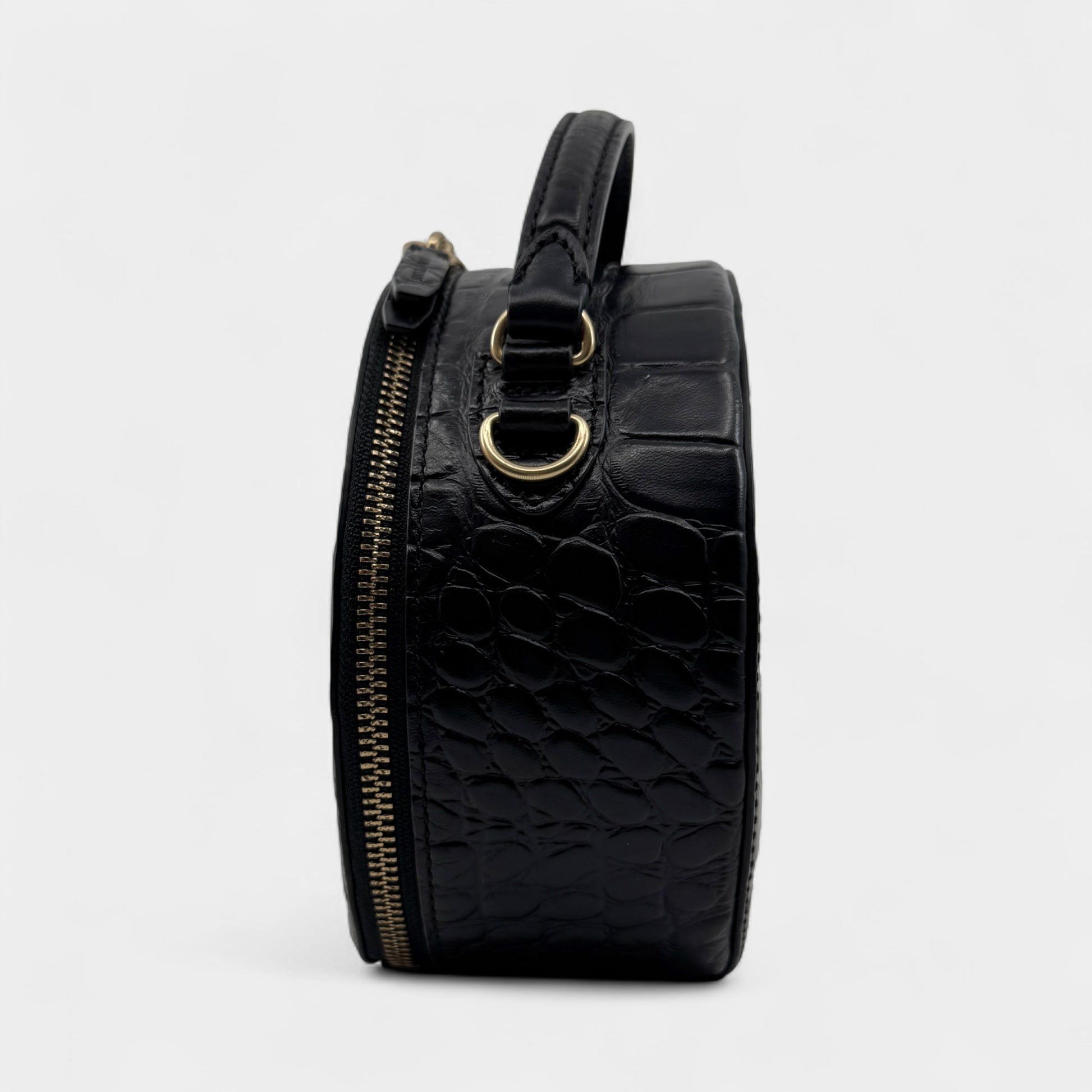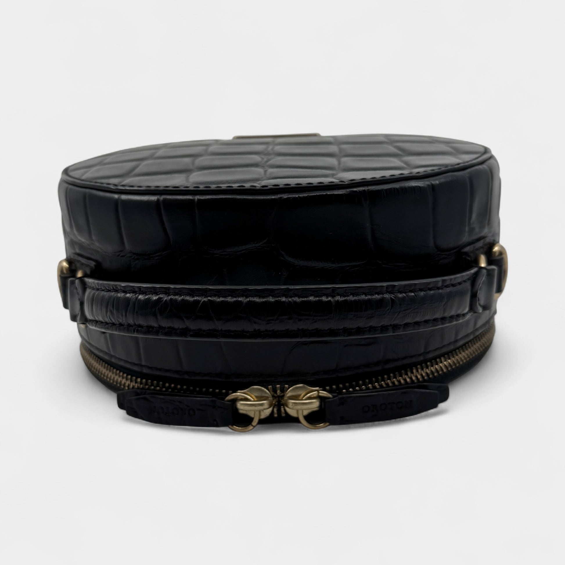 Details: This Oroton limited edition circle bag features sleek black croc embossed leather, numbered 67 of only 80 crafted. A highly sought-after collector’s item, it commemorates 80 years of this much loved Australian brand.