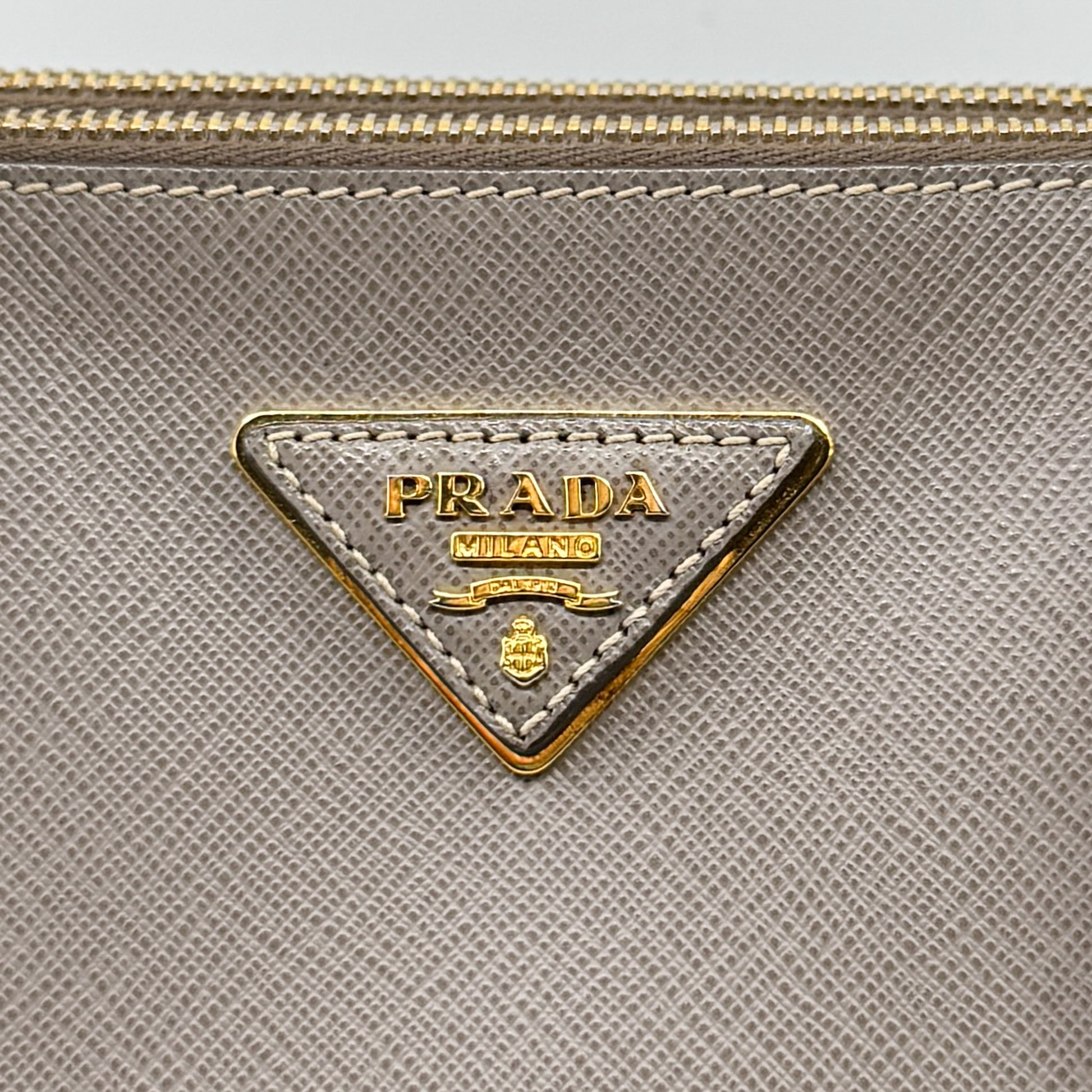 Details: Prada Galleria double zip tote crafted from signature beige-grey Saffiano leather with gold-tone hardware. Features two top zip compartments, a central open compartment with magnetic closure, rolled handles, and protective feet at the base. Fully lined in Prada’s logo jacquard fabric with an interior zip pocket and slip pocket. Includes clochette with keys and Entrupy certificate, no dust bag.