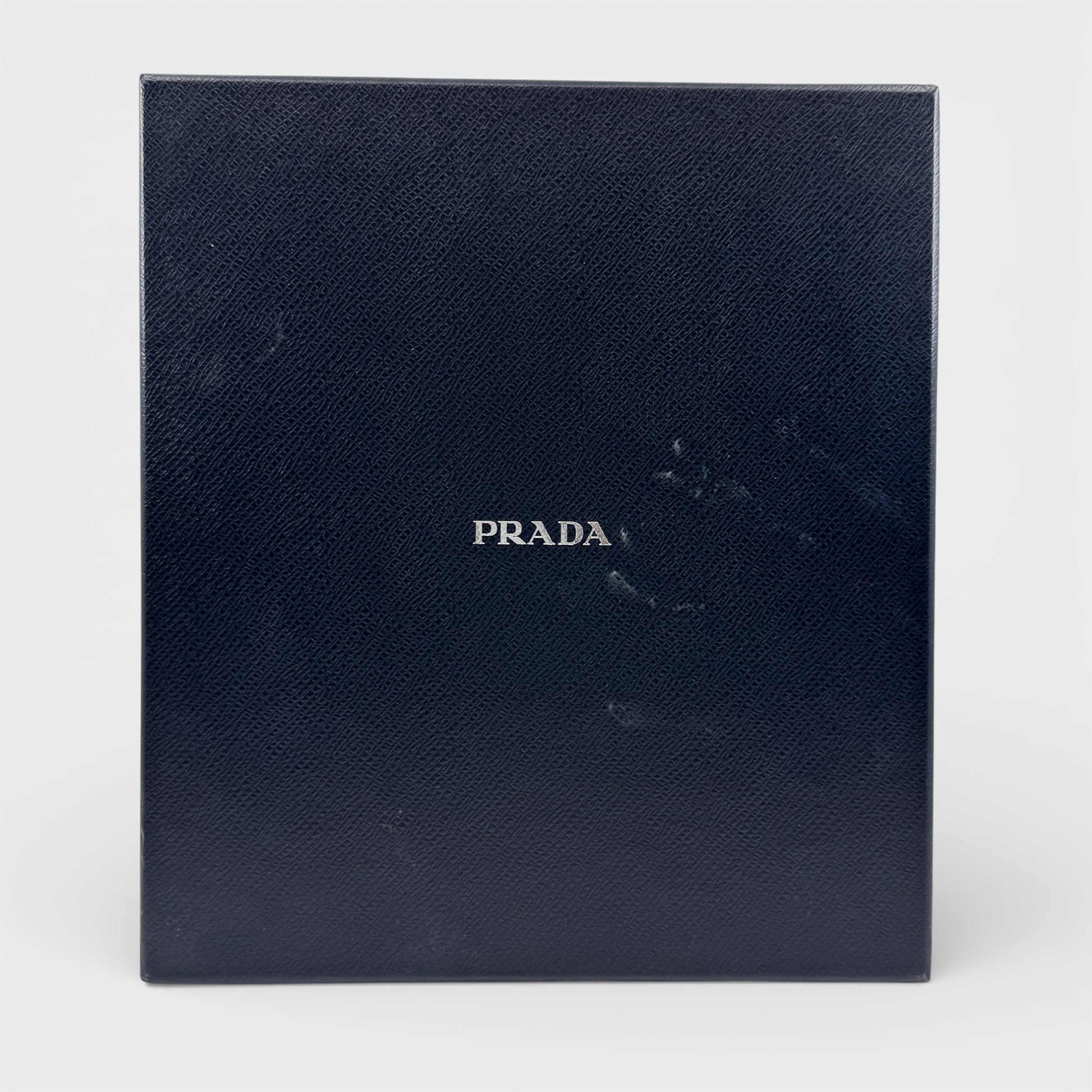 Details: Prada statement necklace featuring faceted blue crystals framed by clear crystals, set into sculptural gunmetal-tone metalwork on organza. A bold runway-style piece with strong architectural presence, finished with a chunky curb-link chain in aged silver-tone metal and a blackened, logo-embossed tongue-and-groove clasp. Includes the original box. Made in Italy. Authenticated in-house by our expert team.