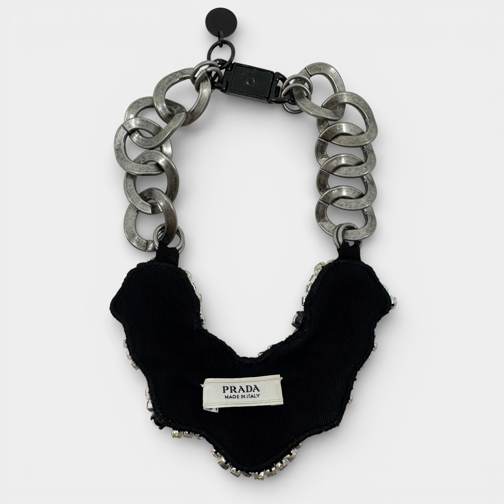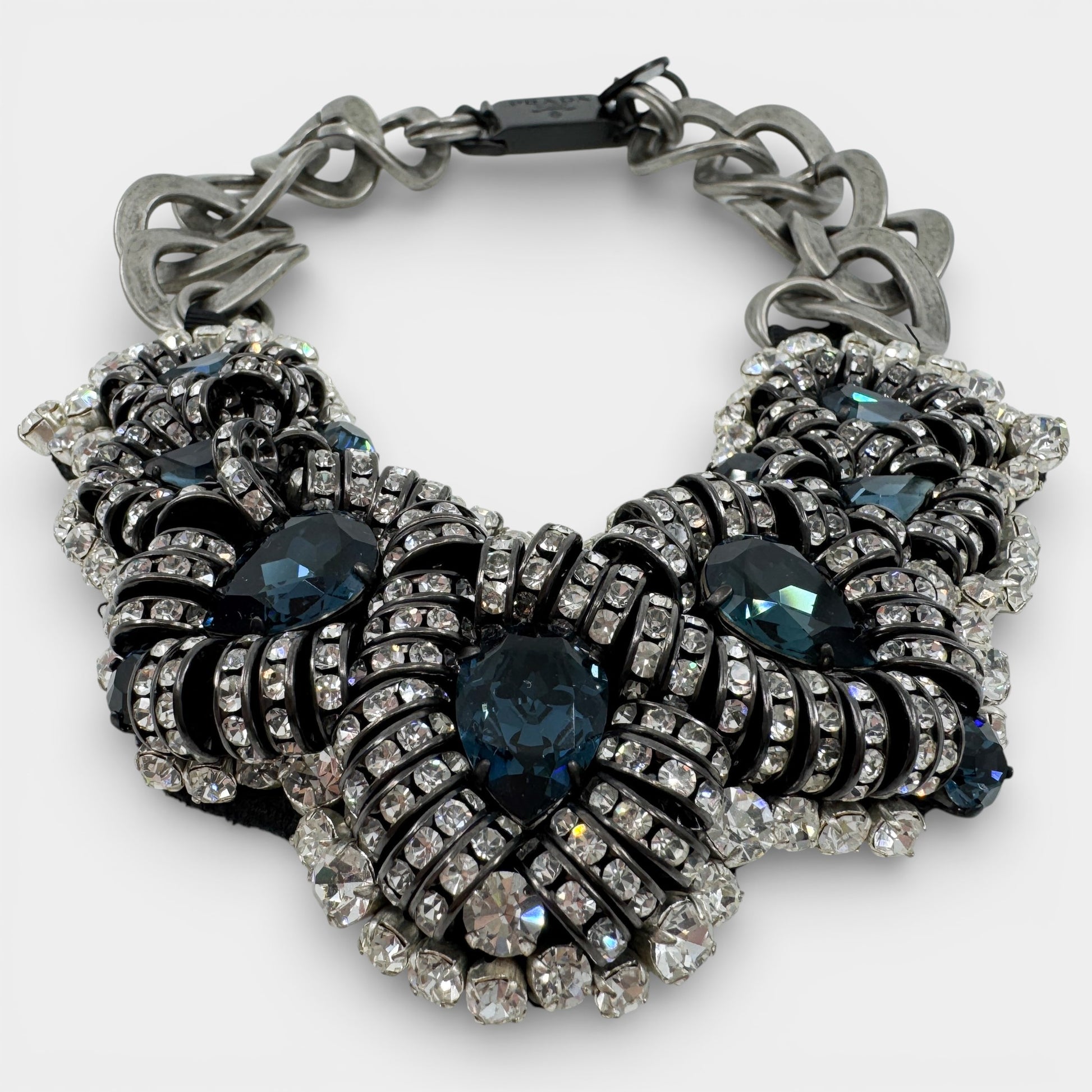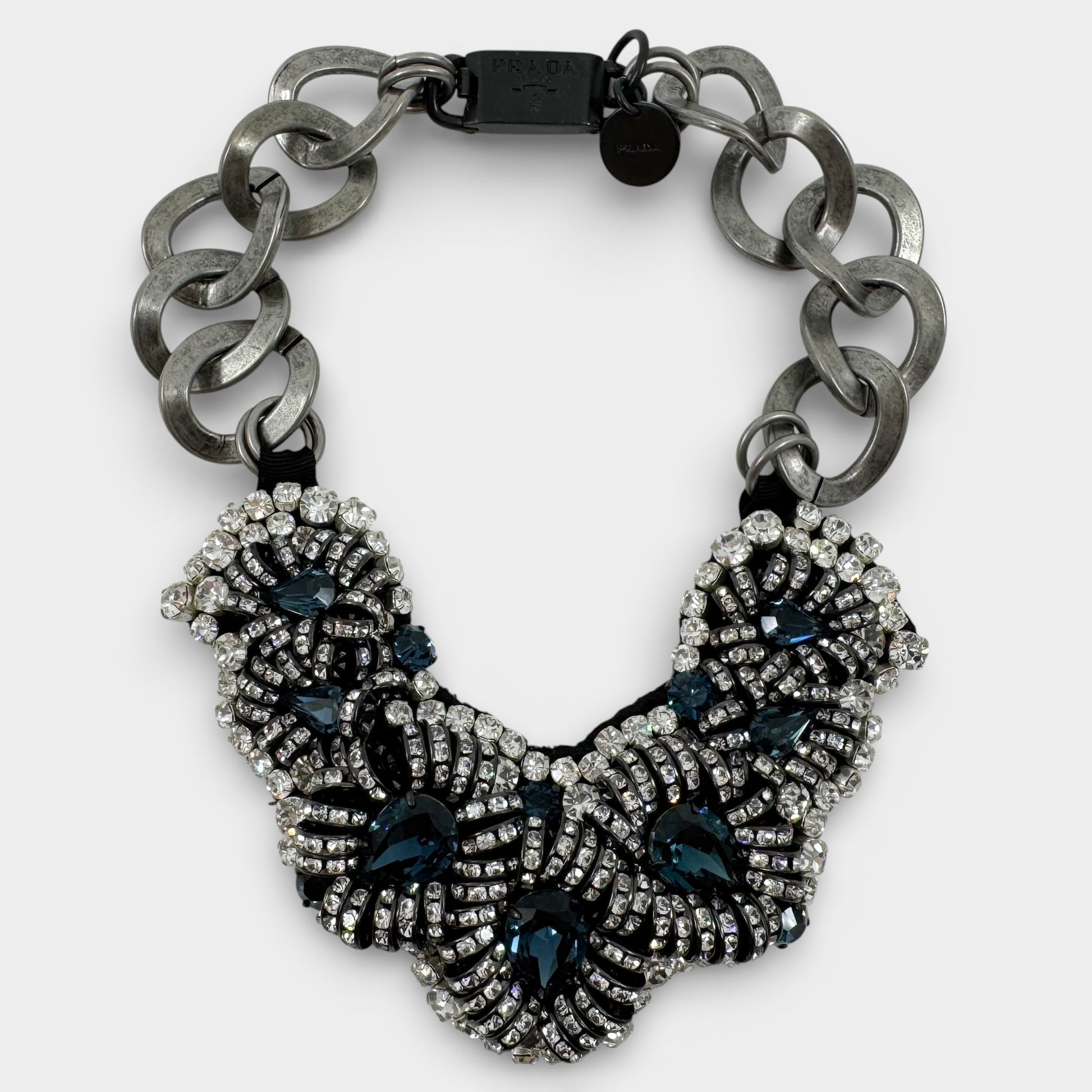 Prada Blue White Crystal Gun Metal Chain Statement Necklace