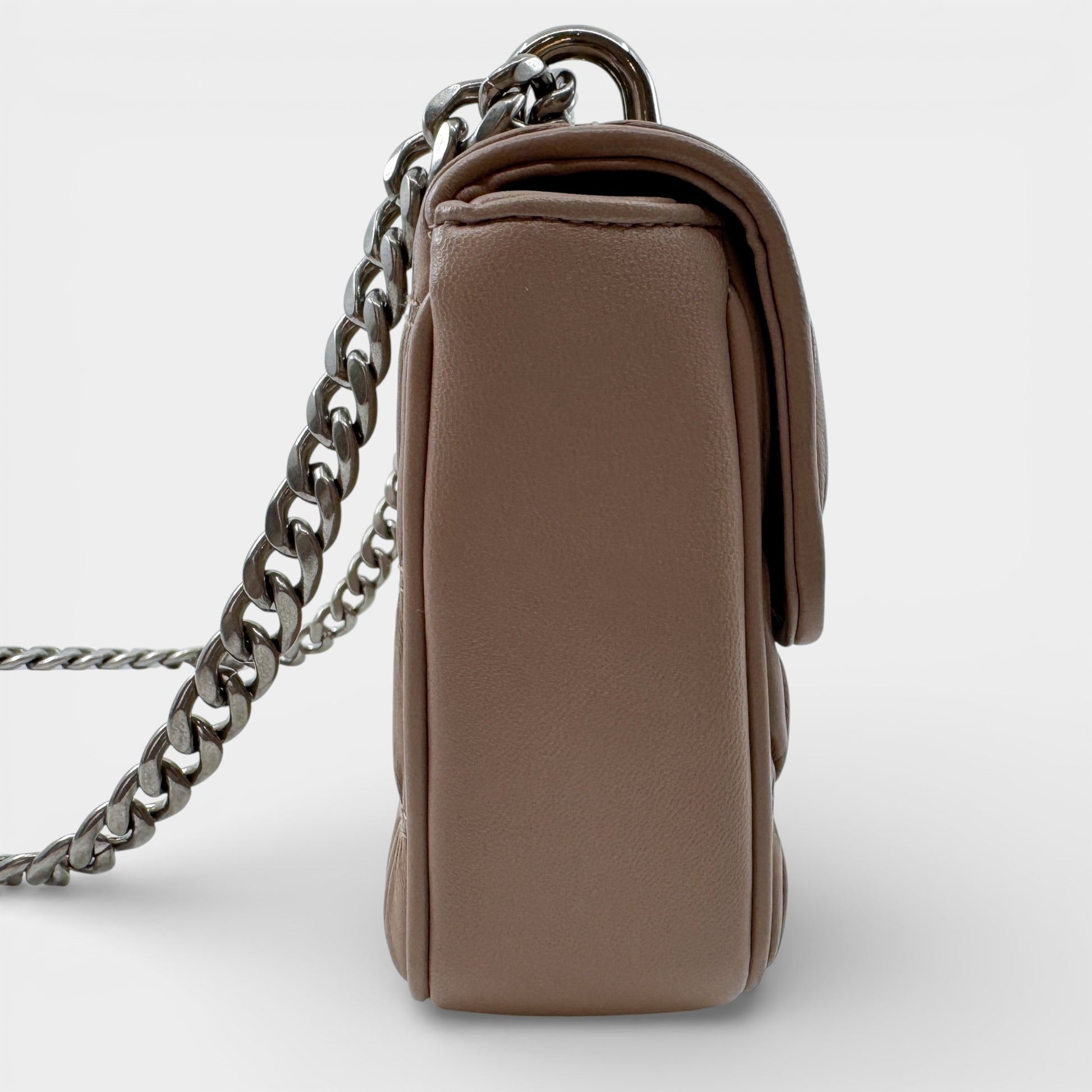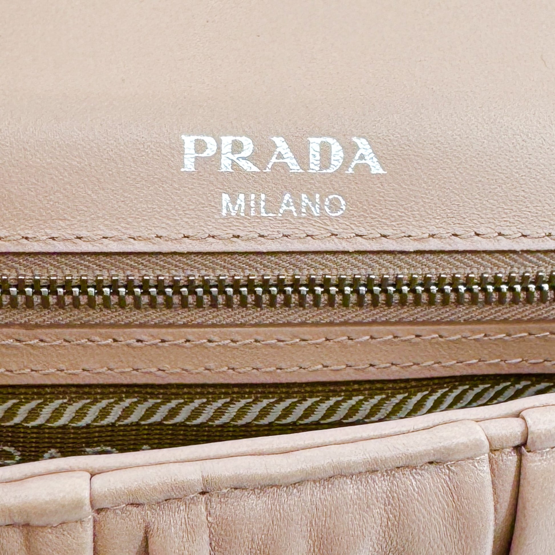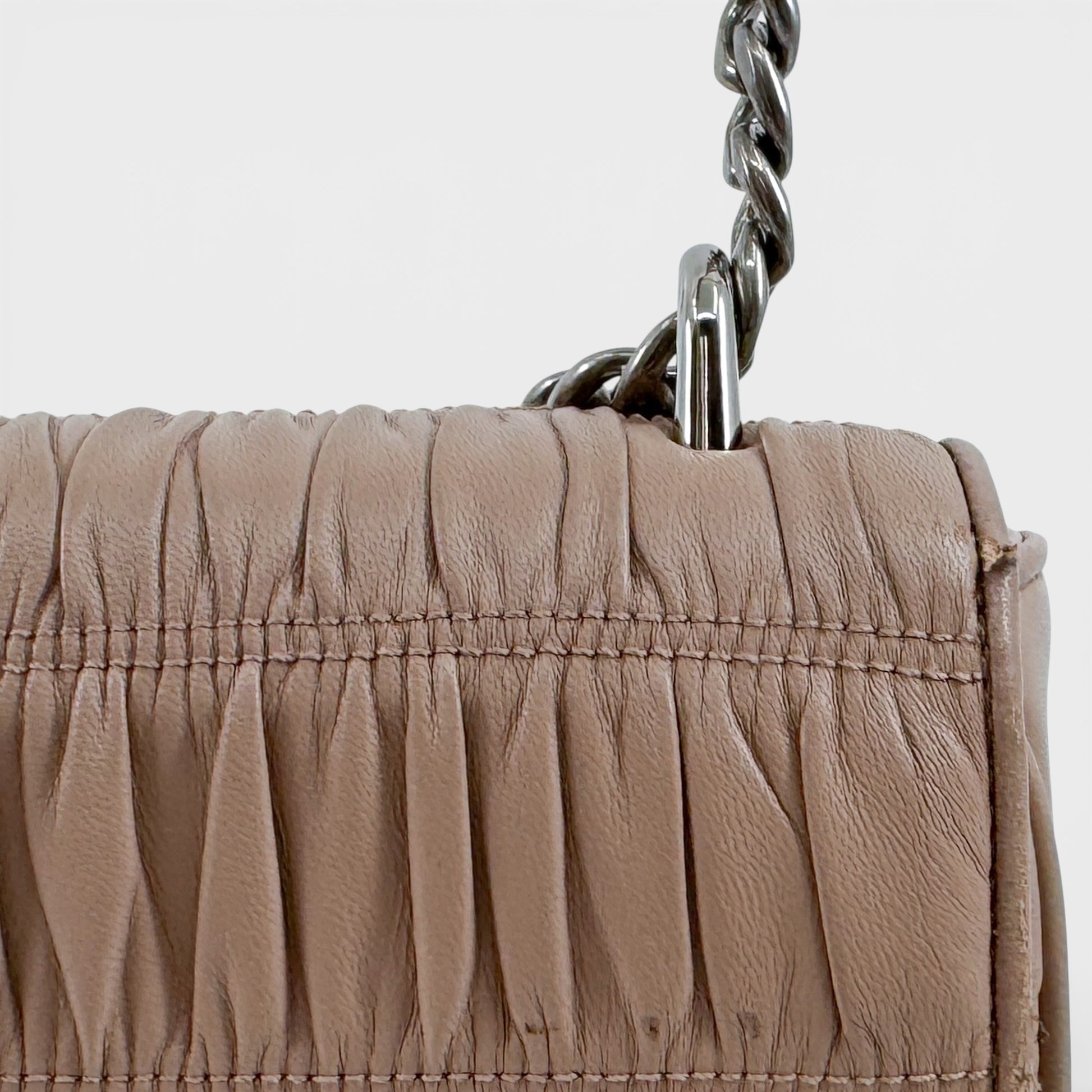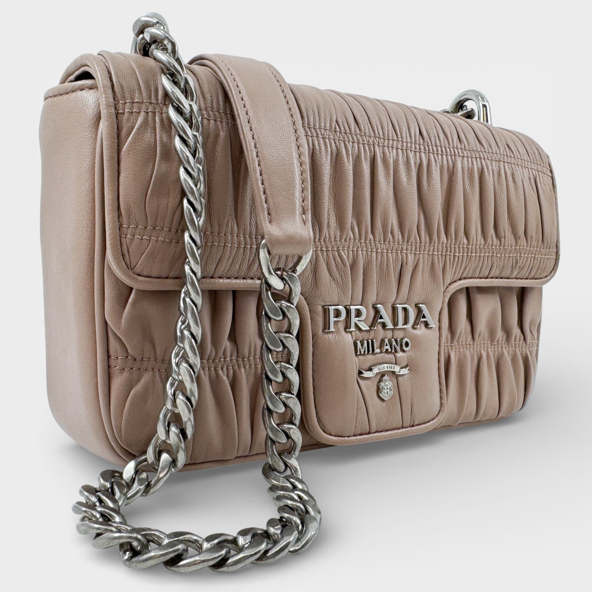 Details & Composition: Butter soft and textural, this Prada shoulder bag features ruched Gaufre leather in a neutral blush pink. Silver tone hardware and a flap closure complete the look with playful femininity.