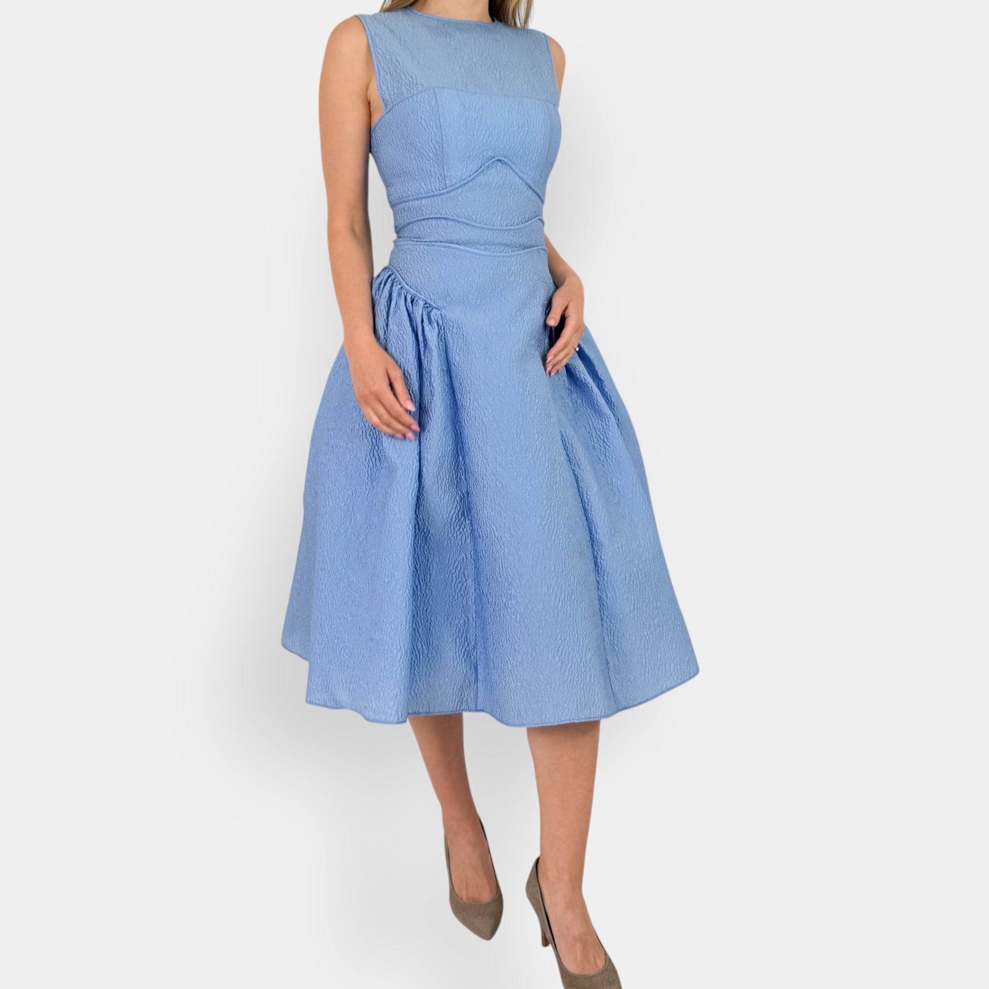 Details: Rachel Gilbert Sophia midi dress in light blue crepe. Features a slim fitting bodice with piping and seam detailing, round neck, sleeveless cut, pleated skirt, and concealed rear zip fastening.