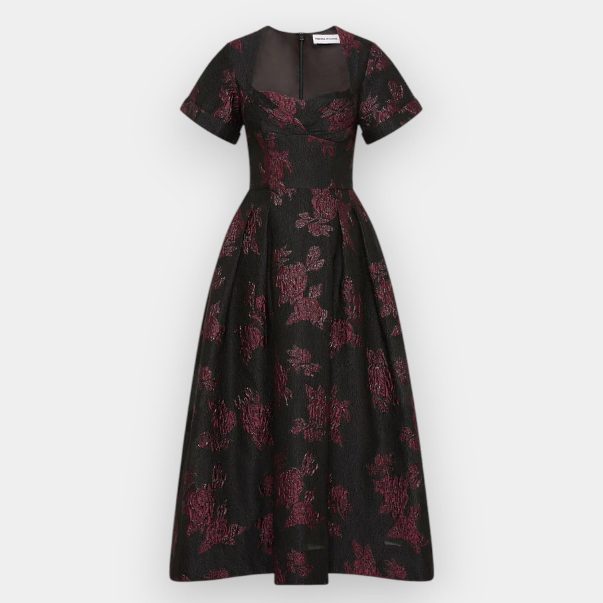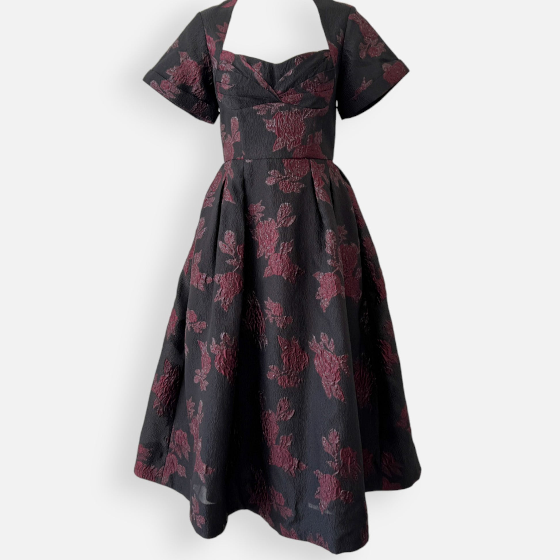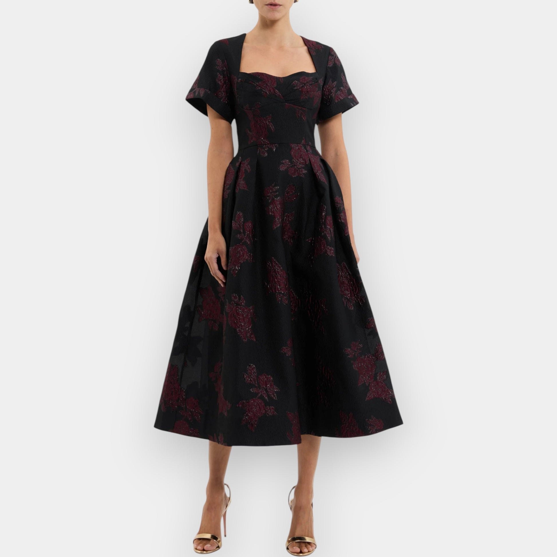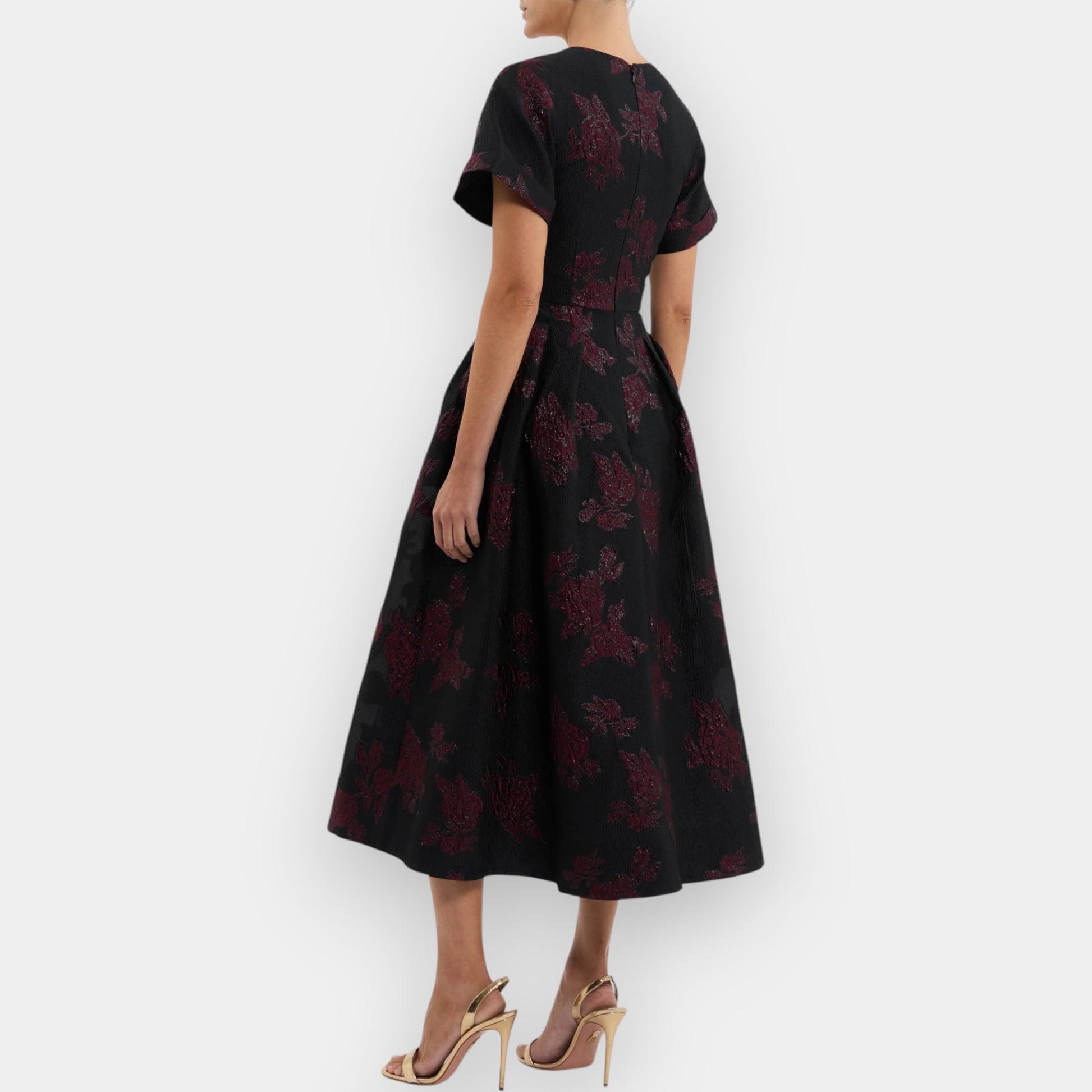 Details: Rebecca Vallance Florentina midi dress in burgundy floral jacquard brocade. Features a sweetheart neckline, fitted bodice with short sleeves, cinched waist, and circular midi skirt with inverted tucks. Finished with an invisible zip closure at the back. Fully lined and designed for a flattering, feminine silhouette.